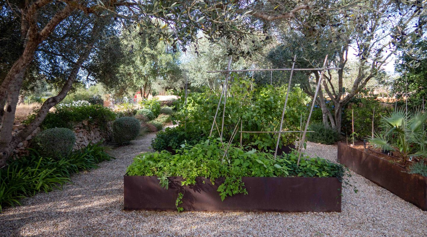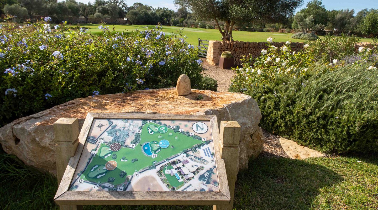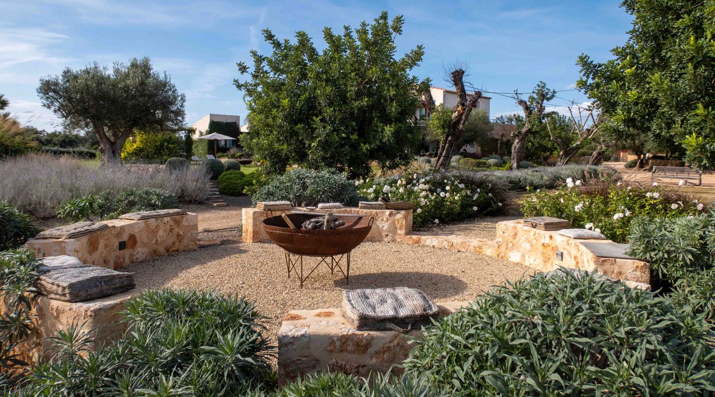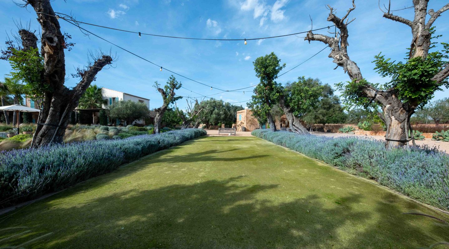 El extenso jardín, diseñado por un reconocido paisajista de la isla, es un auténtico paraíso para los amantes de la naturaleza y el diseño. Vegetación mediterránea y exótica, huertos de frutas y verduras, estanques, iluminación ambiental, zonas de fuego y rincones de descanso crean una atmósfera de armonía y serenidad. Entre sus destacados se incluyen un campo de golf privado de 10.000 m² (con 4 greens, 16 tees, 8 bunkers y una zona de práctica), una piscina climatizada (12,5 m x 3,5 m), una pista de petanca, un parque infantil y amplias zonas de aparcamiento.