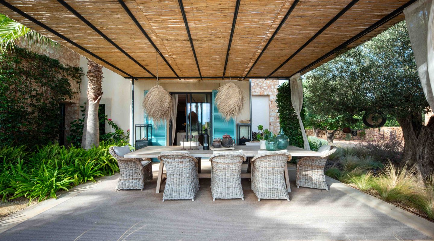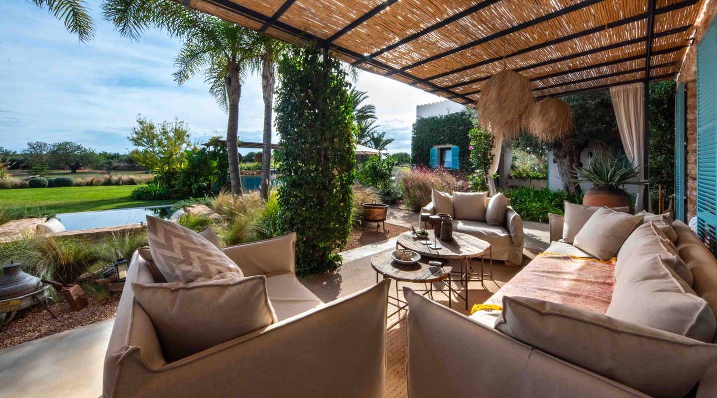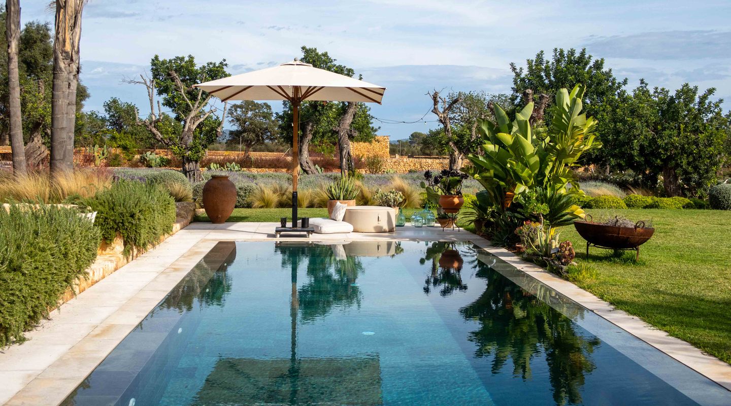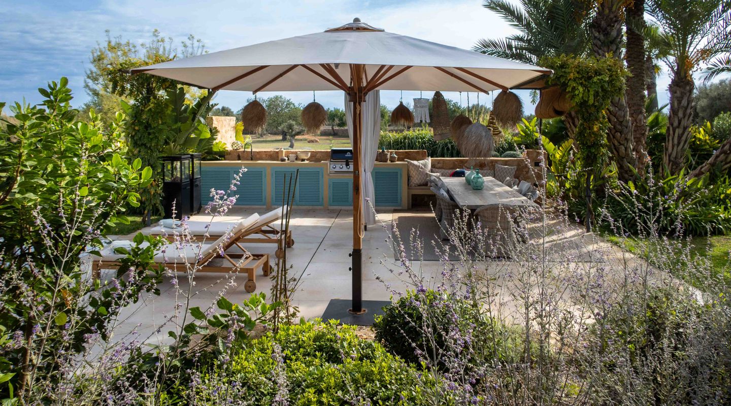 El extenso jardín, diseñado por un reconocido paisajista de la isla, es un auténtico paraíso para los amantes de la naturaleza y el diseño. Vegetación mediterránea y exótica, huertos de frutas y verduras, estanques, iluminación ambiental, zonas de fuego y rincones de descanso crean una atmósfera de armonía y serenidad. Entre sus destacados se incluyen un campo de golf privado de 10.000 m² (con 4 greens, 16 tees, 8 bunkers y una zona de práctica), una piscina climatizada (12,5 m x 3,5 m), una pista de petanca, un parque infantil y amplias zonas de aparcamiento.