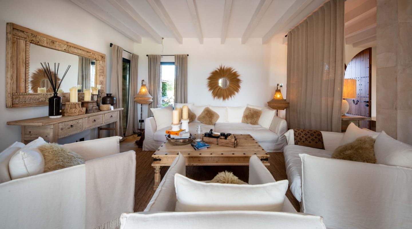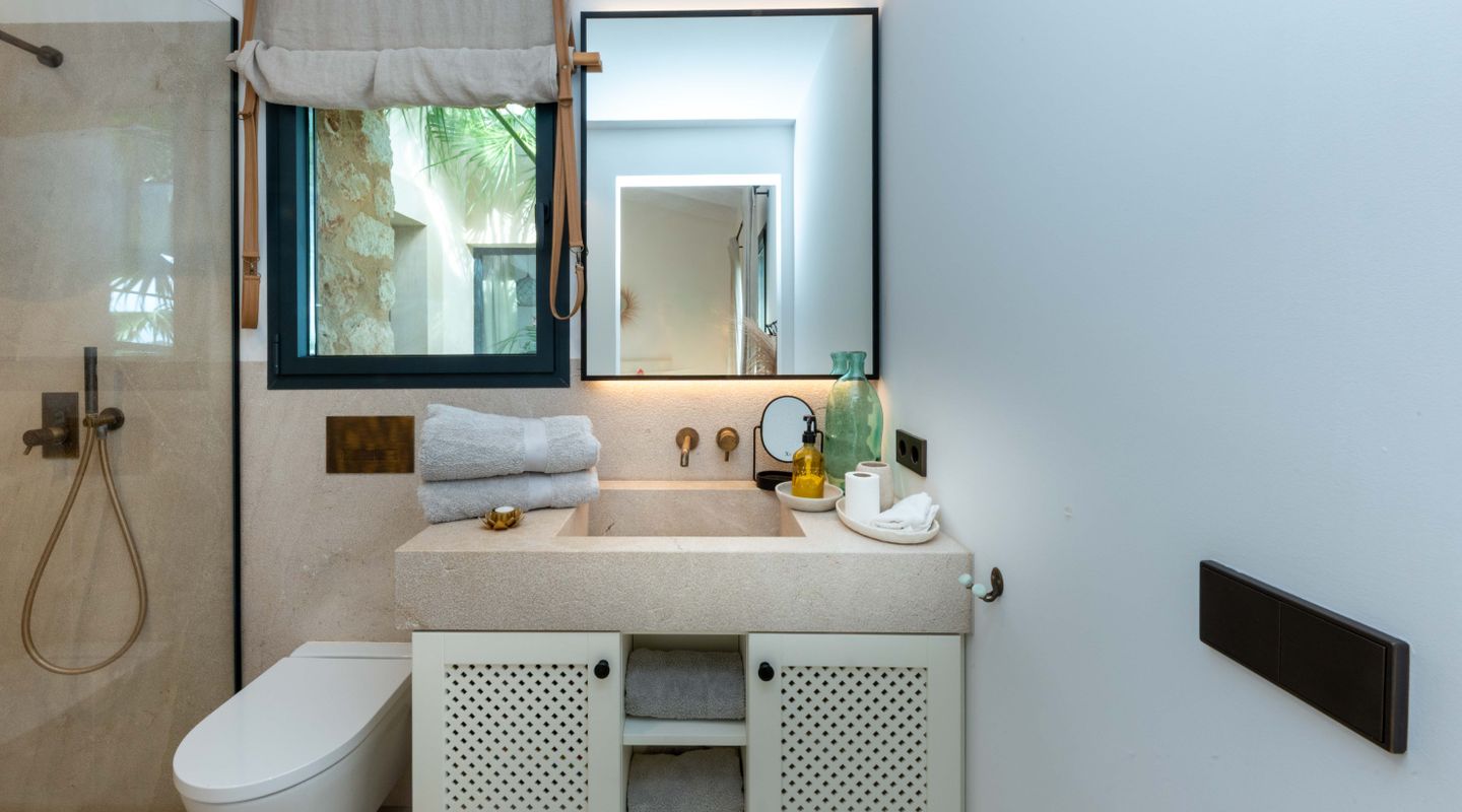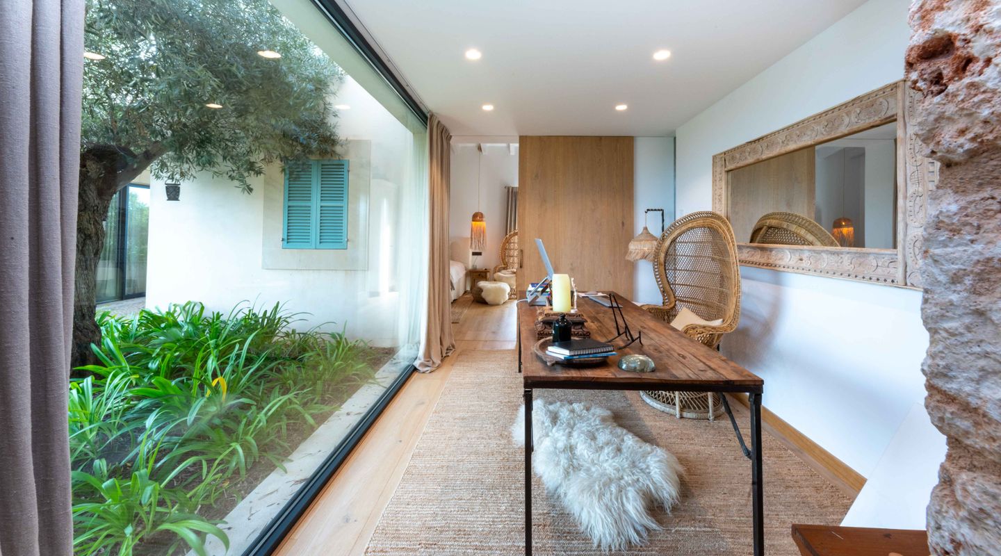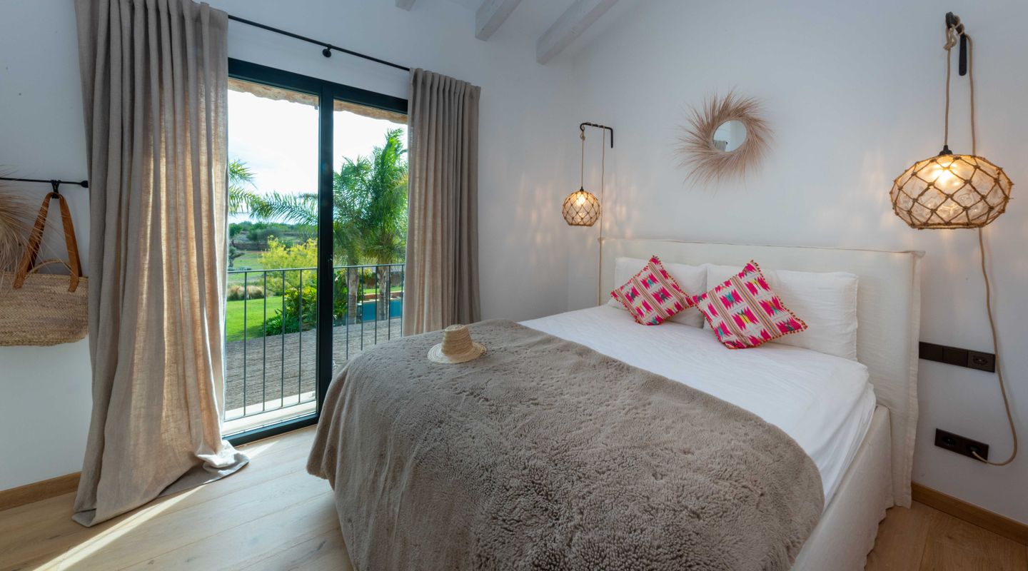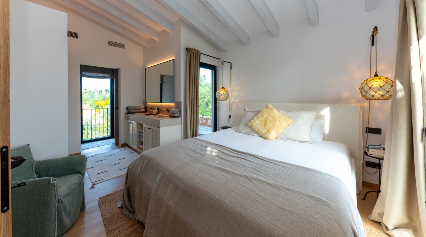 La planta superior alberga dos cómodas suites de invitados, cada una con baño privado y terraza con vistas panorámicas a la finca y a la iglesia de Llucmajor. Un tercer dormitorio con baño en suite completa la distribución. Cerca de la casa principal se encuentra una casa de invitados independiente con baño y terraza, ideal para familiares o amigos.