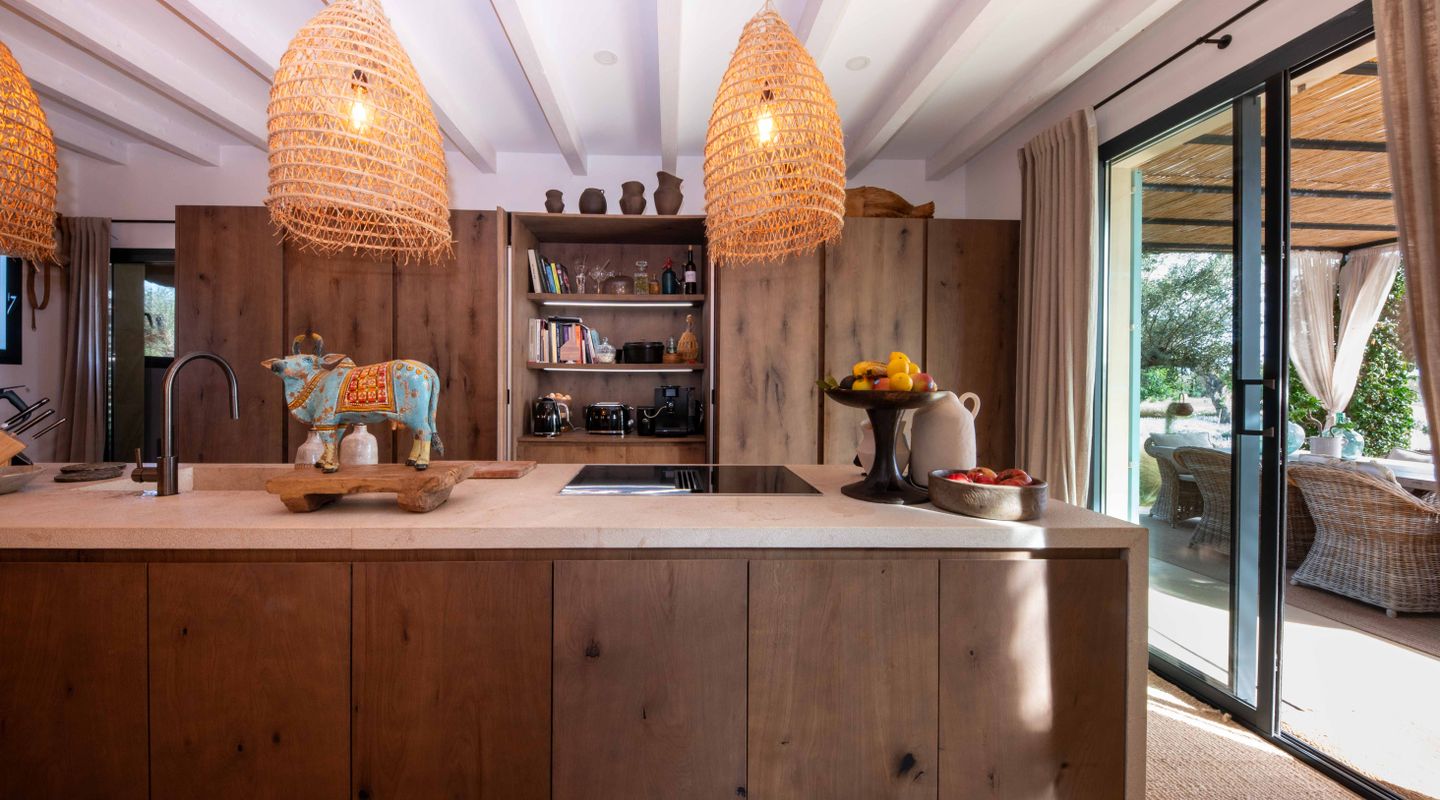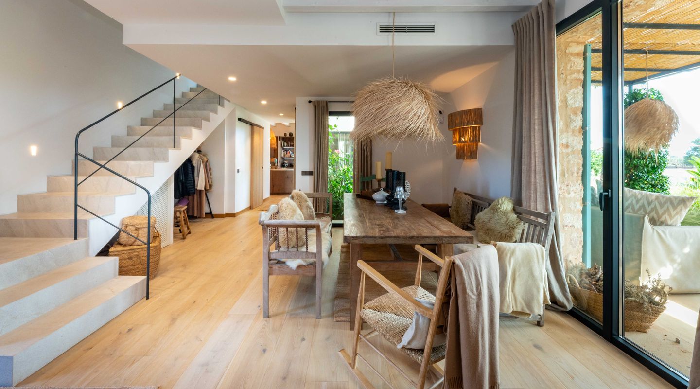 La casa principal se distribuye en dos plantas y destaca por su amplitud y armonía. En la planta baja encontramos un amplio salón con chimenea, un luminoso comedor y una cocina de alta gama con isla central y acceso a varias terrazas. Esta planta incluye además una lavandería, aseo de invitados, despacho con vistas al jardín y la suite principal con vestidor, baño en suite, ducha exterior y terraza cubierta con sala adicional.