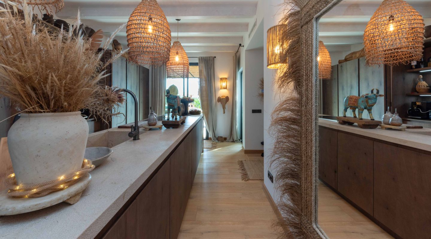 La propiedad es autosuficiente en energía: dispone de pozo propio (con permiso para un segundo pozo), paneles solares y baterías de litio de 200 kWh. En el interior, los suelos de madera y los baños de piedra natural aportan elegancia atemporal. Suelo radiante, aire acondicionado, descalcificador y equipamiento de primera garantizan el máximo confort. Una zona adicional ofrece usos versátiles, como gimnasio, sauna, despacho o dormitorio extra.