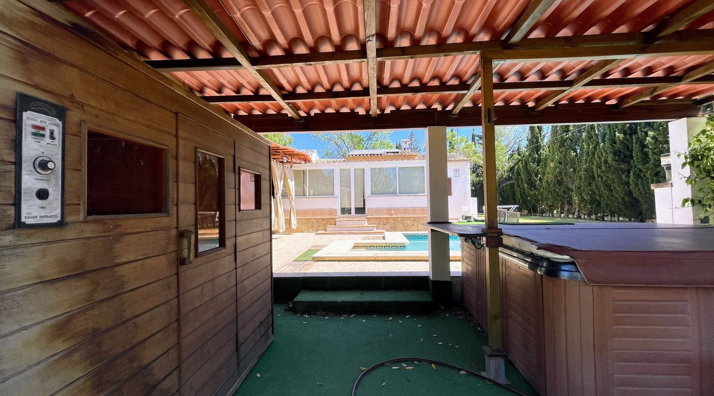 El santuario exterior es el epítome de la relajación, con piscina, jacuzzi y sauna, un refugio perfecto para desconectar y rejuvenecer. Un práctico estudio para invitados con su propio cuarto de baño ofrece versatilidad, mientras que la terraza cubierta con zona de barbacoa invita a comer y entretenerse al aire libre.