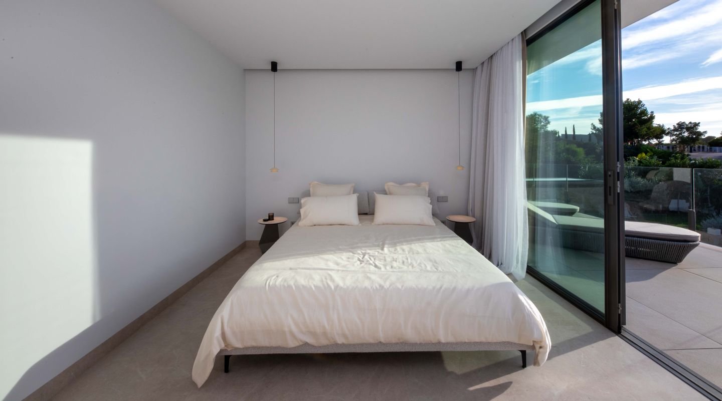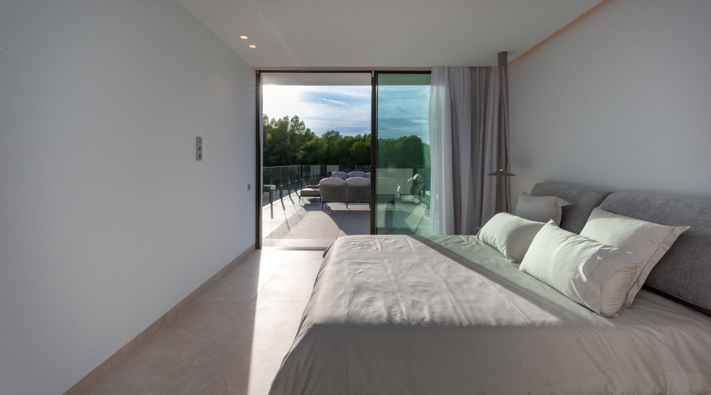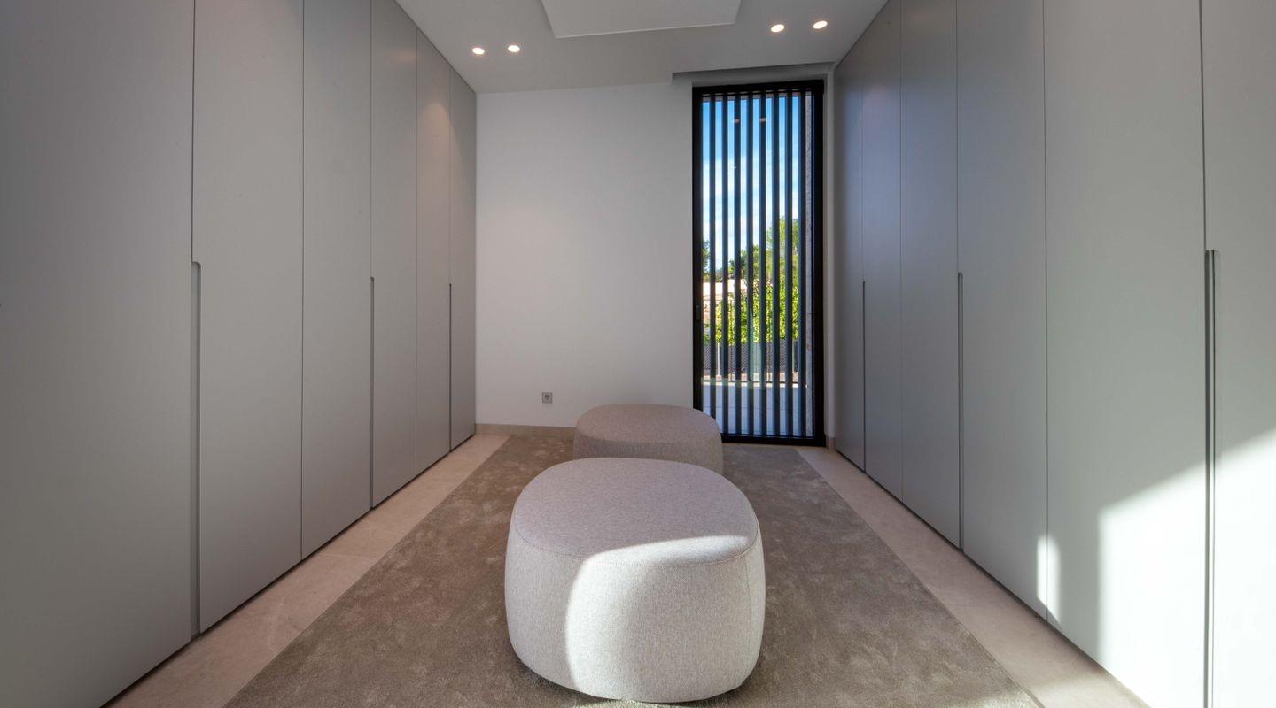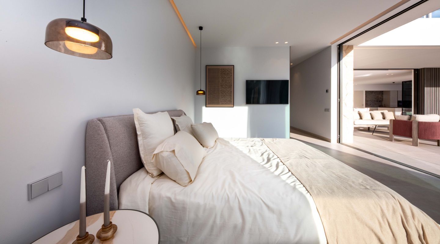 La planta superior alberga tres elegantes dormitorios, cada uno con su propio baño en suite y terraza privada. La suite principal impresiona con un lujoso baño, un amplio vestidor y una exclusiva terraza con ducha exterior. Un patio interior cubierto y el acceso al salón de la azotea contribuyen al ambiente sereno y privado de la villa.