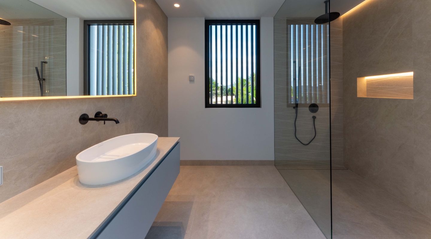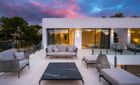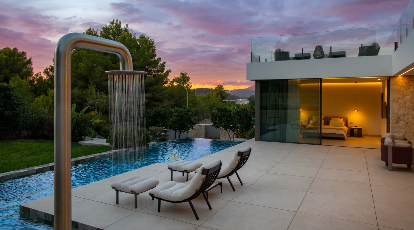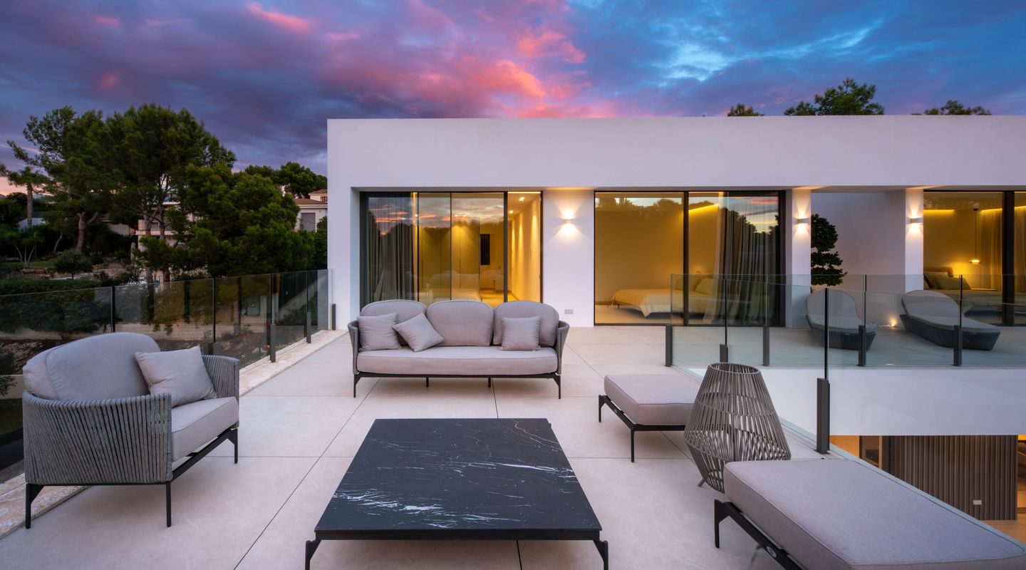 La planta superior alberga tres elegantes dormitorios, cada uno con su propio baño en suite y terraza privada. La suite principal impresiona con un lujoso baño, un amplio vestidor y una exclusiva terraza con ducha exterior. Un patio interior cubierto y el acceso al salón de la azotea contribuyen al ambiente sereno y privado de la villa.