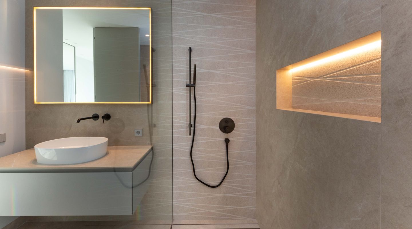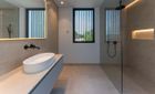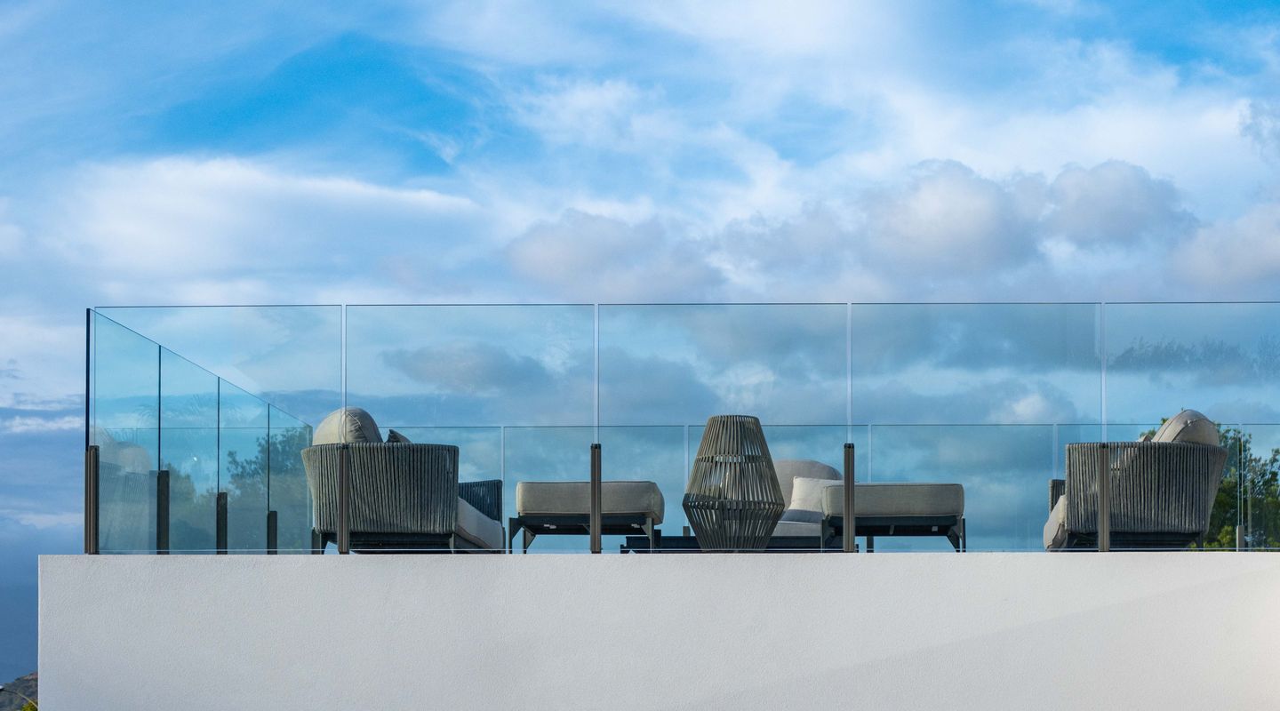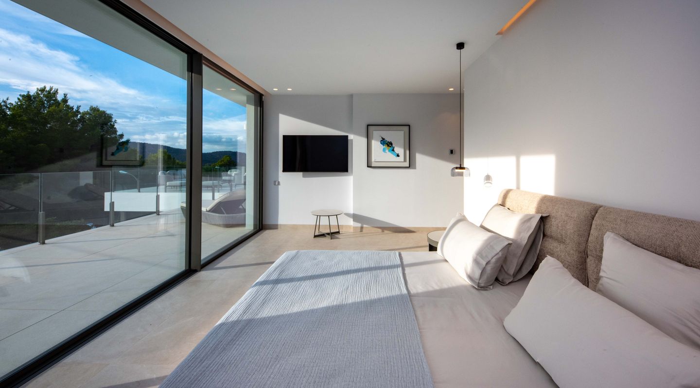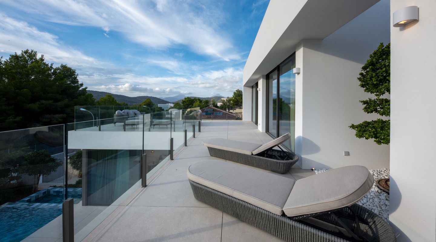 La planta superior alberga tres elegantes dormitorios, cada uno con su propio baño en suite y terraza privada. La suite principal impresiona con un lujoso baño, un amplio vestidor y una exclusiva terraza con ducha exterior. Un patio interior cubierto y el acceso al salón de la azotea contribuyen al ambiente sereno y privado de la villa.