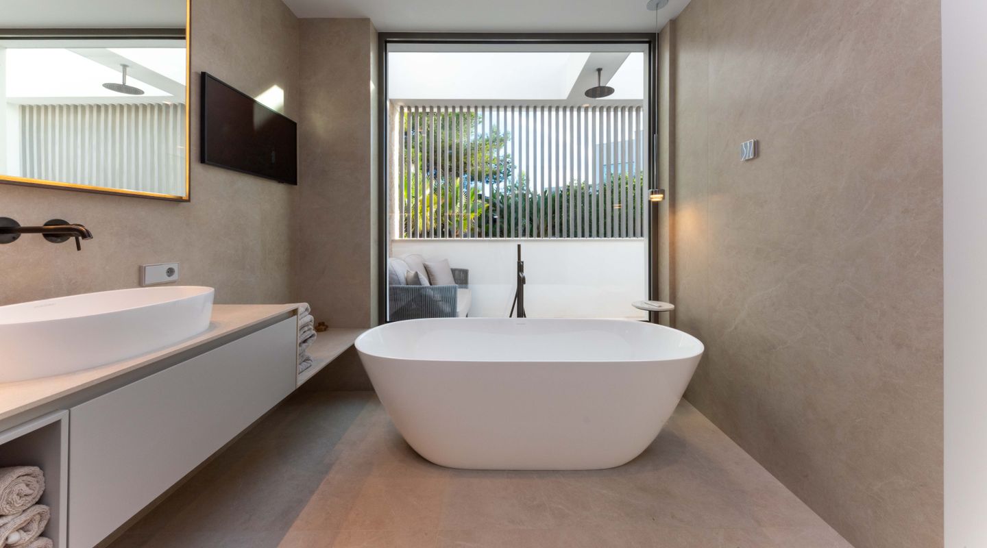 La planta baja le da la bienvenida con un amplio salón, comedor y cocina de planta abierta, con una cocina independiente, un aseo de invitados y un dormitorio con vestidor y baño en suite. Los ventanales de suelo a techo conectan a la perfección el interior con la hermosa zona exterior ajardinada, donde una gran piscina, elegantes zonas de salón y comedor, una zona de barbacoa y un aseo de invitados exterior crean el entorno perfecto para relajarse y disfrutar.