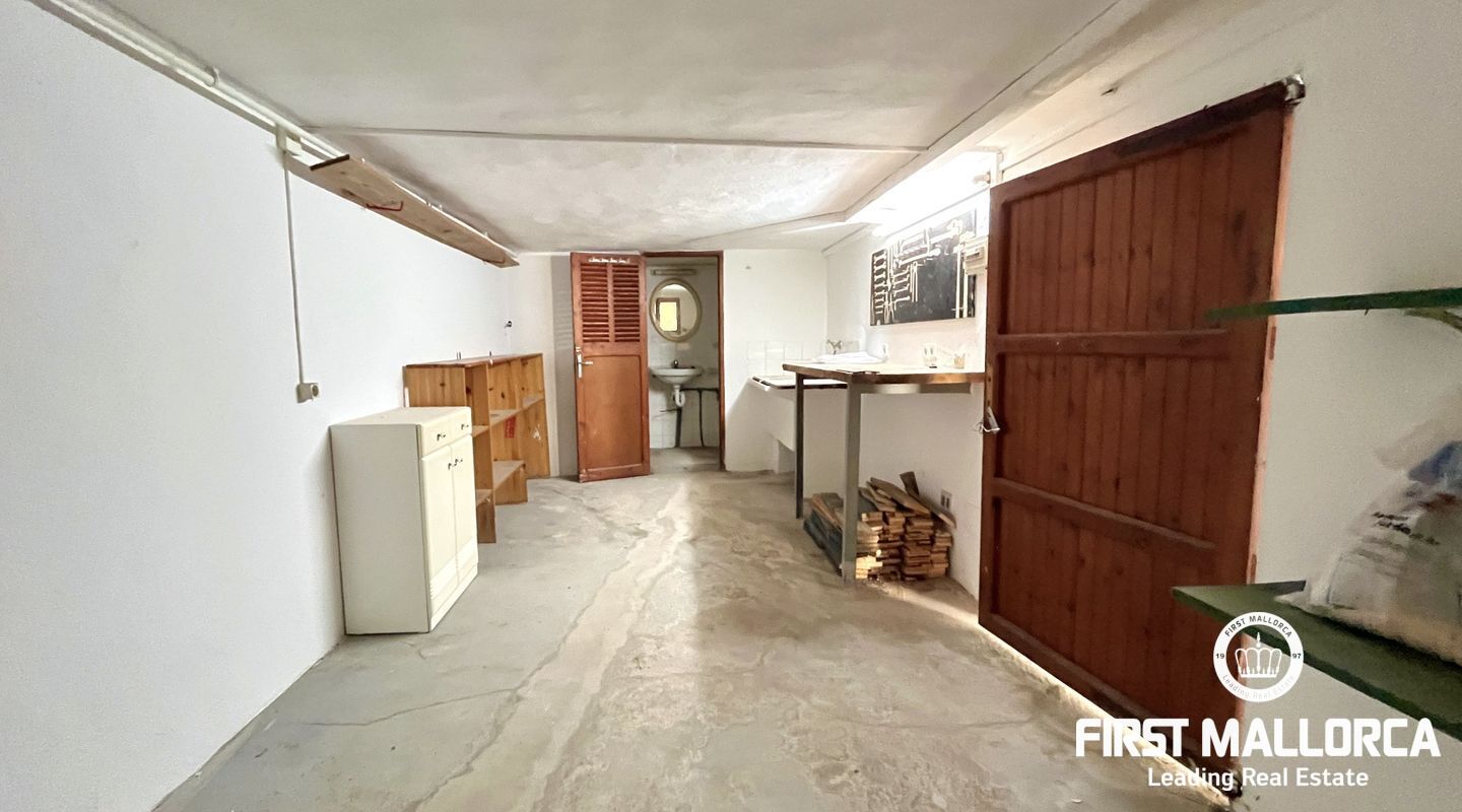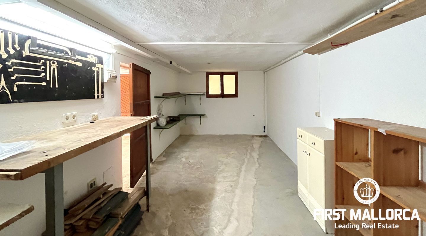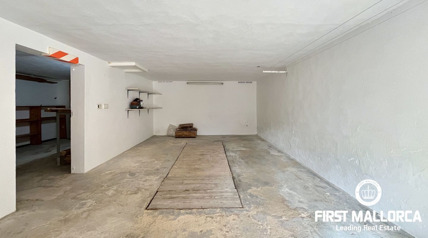 Al acceder a la propiedad, encontramos una zona de terreno privado que da acceso al garaje y a la vivienda, con una escalera exclusiva que conduce a la terraza y a la vivienda. El amplio salón, con un auténtico arco de mármol y ventanas de mosaico, da paso a otra parte del salón desde donde se accede a las tres habitaciones (una de ellas actualmente utilizada como oficina), un baño, un aseo y la cocina con comedor y chimenea de leña. Desde la cocina, se puede acceder a la lavandería. El garaje, de 22,40 m², incluye un espacio adicional de 13 m² que se utilizaba como taller, y dispone de un baño con ducha.