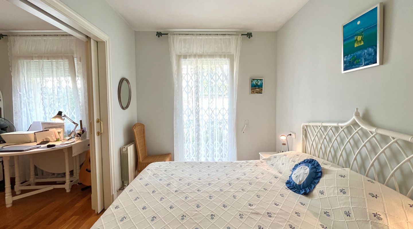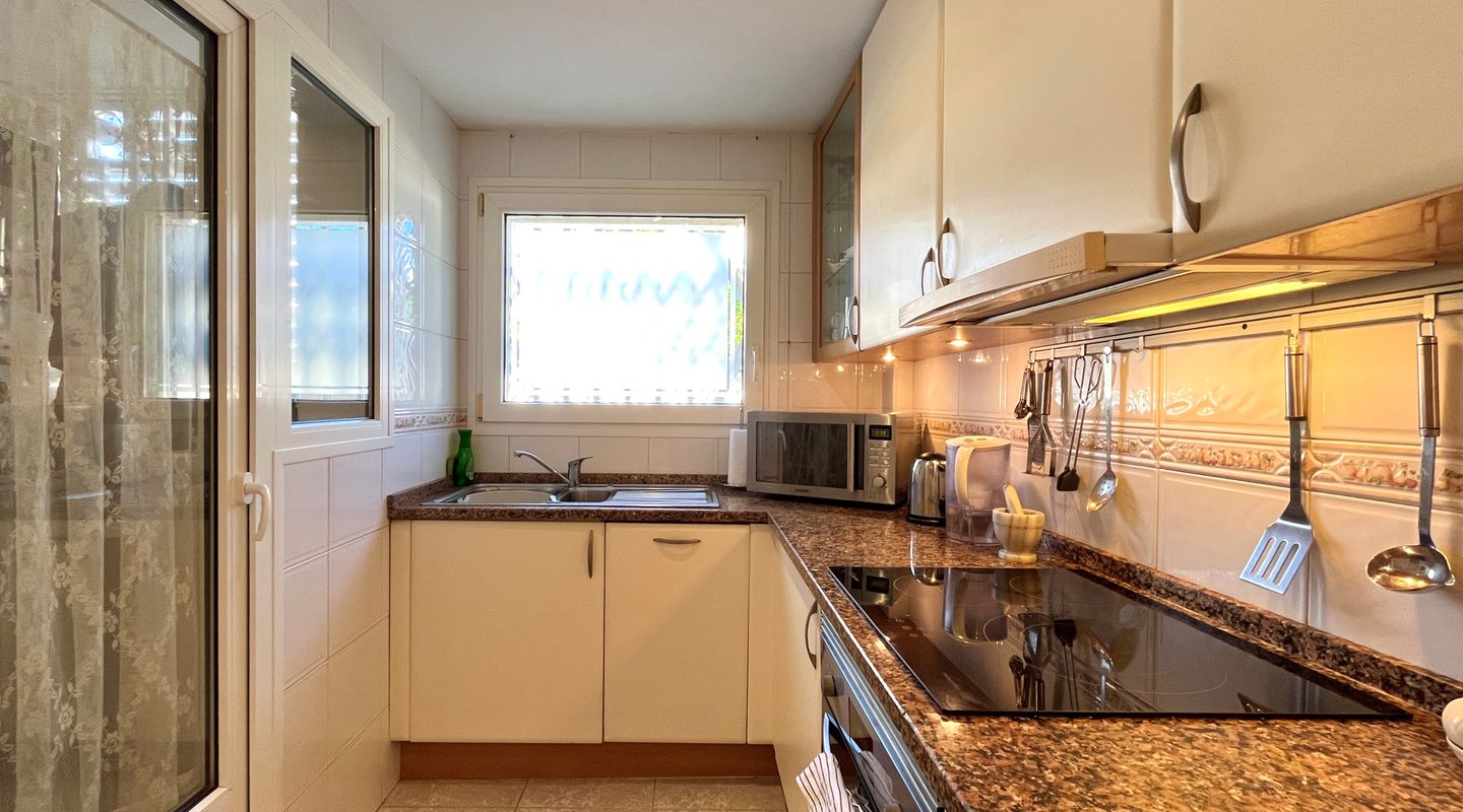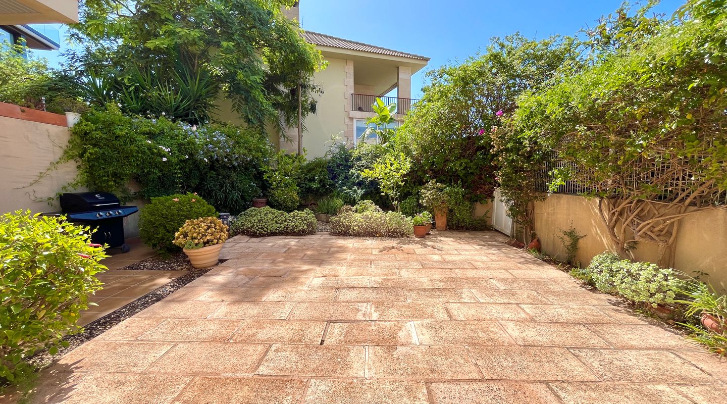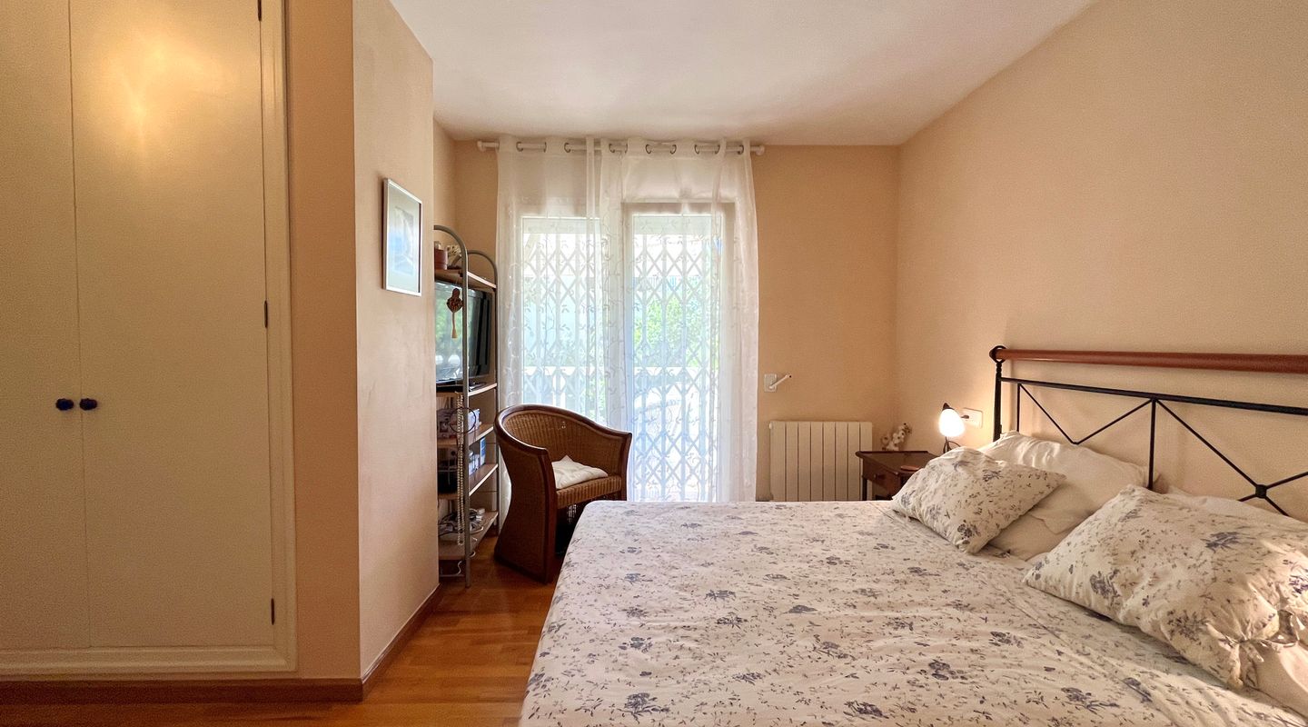 A la izquierda de la entrada se encuentra el salón comedor con salida a la terraza. Desde aquí, unas escaleras llevan al precioso jardín privado de unos 75 m². Una puerta conecta directamente con la piscina comunitaria, lo que permite disfrutar de un baño y volver cómodamente a casa.