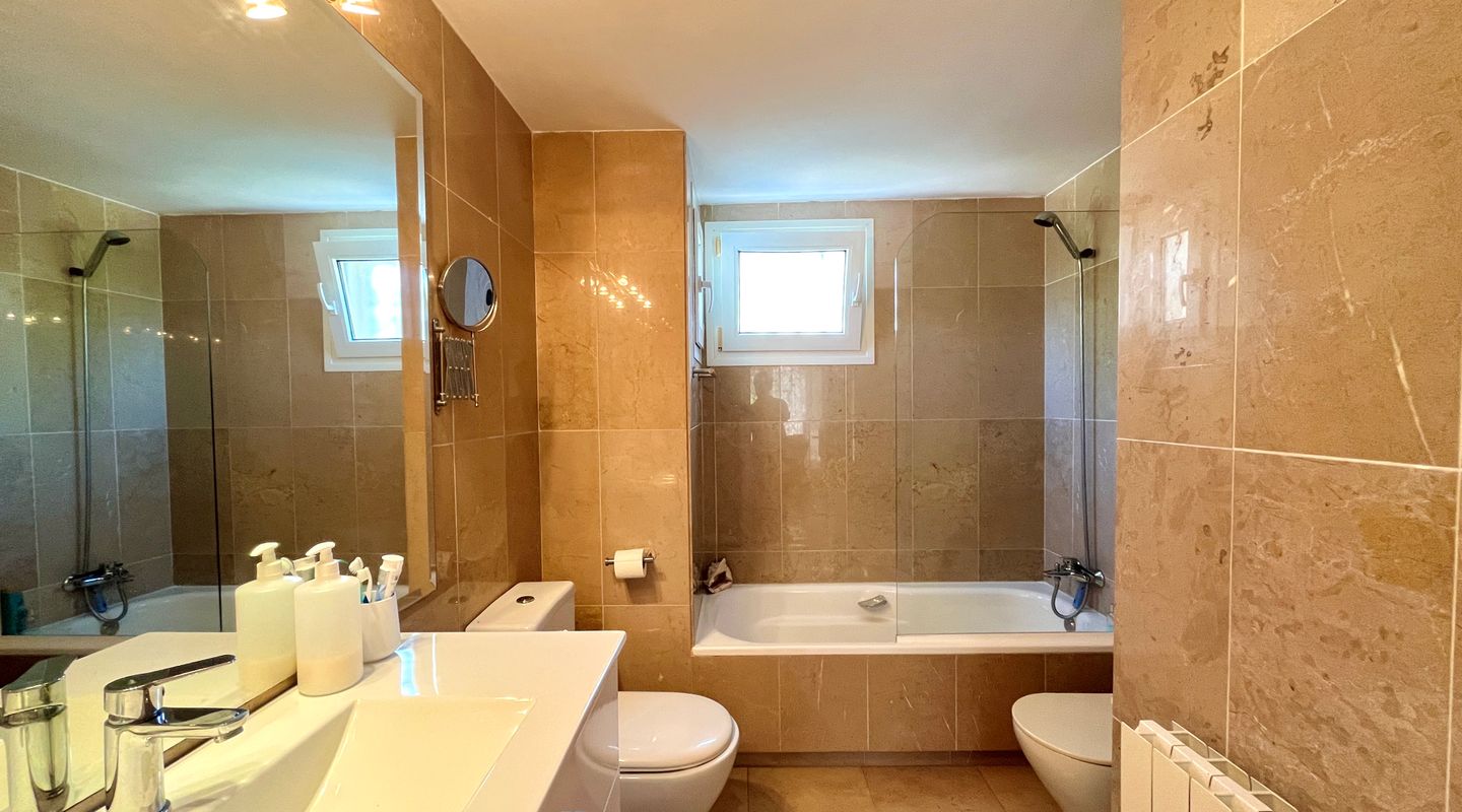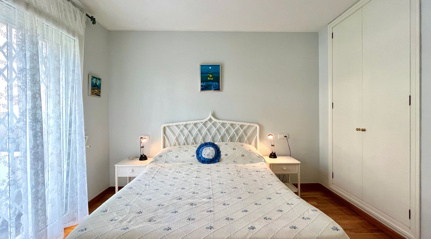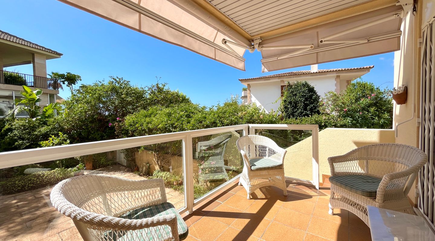 A la izquierda de la entrada se encuentra el salón comedor con salida a la terraza. Desde aquí, unas escaleras llevan al precioso jardín privado de unos 75 m². Una puerta conecta directamente con la piscina comunitaria, lo que permite disfrutar de un baño y volver cómodamente a casa.