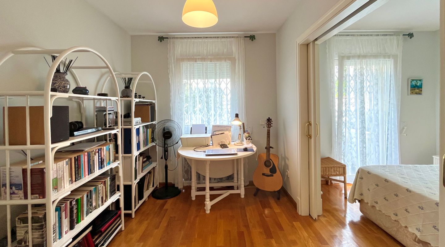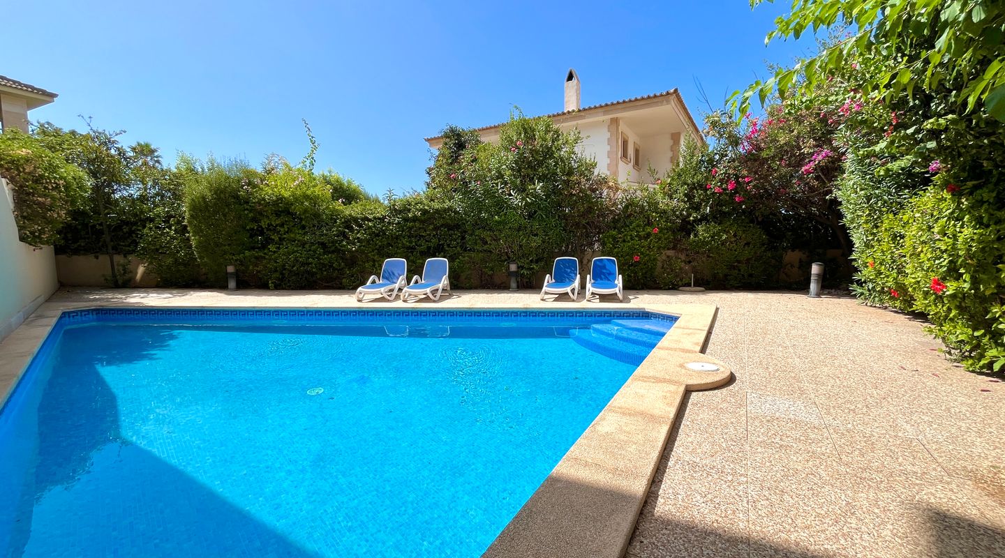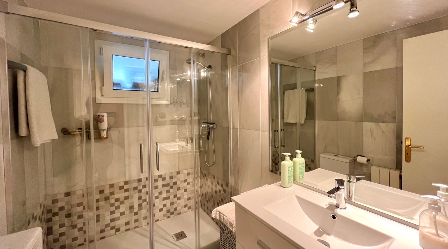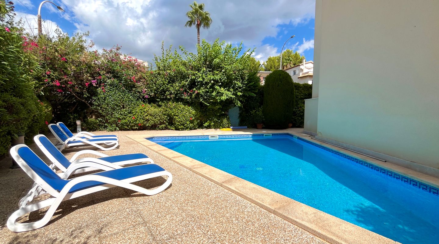A la izquierda de la entrada se encuentra el salón comedor con salida a la terraza. Desde aquí, unas escaleras llevan al precioso jardín privado de unos 75 m². Una puerta conecta directamente con la piscina comunitaria, lo que permite disfrutar de un baño y volver cómodamente a casa.