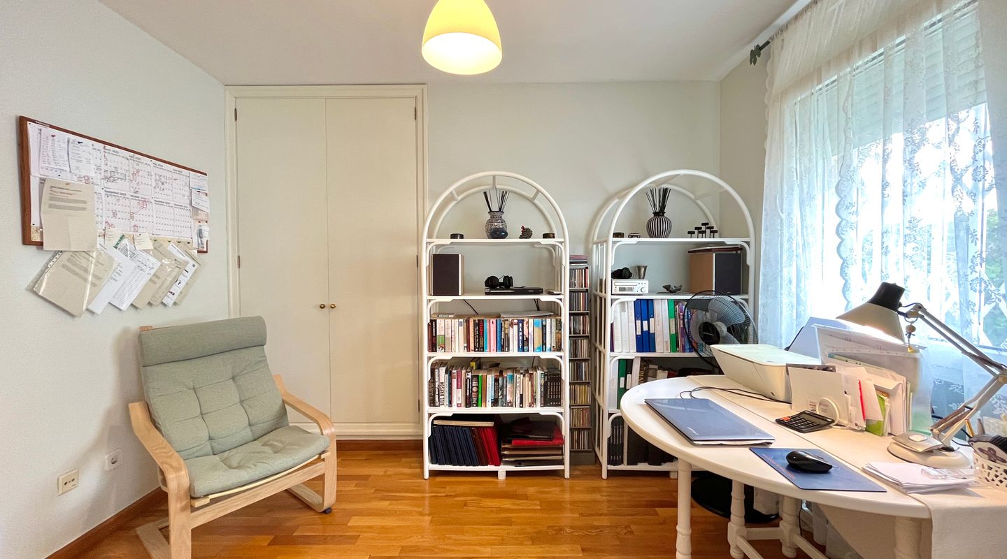 Siguiendo el pasillo se ubican tres dormitorios y dos baños: el dormitorio principal con baño en suite y salida a la terraza, y otros dos dormitorios conectados entre sí por una puerta. Actualmente, uno de ellos se utiliza como oficina, aunque se pueden separar, ya que ambos cuentan con acceso independiente desde el pasillo, donde se encuentra el segundo baño.
