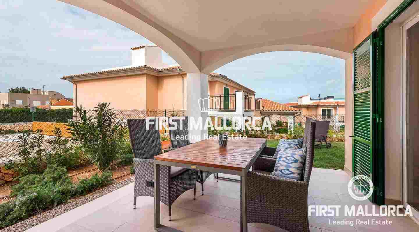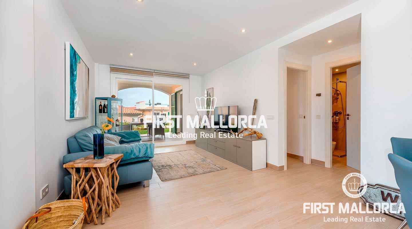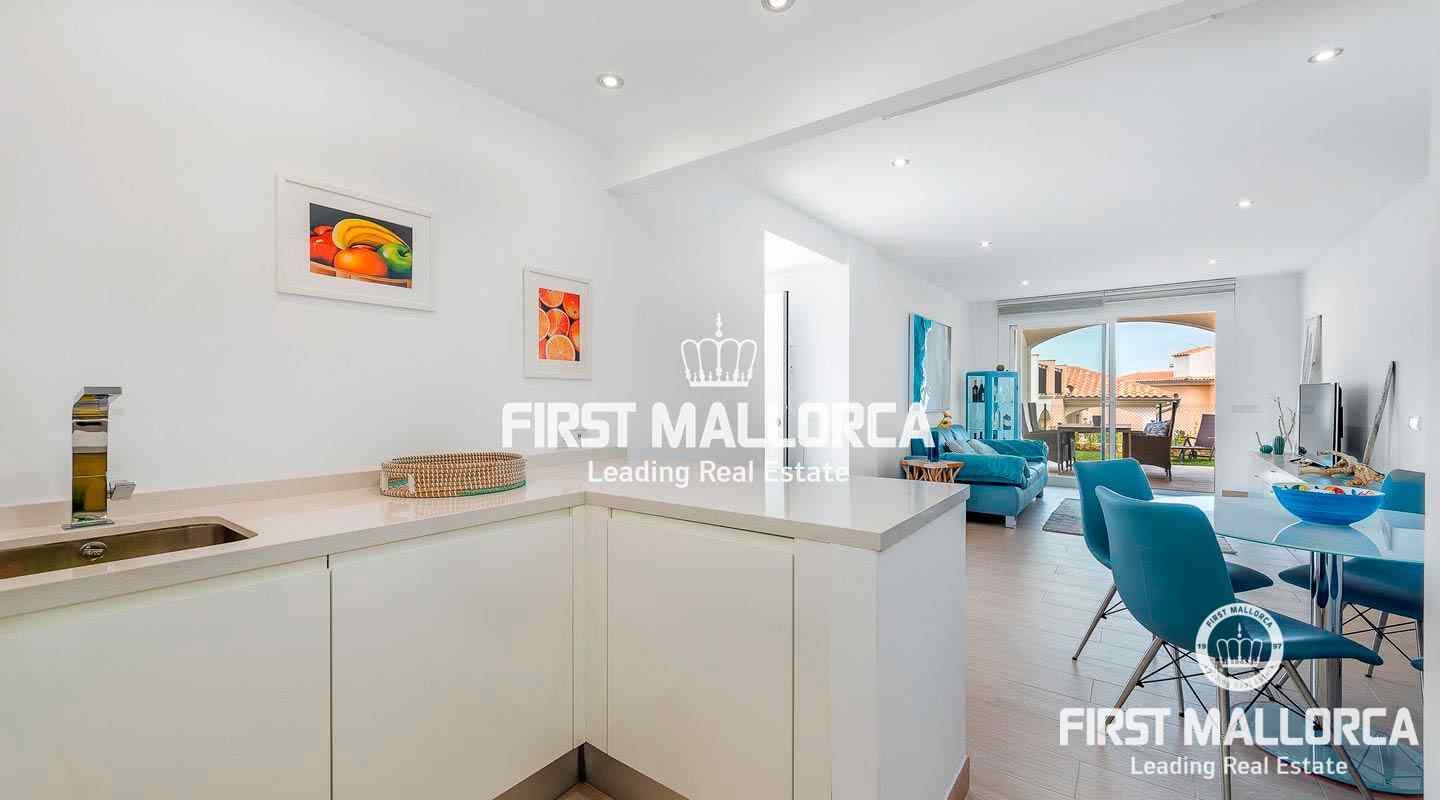 Este moderno apartamento bañado en luz se encuentra en la planta baja de una nueva comunidad bien cuidada en Colònia de Sant Pere, en la costa norte de Mallorca.