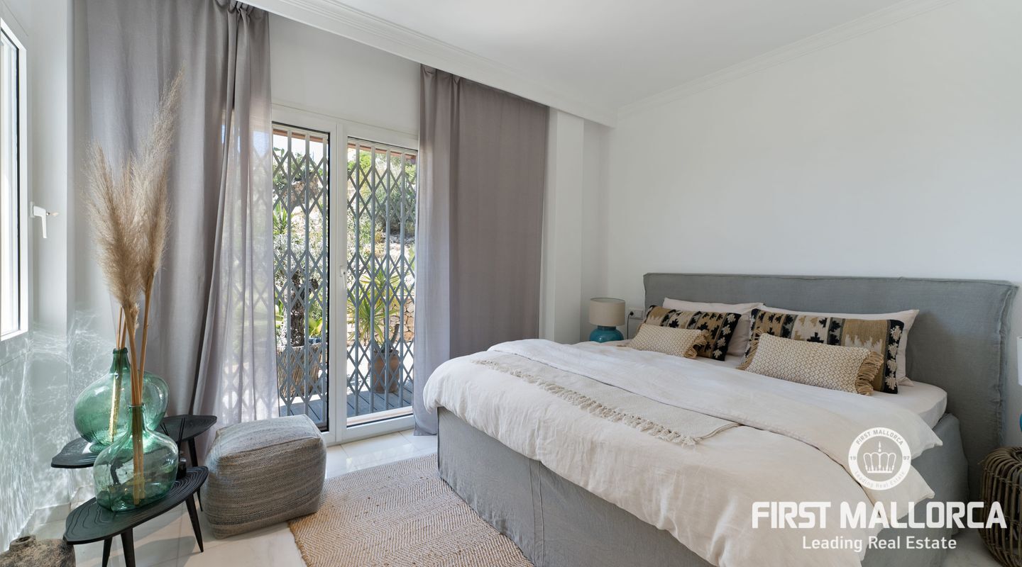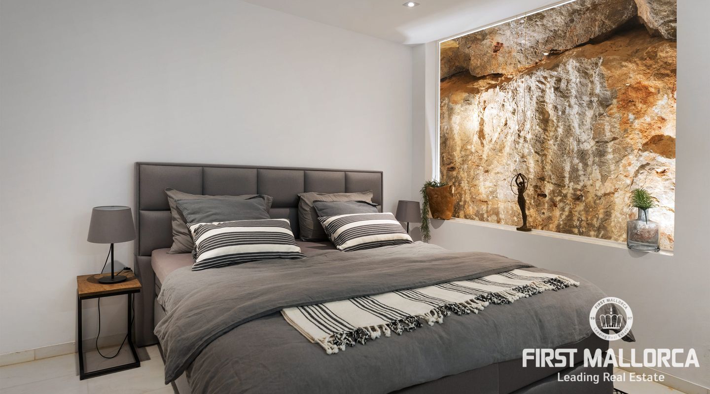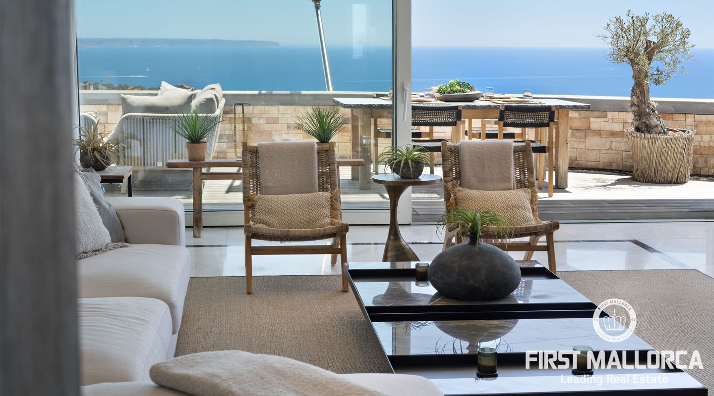 El diseño del apartamento sigue un concepto interior de alta calidad al estilo de Mykonos y Tulum. Los materiales naturales, los sutiles tonos tierra y arena, los muebles de buen gusto y la iluminación específica crean un ambiente entre un hotel boutique y un retiro en la playa. Los grandes ventanales ofrecen una vista clara del mar turquesa y del horizonte de Palma.