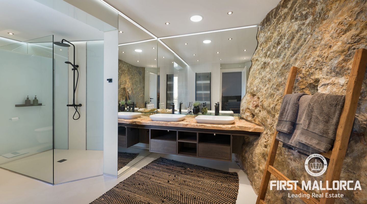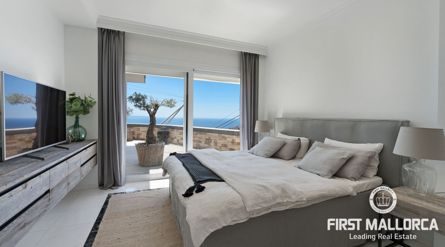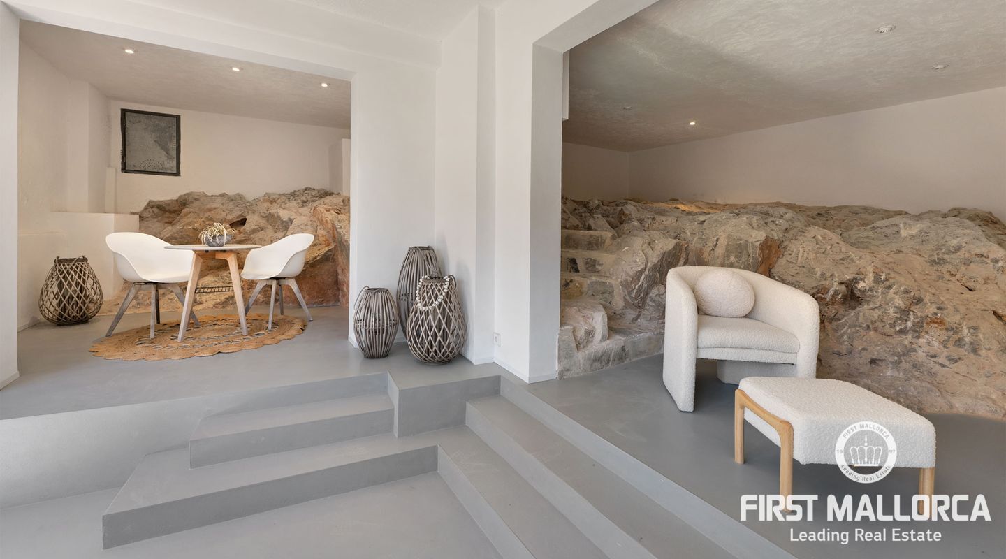 El diseño del apartamento sigue un concepto interior de alta calidad al estilo de Mykonos y Tulum. Los materiales naturales, los sutiles tonos tierra y arena, los muebles de buen gusto y la iluminación específica crean un ambiente entre un hotel boutique y un retiro en la playa. Los grandes ventanales ofrecen una vista clara del mar turquesa y del horizonte de Palma.