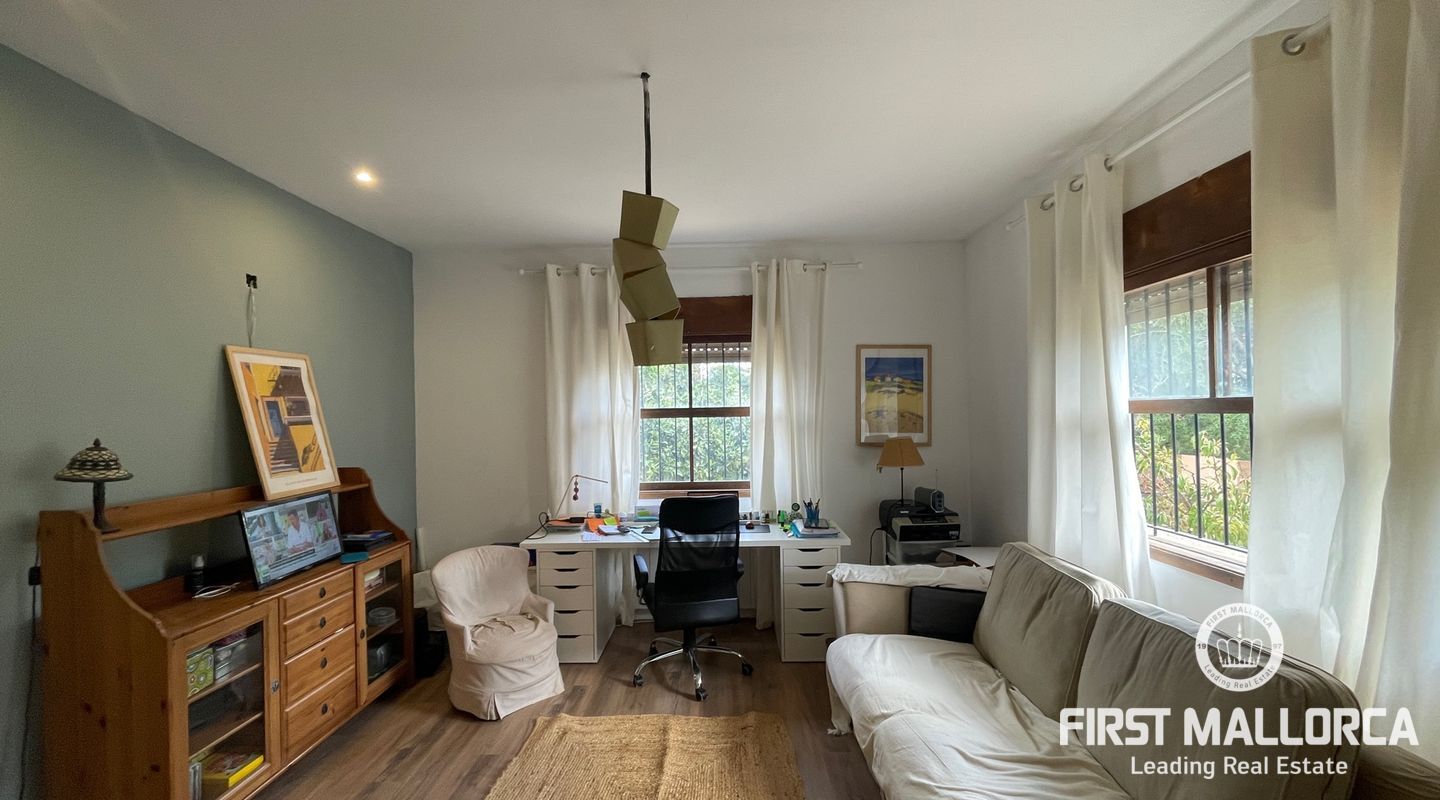 La distribución es la siguiente: hay una cocina abierta con zona de comedor y salón. En esta zona hay una sala de estudio-despacho. A través de la zona del recibidor se accede a los 4 dormitorios dobles y 2 baños. La propiedad cuenta con amplios espacios y es ideal para una familia con niños. La zona del jardín también es amplia con muchas posibilidades.