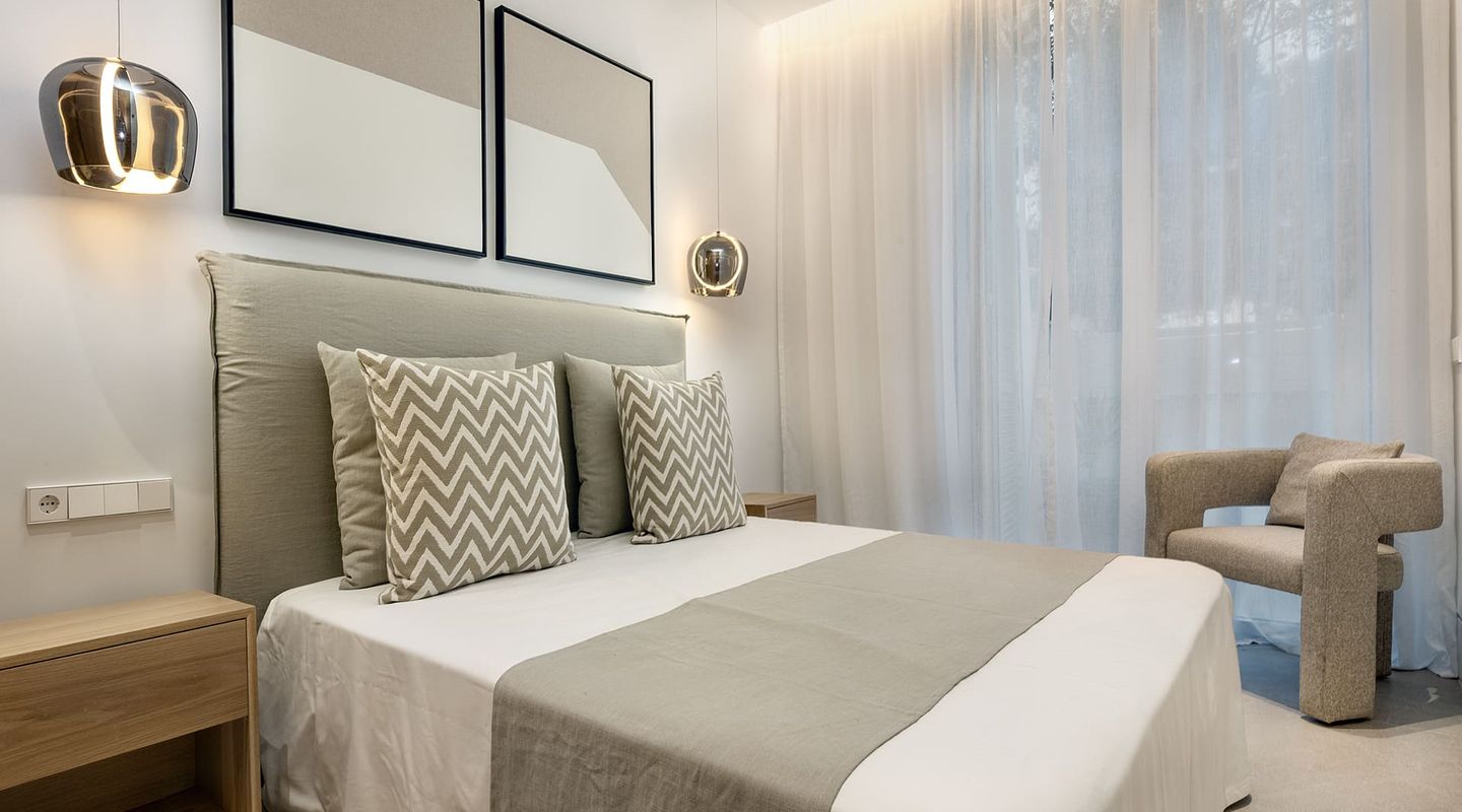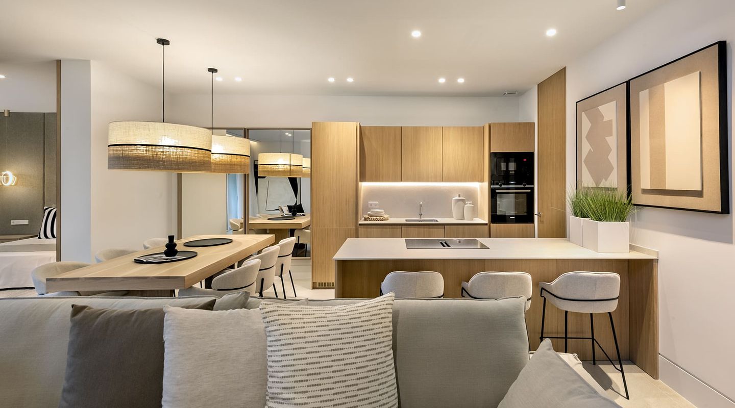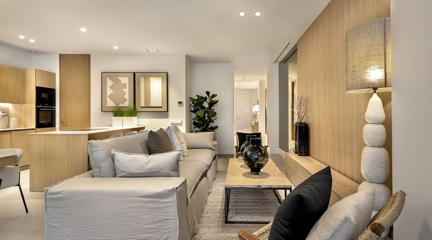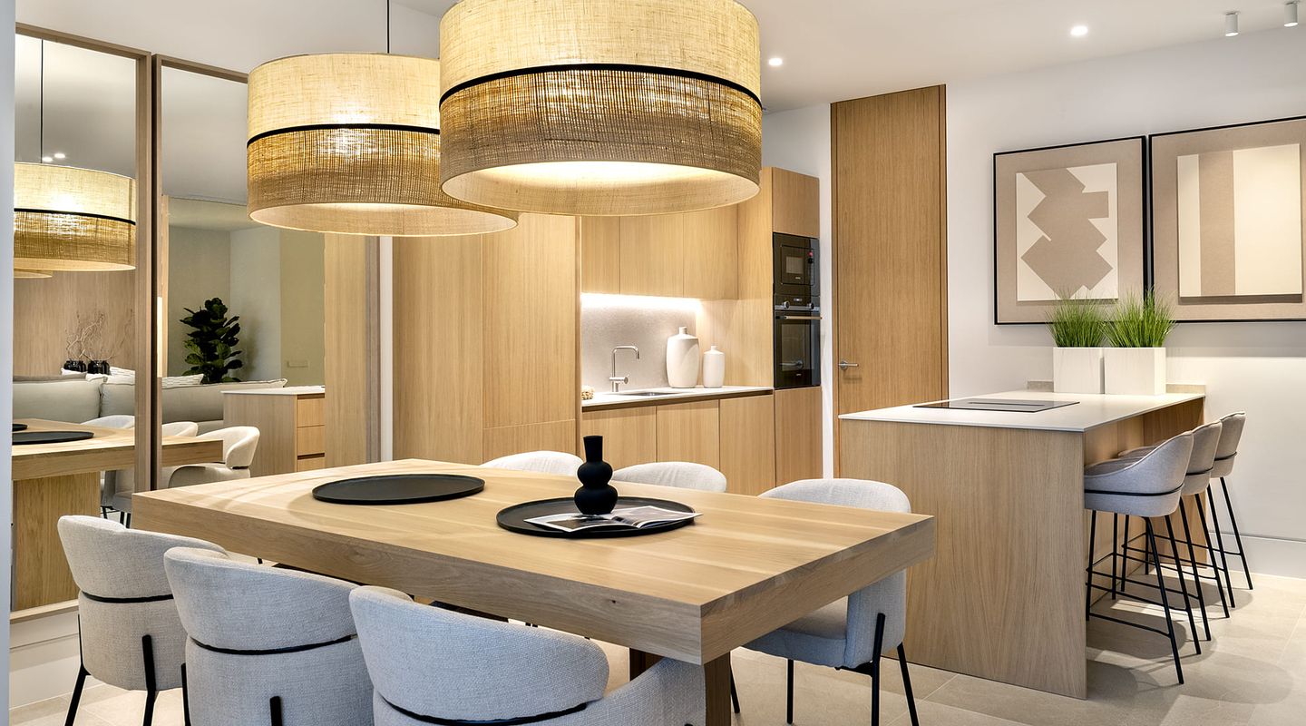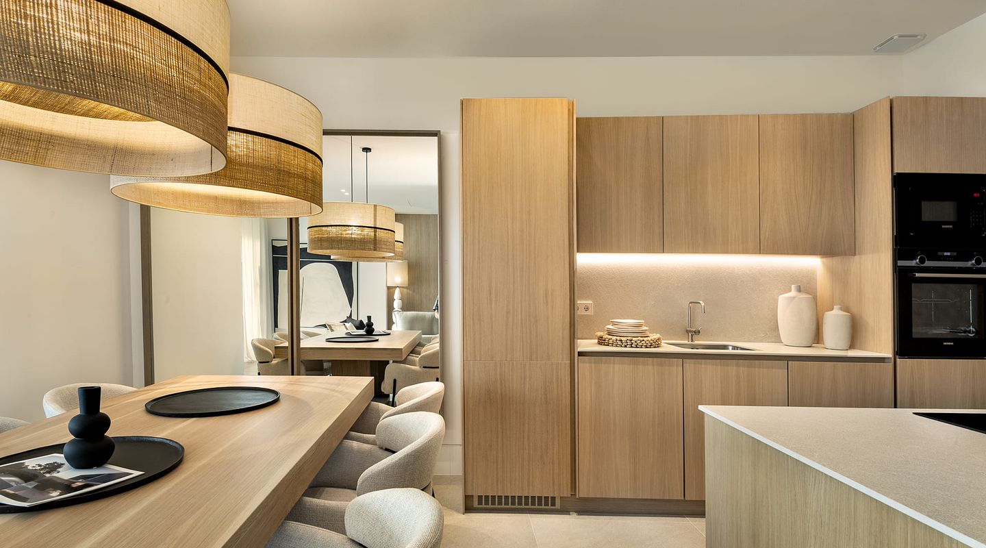 El apartamento dispone de tres dormitorios y dos elegantes baños, uno de ellos en suite. El dormitorio principal incluye un vestidor, ofreciendo confort y privacidad. La zona de estar, comedor y cocina de concepto abierto constituye el corazón del hogar y se complementa con un lavadero independiente.