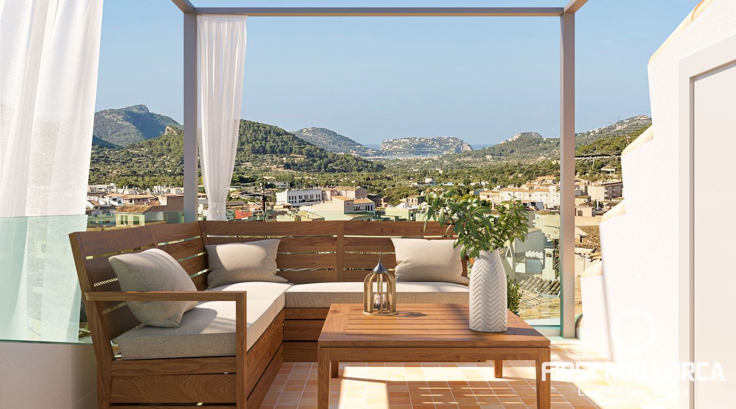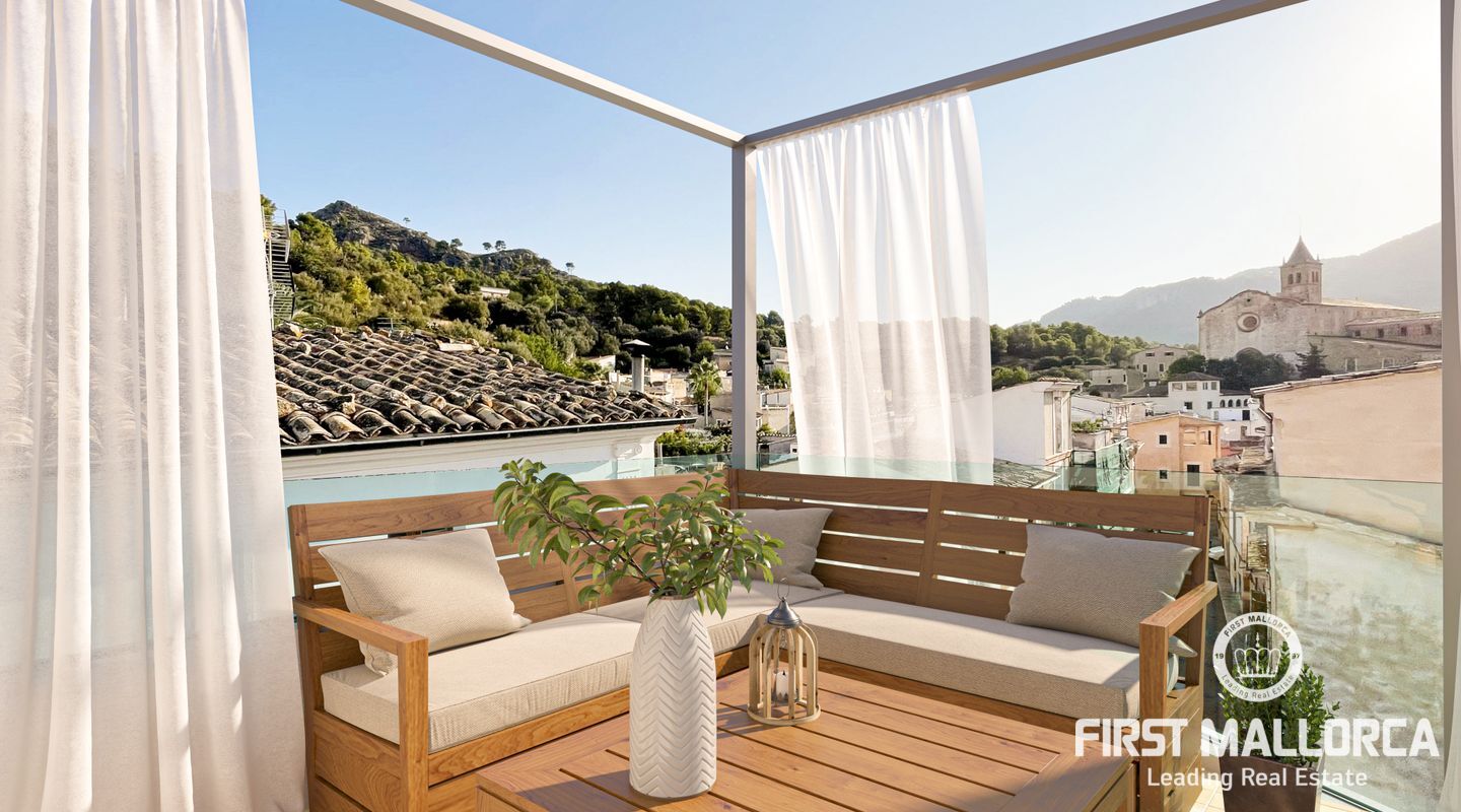 En la planta baja habrá una hermosa zona con cocina abierta, comedor y sala de estar con una antigua estufa de azulejos francesa que se conservará. Lo más destacado de la propiedad es la terraza de la azotea con impresionantes vistas panorámicas de 360º hasta la ciudad portuaria de Puerto de Andratx, el mar y las montañas.