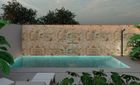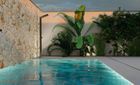 El jardín mediterráneo con notas tropicales rodea una piscina salina con control de pH automático, cascada decorativa y jets de masaje. En el interior, la chimenea de leña M-Design y las barandillas de hierro forjado refuerzan el carácter cálido y auténtico de esta vivienda.