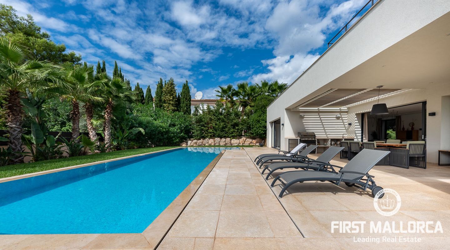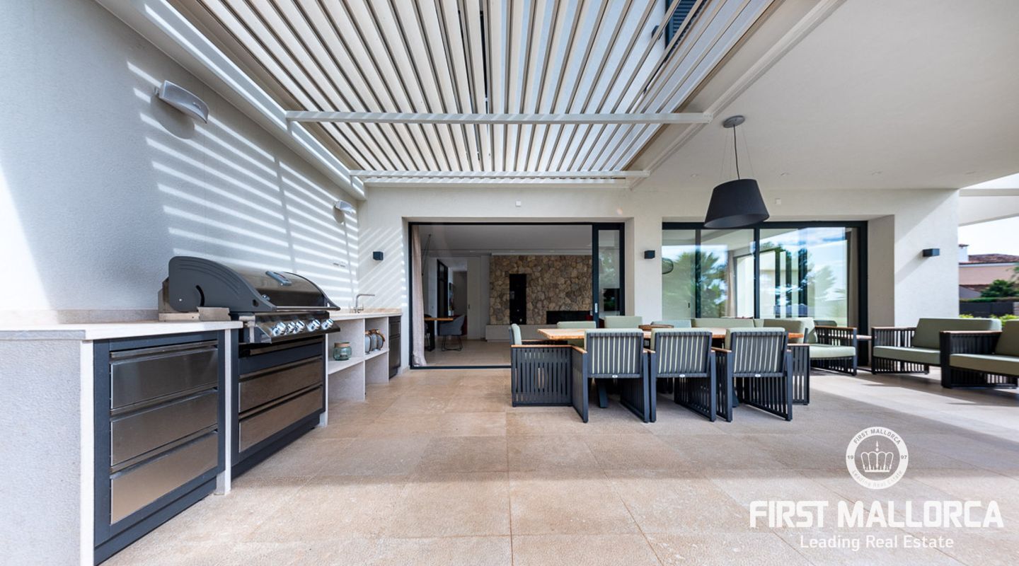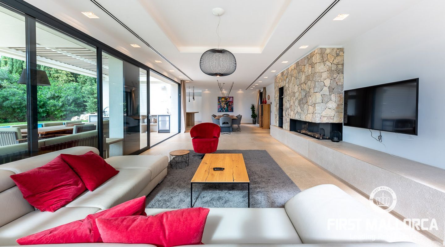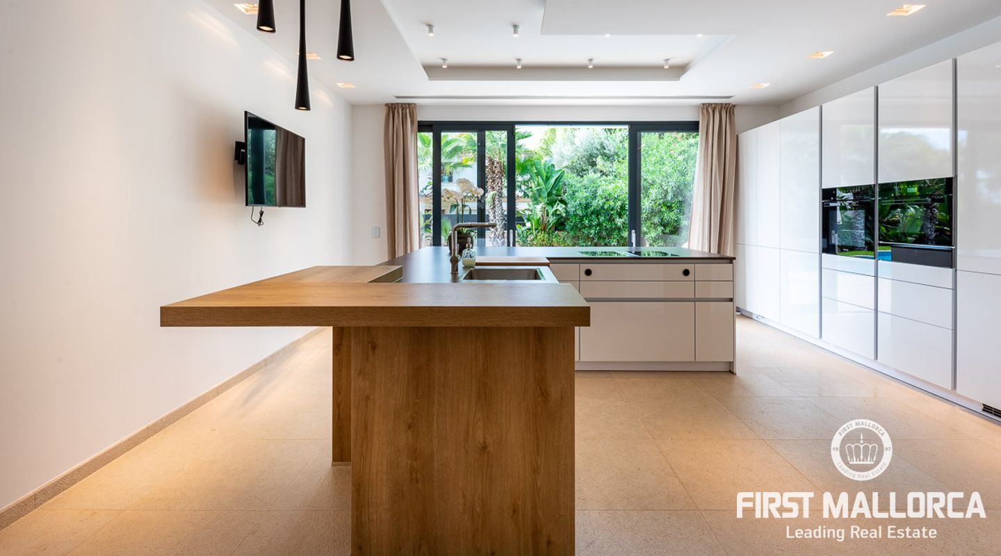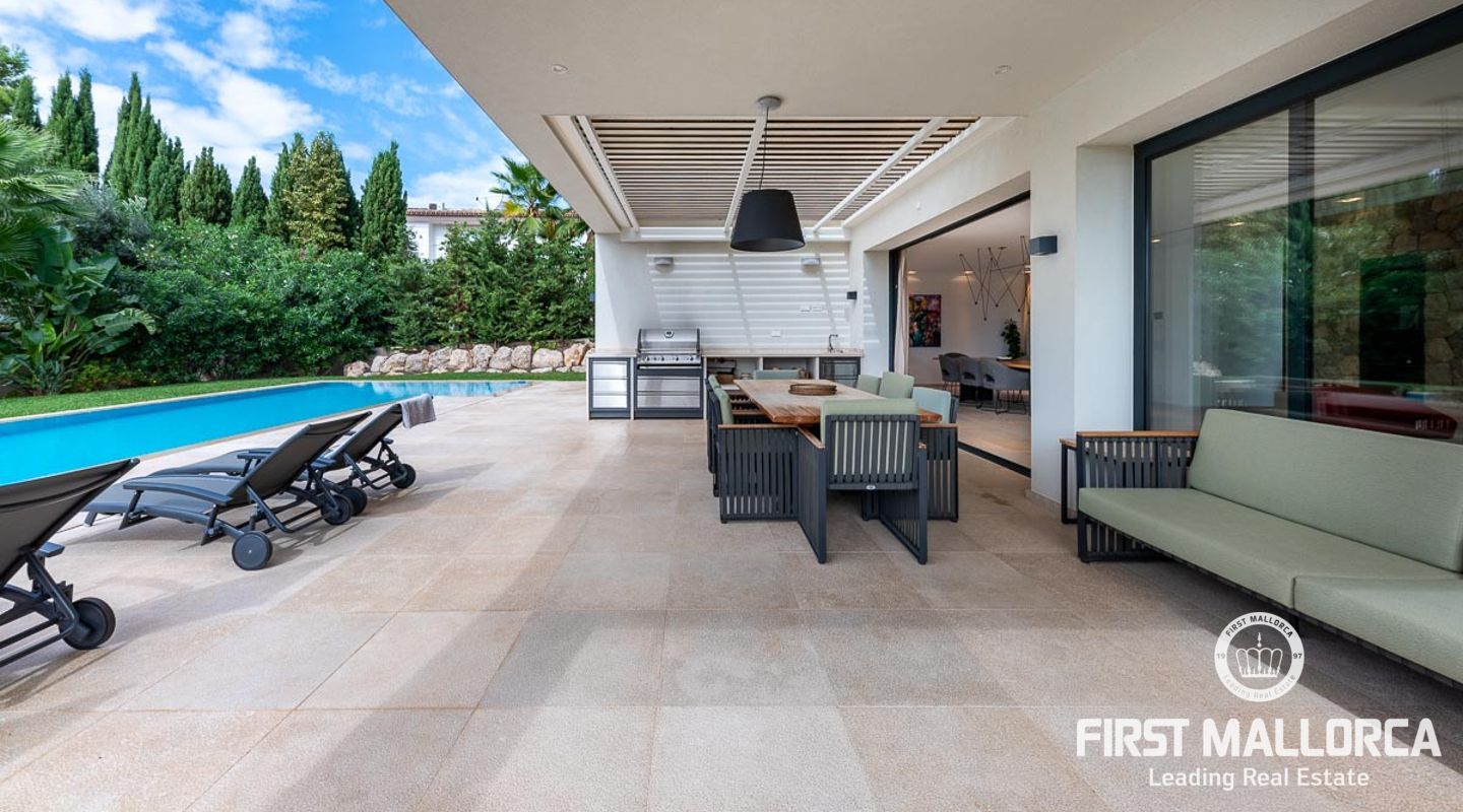 Líneas limpias, características vanguardistas y materiales de alta calidad hacen de esta propiedad de nivel superior un hogar verdaderamente elegante con un toque mediterráneo. Esta villa con una superficie construida de 462 m² disfruta de un diseño de vida de planta abierta con transiciones fluidas y grandes frentes de ventanas, creando un ambiente único. Además de una impresionante zona de entrada con doble altura de techo y una extraordinaria bodega, hay generosas zonas de estar, 4 dormitorios y 5 baños, que ofrecen suficiente espacio para usted y su familia. También hay una habitación independiente con entrada propia, ideal para invitados y amigos. Las características de alta calidad garantizan el confort durante todo el año. La calefacción por suelo radiante, el aire acondicionado conducido y la chimenea proporcionan temperaturas agradables en invierno y las terrazas cubiertas ofrecen sombra durante los calurosos meses de verano. Gracias a su excelente ubicación en el exclusivo suroeste de Mallorca, esta propiedad es una propiedad de inversión estable con un alto potencial y lista para entrar a vivir hoy mismo. Nova Santa Ponsa es una zona residencial de lujo que goza de una ubicación privilegiada con fácil acceso al elegante puerto deportivo de Port Adriano, a varios campos de golf galardonados y a menos de 20 minutos en coche de la capital de la isla, Palma de Mallorca, y de su aeropuerto internacional, que está conectado con vuelos directos a todas las capitales europeas, así como a algunas del extranjero, como Nueva York.
