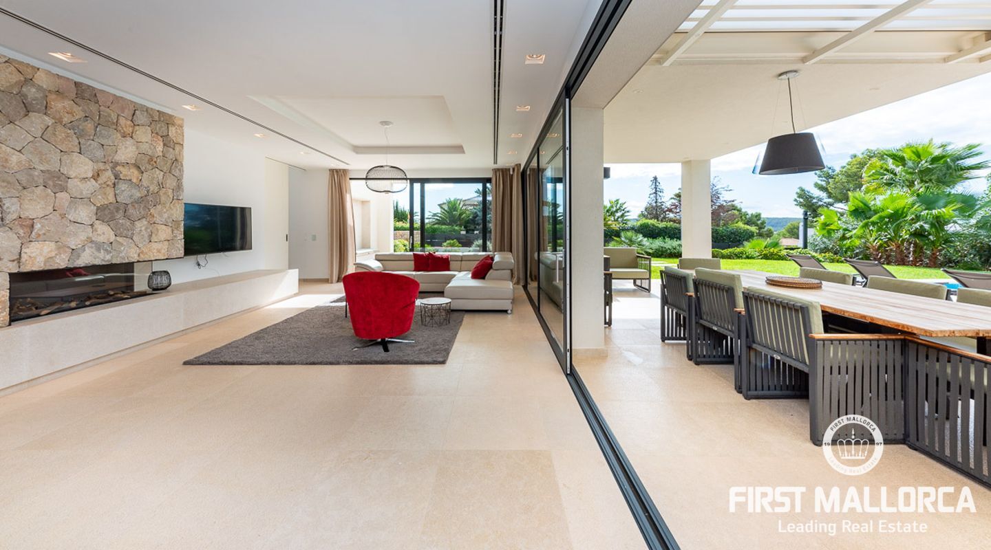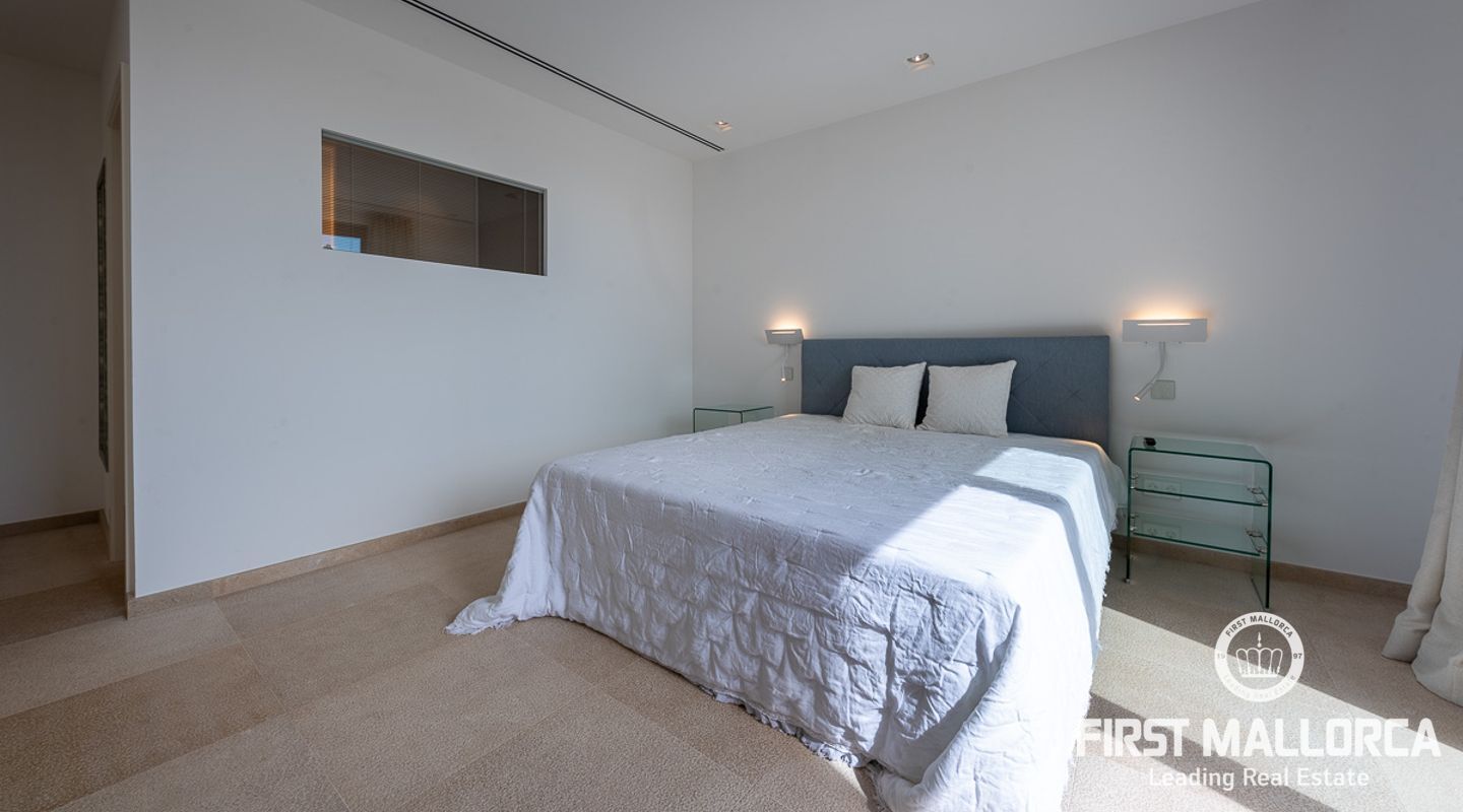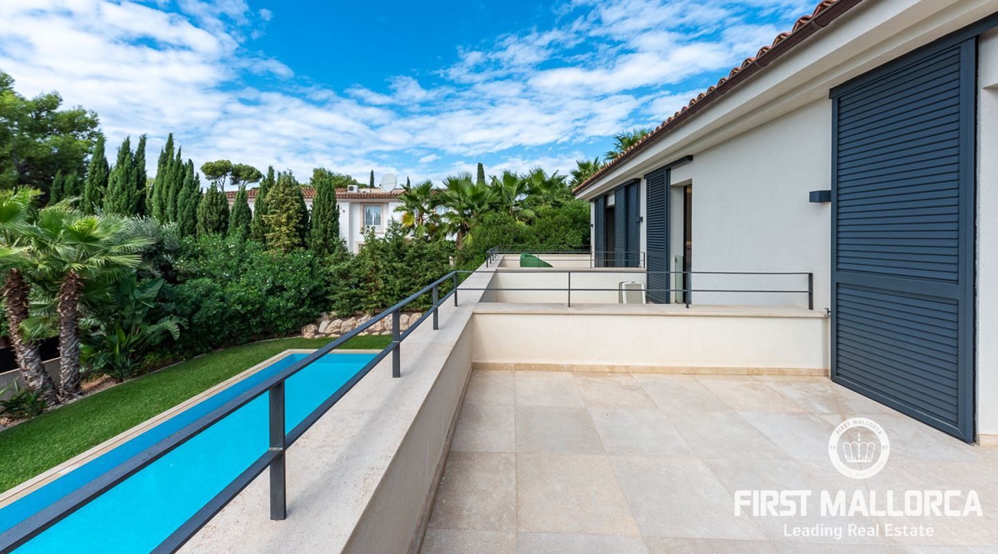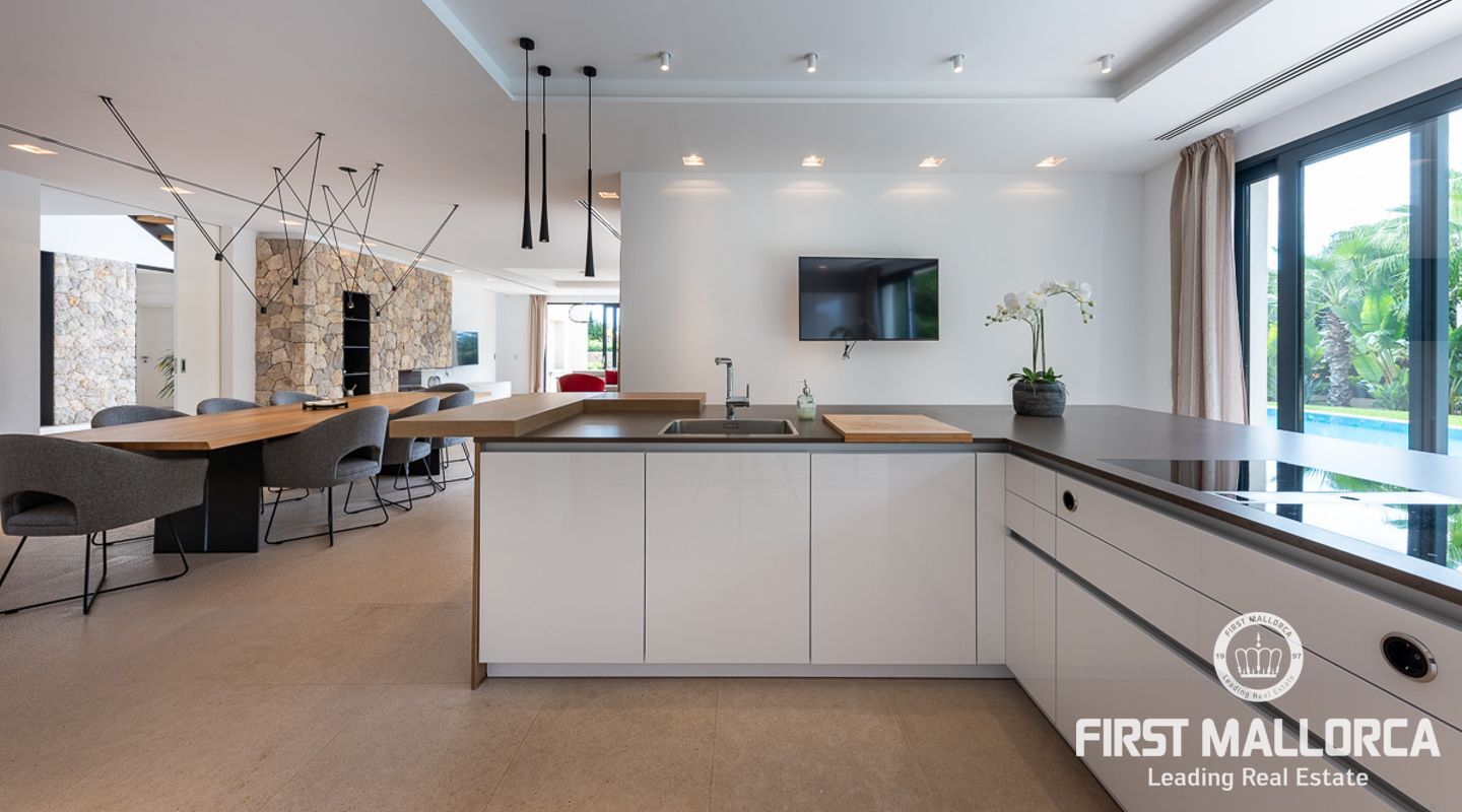 Líneas limpias, características vanguardistas y materiales de alta calidad hacen de esta propiedad de nivel superior un hogar verdaderamente elegante con un toque mediterráneo. Esta villa con una superficie construida de 462 m² disfruta de un diseño de vida de planta abierta con transiciones fluidas y grandes frentes de ventanas, creando un ambiente único. Además de una impresionante zona de entrada con doble altura de techo y una extraordinaria bodega, hay generosas zonas de estar, 4 dormitorios y 5 baños, que ofrecen suficiente espacio para usted y su familia. También hay una habitación independiente con entrada propia, ideal para invitados y amigos. Las características de alta calidad garantizan el confort durante todo el año. La calefacción por suelo radiante, el aire acondicionado conducido y la chimenea proporcionan temperaturas agradables en invierno y las terrazas cubiertas ofrecen sombra durante los calurosos meses de verano. Gracias a su excelente ubicación en el exclusivo suroeste de Mallorca, esta propiedad es una propiedad de inversión estable con un alto potencial y lista para entrar a vivir hoy mismo. Nova Santa Ponsa es una zona residencial de lujo que goza de una ubicación privilegiada con fácil acceso al elegante puerto deportivo de Port Adriano, a varios campos de golf galardonados y a menos de 20 minutos en coche de la capital de la isla, Palma de Mallorca, y de su aeropuerto internacional, que está conectado con vuelos directos a todas las capitales europeas, así como a algunas del extranjero, como Nueva York.
