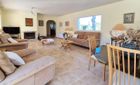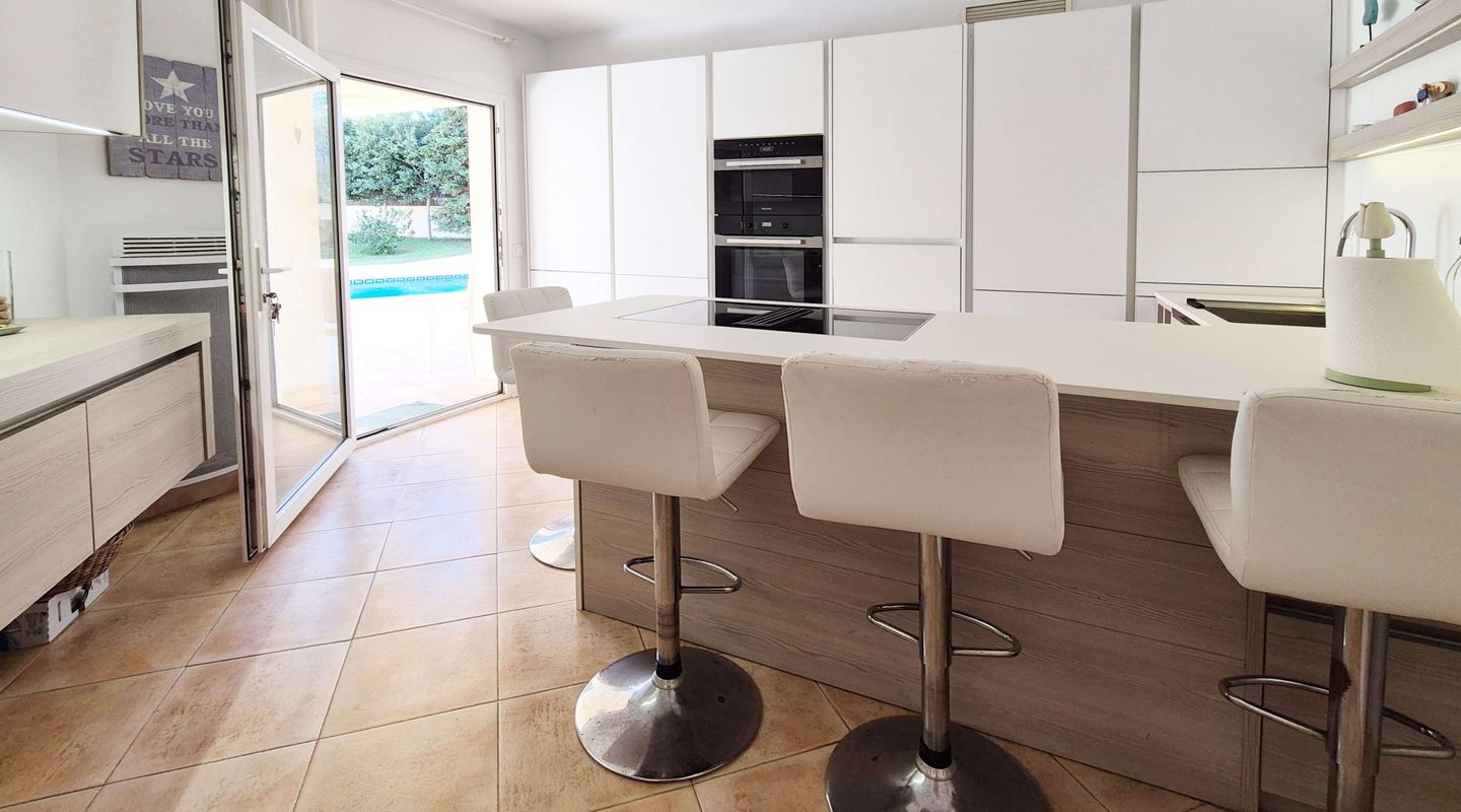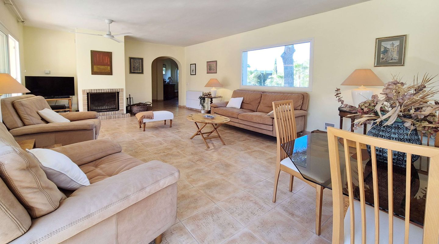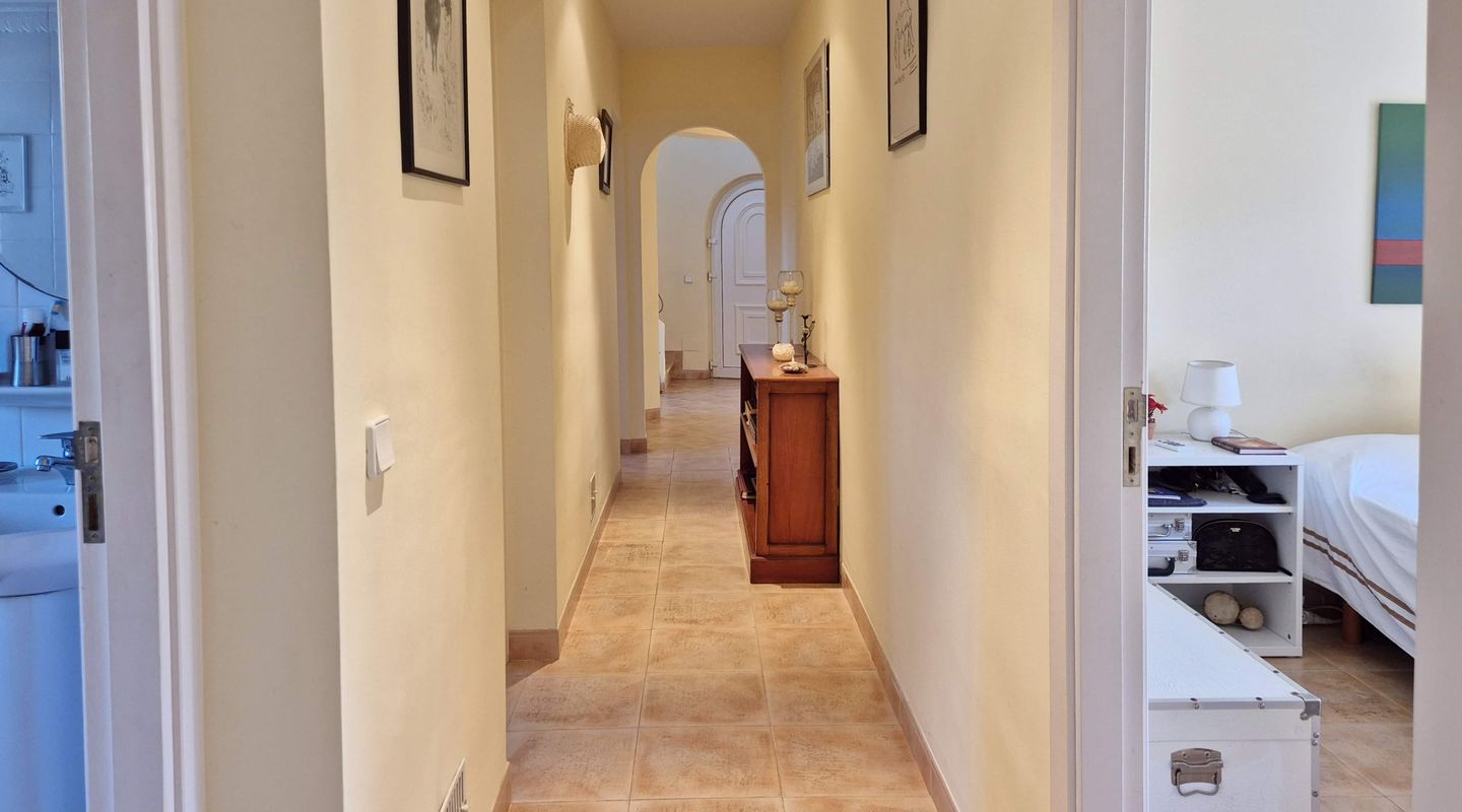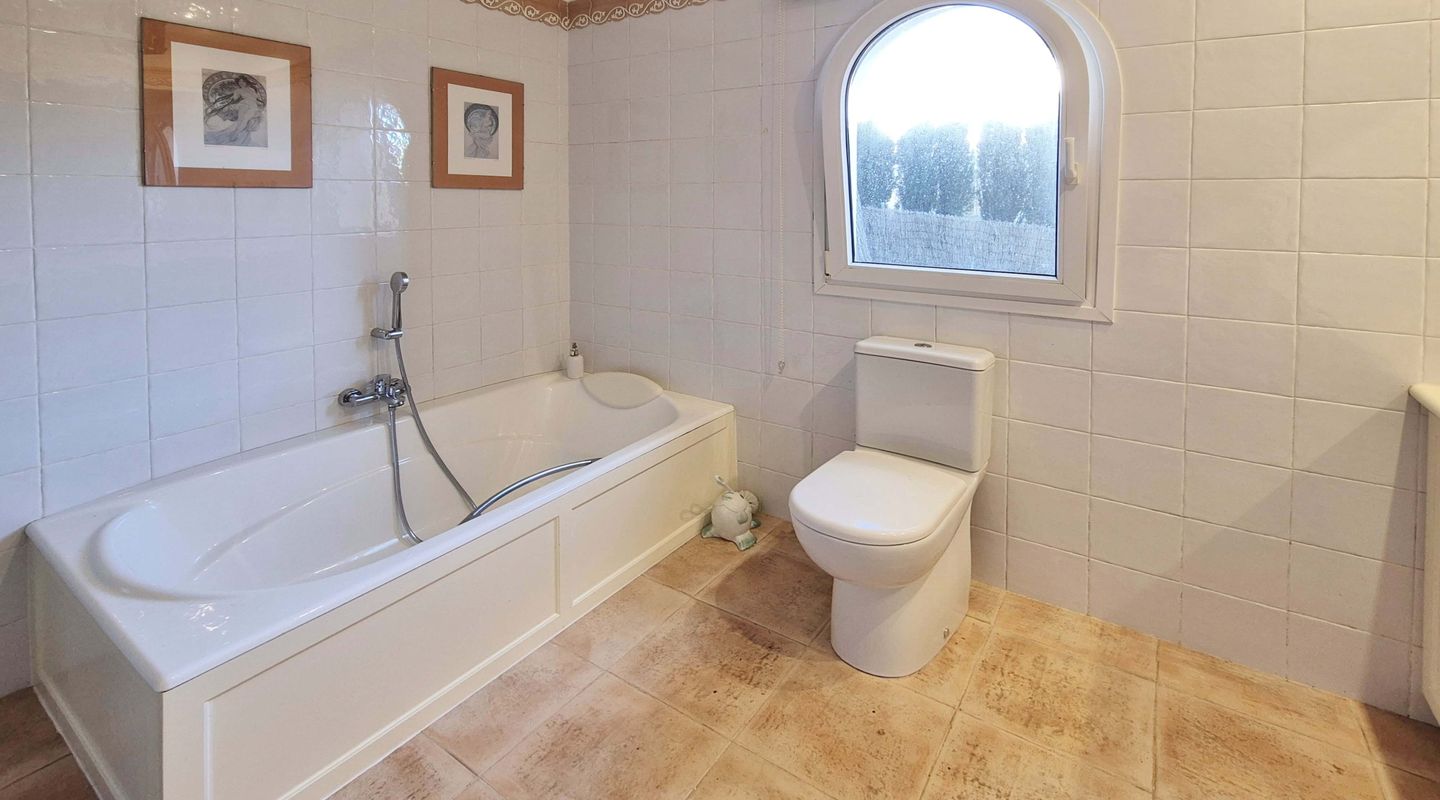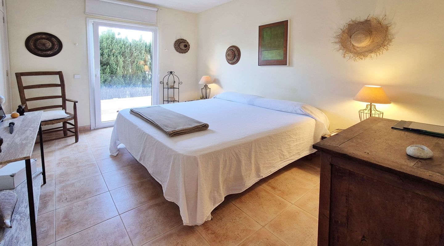 El salón, bañado en luz natural y con chimenea, constituye el corazón de la vivienda y se abre hacia la terraza con piscina orientada al sur y rodeada de zonas verdes. A un lado se encuentra la cocina reformada. En total, la propiedad dispone de tres dormitorios bien distribuidos, dos baños (uno en suite) y un aseo de cortesía.