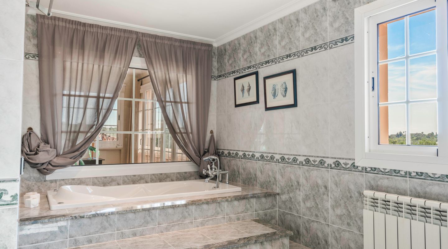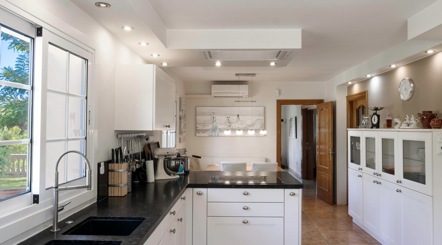 La planta baja ofrece amplias estancias, incluyendo un luminoso salón familiar con chimenea, un comedor independiente, otro salón con chimenea y una suite de invitados con baño en suite. La cocina Nolte de alta gama, equipada con modernos electrodomésticos, es elegante y funcional. Todas las estancias se abren a la terraza cubierta con impresionantes vistas panorámicas.