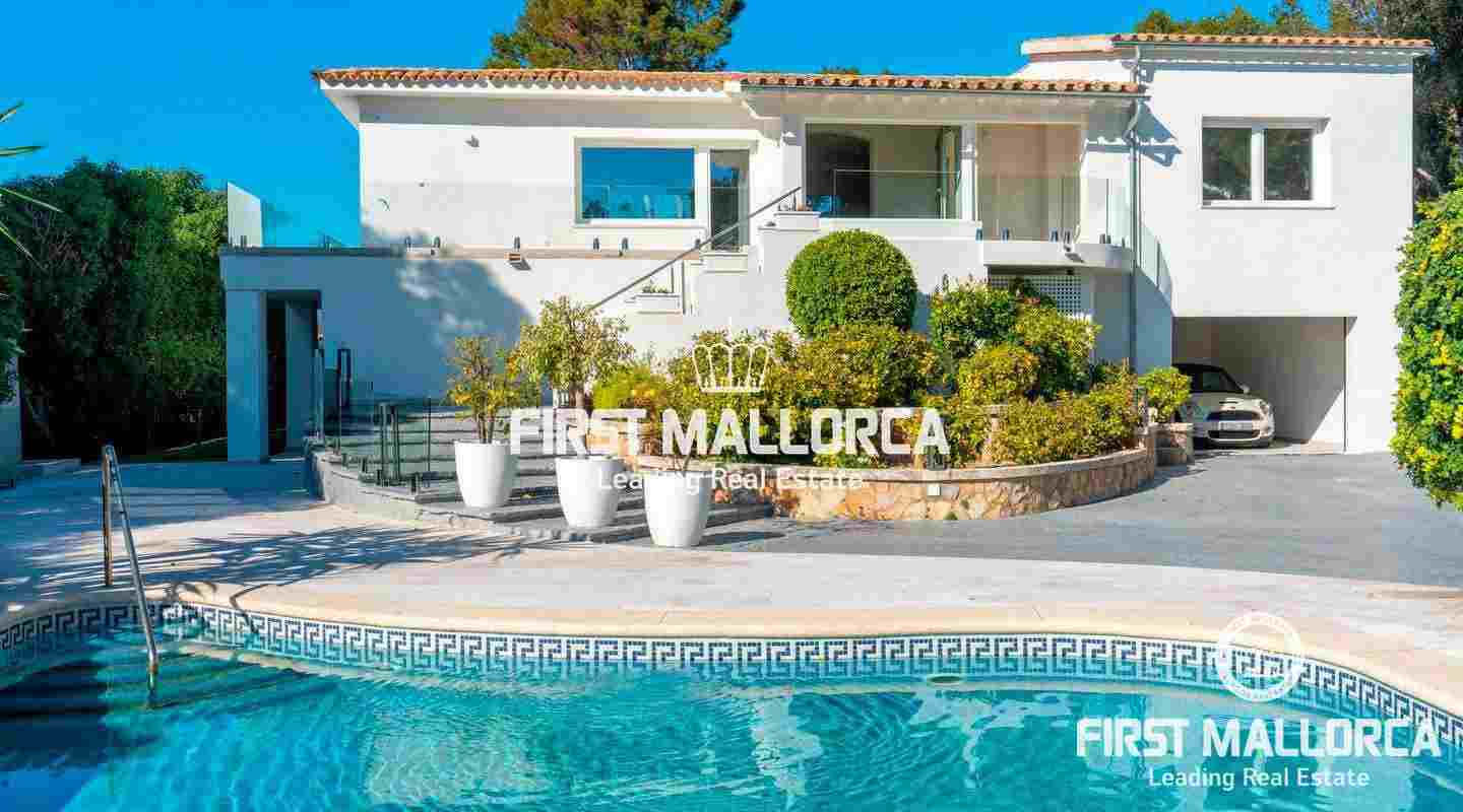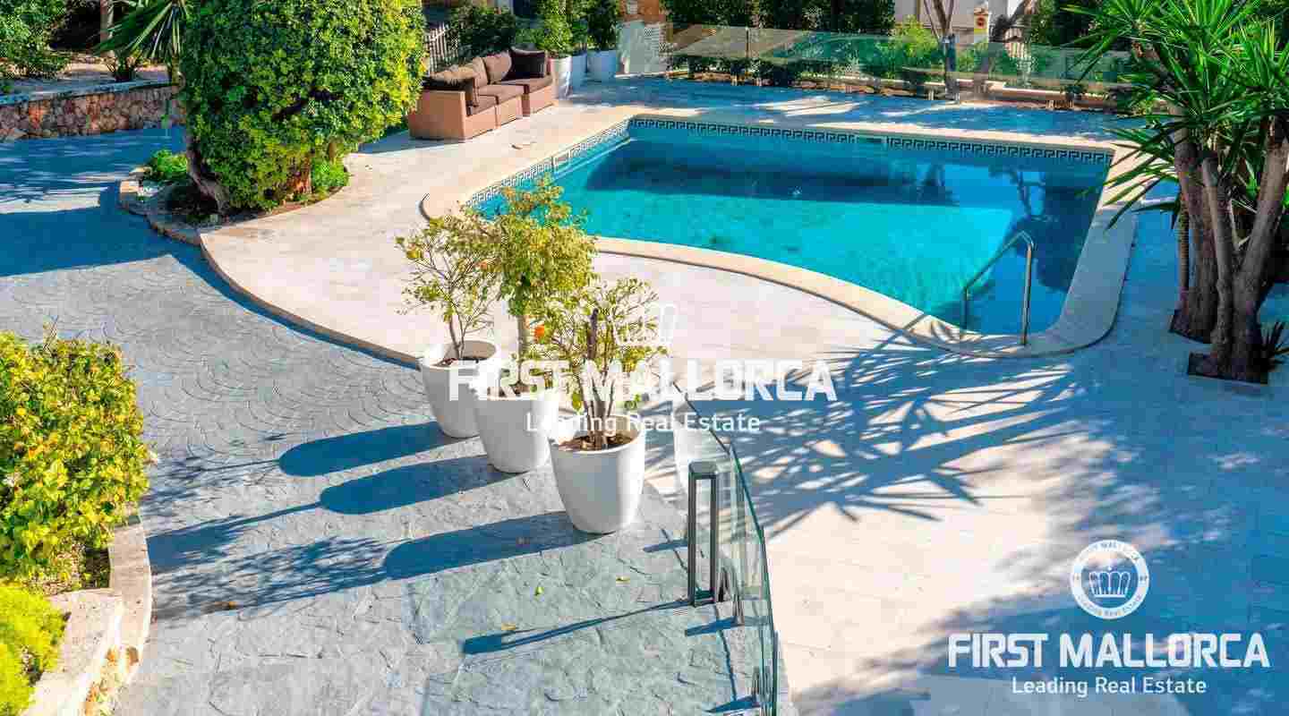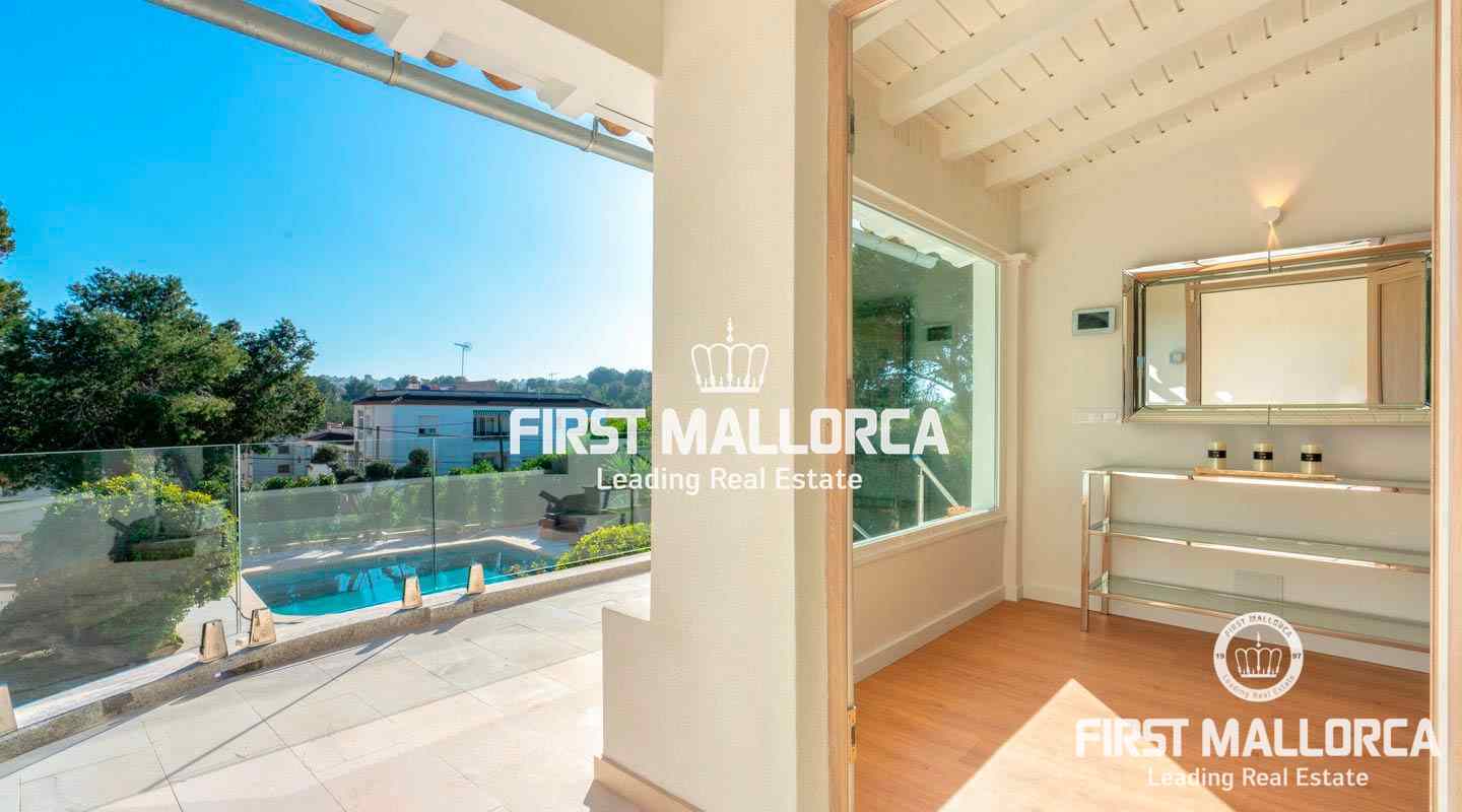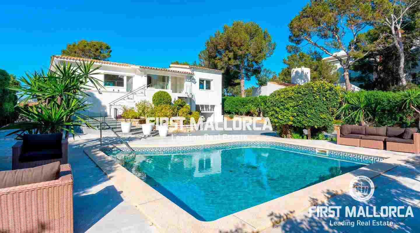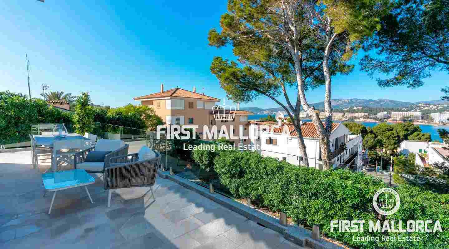 La encantadora propiedad de estilo clásico goza de un interiorismo bañado en luz además de preciosos atardeceres e impresionantes vistas a la bahía de Santa Ponsa desde el nivel principal. El exterior ofrece una gran piscina y varias terrazas que invitan a tomar el sol durante todo el día.