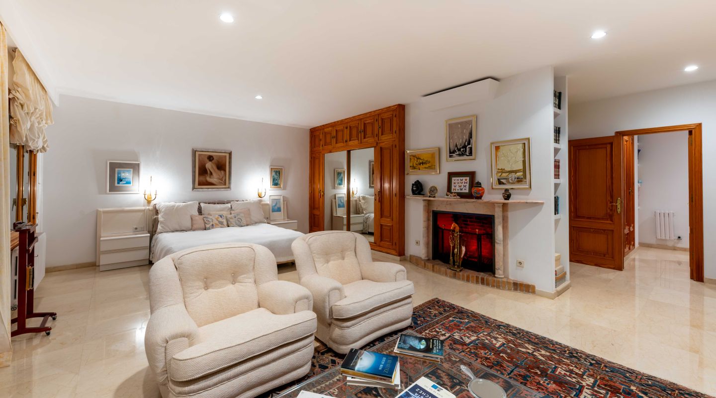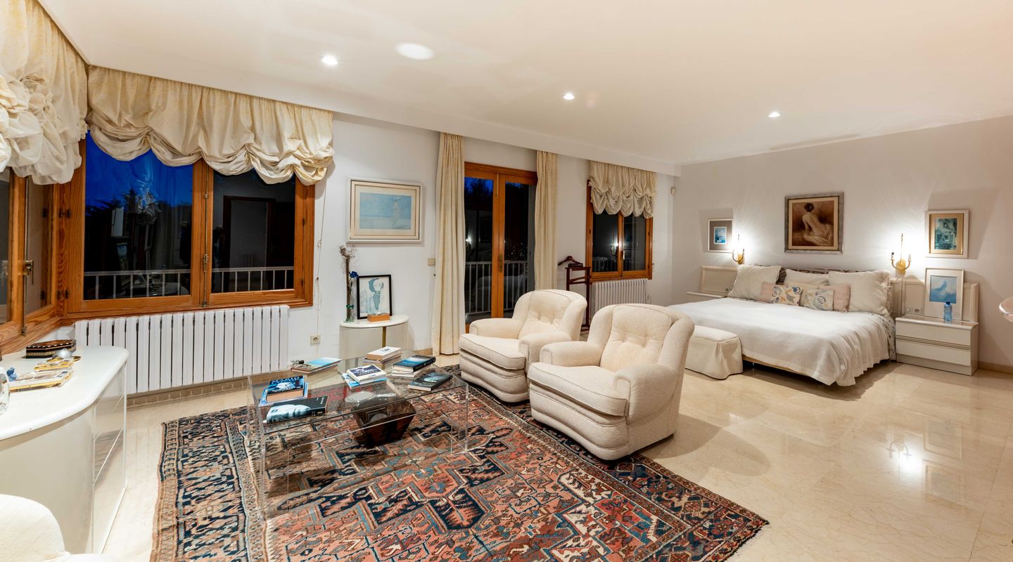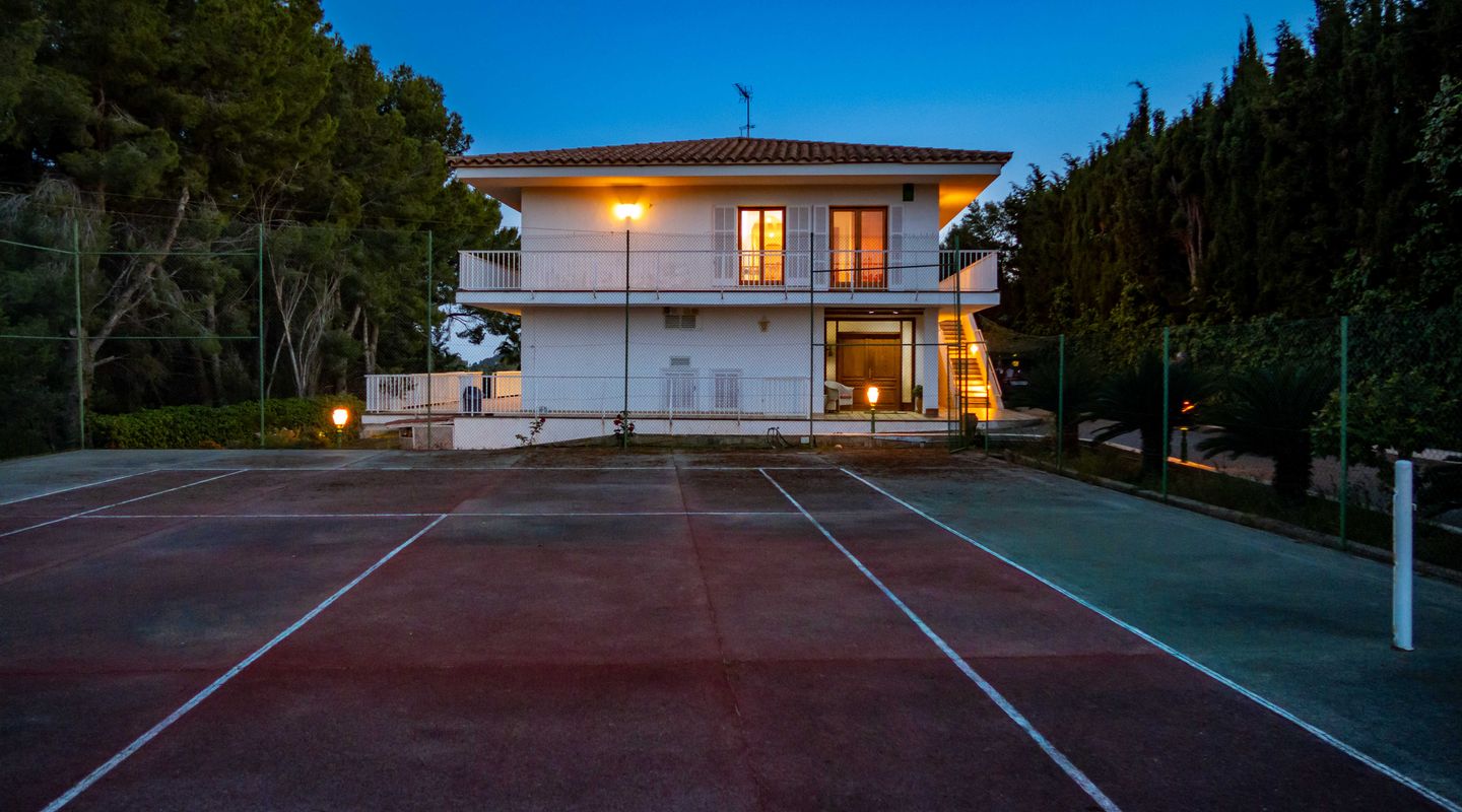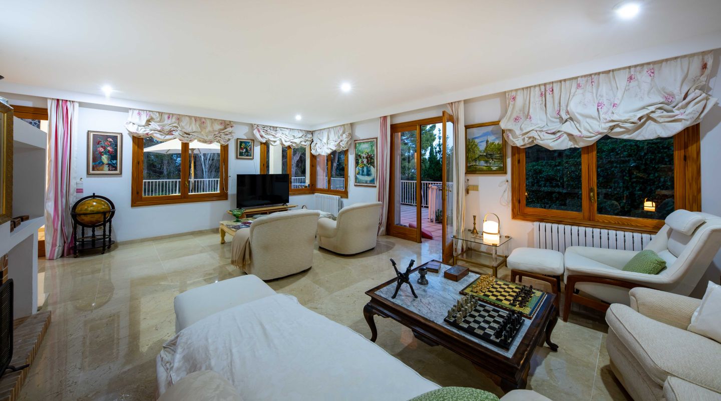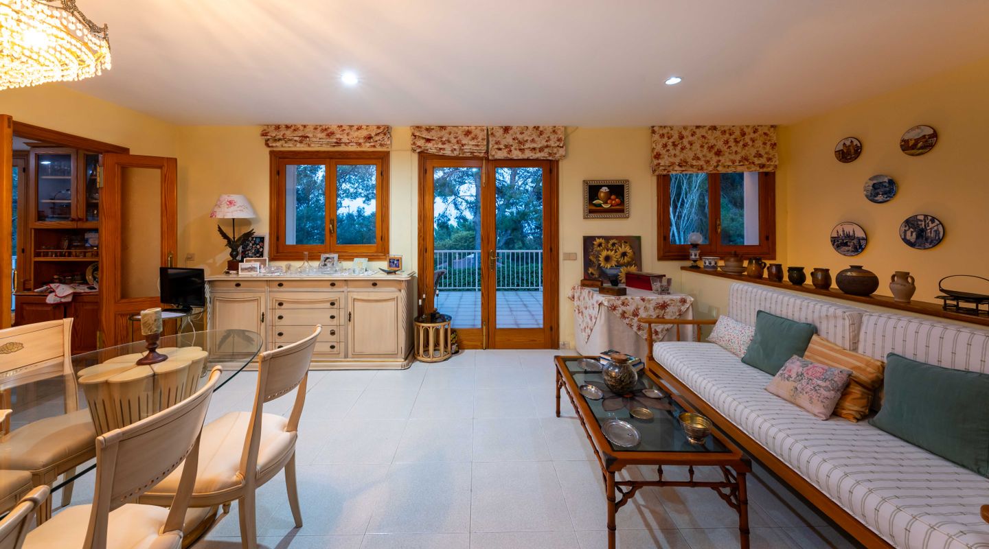Esta villa con más de 500m2 de superficie habitable y vistas al Golf de Son Quint está ubicada en una parcela de más de 2430m2 creando un espacio idílico con mucha privacidad y tranquilidad. La villa consta de varias salas de estar, una amplia cocina, 6 amplios dormitorios, 6 baños, 2 aseos para invitados, 2 chimeneas (una en la suite principal y otra en uno de los salones). La planta baja (aproximadamente 200 m2) se utiliza actualmente como sala de pasatiempos/zona de ocio con gimnasio, mesa de ping-pong, zona de taller, almacén y ofrece aún mucho más espacio para otras actividades.