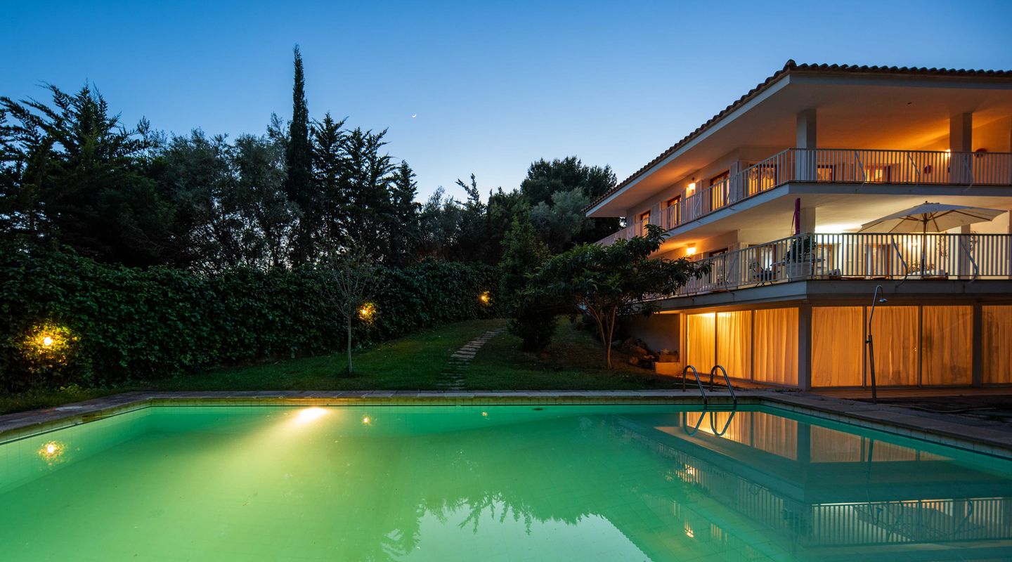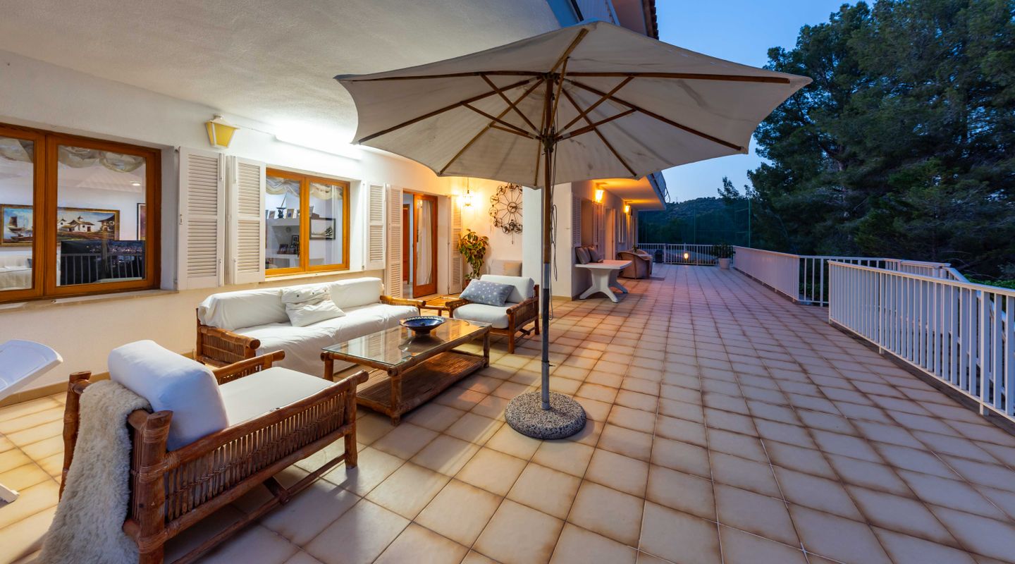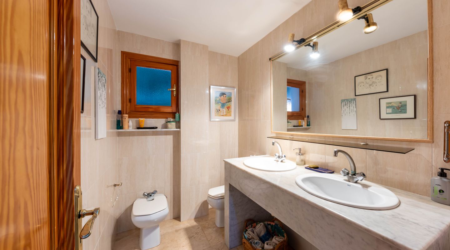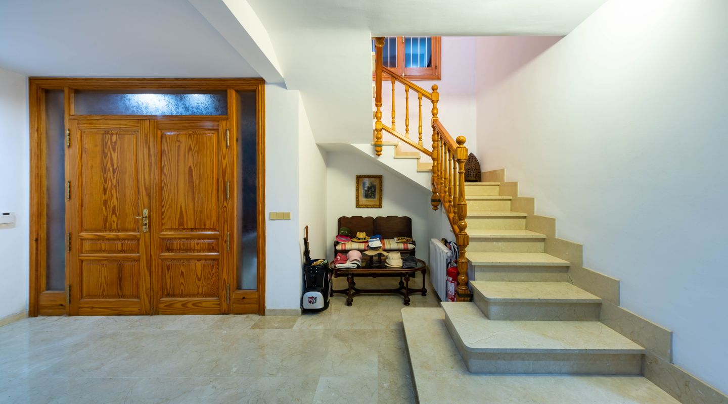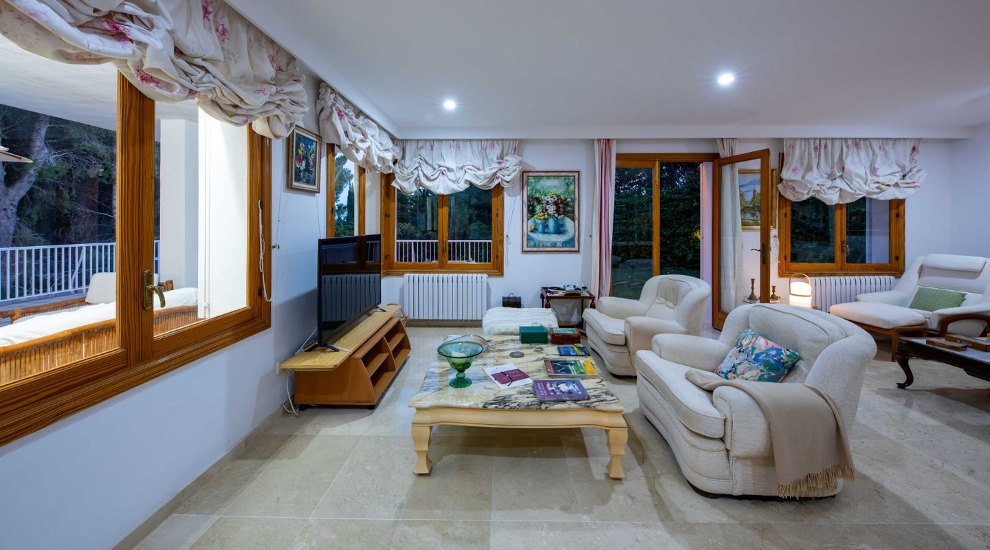 Esta villa con más de 500m2 de superficie habitable y vistas al Golf de Son Quint está ubicada en una parcela de más de 2430m2 creando un espacio idílico con mucha privacidad y tranquilidad. La villa consta de varias salas de estar, una amplia cocina, 6 amplios dormitorios, 6 baños, 2 aseos para invitados, 2 chimeneas (una en la suite principal y otra en uno de los salones). La planta baja (aproximadamente 200 m2) se utiliza actualmente como sala de pasatiempos/zona de ocio con gimnasio, mesa de ping-pong, zona de taller, almacén y ofrece aún mucho más espacio para otras actividades.