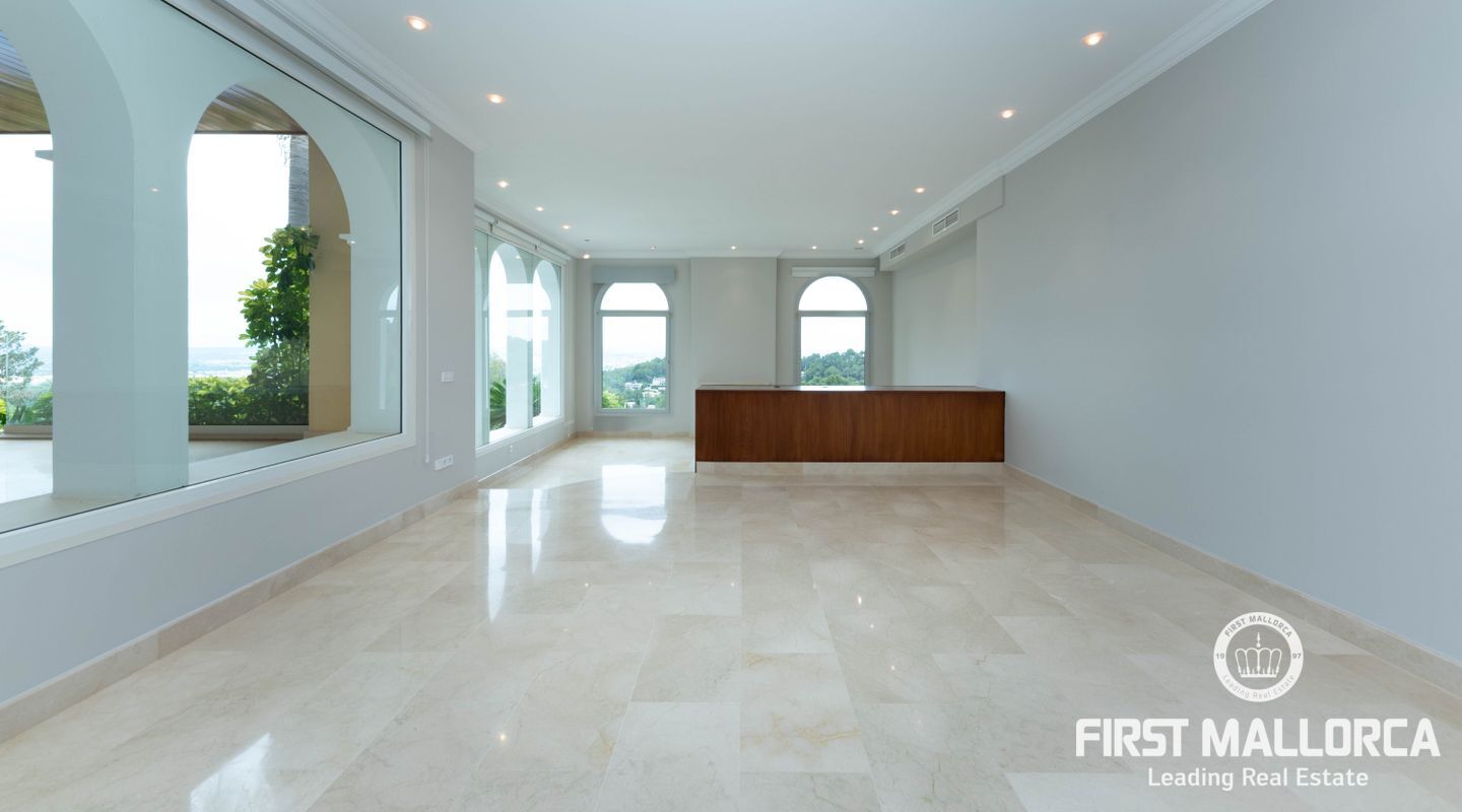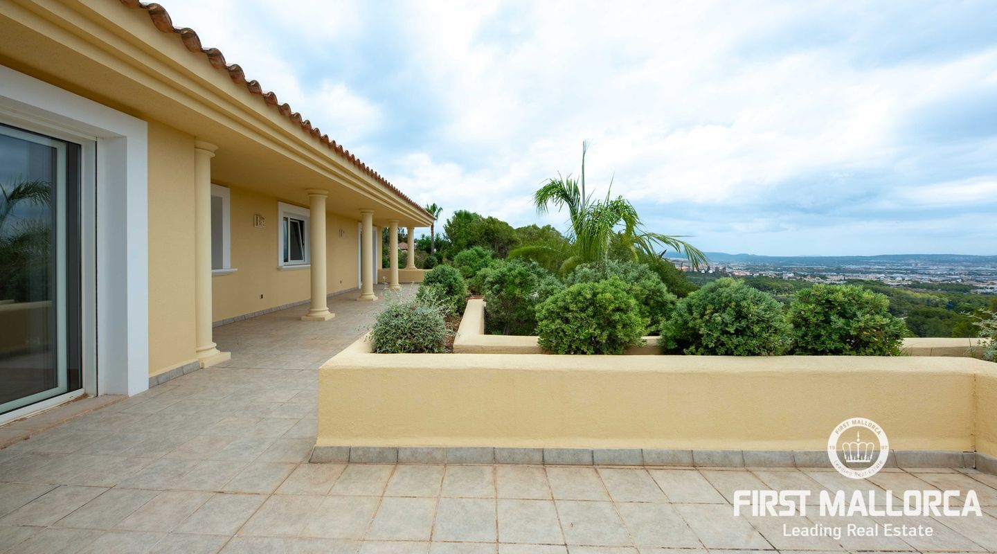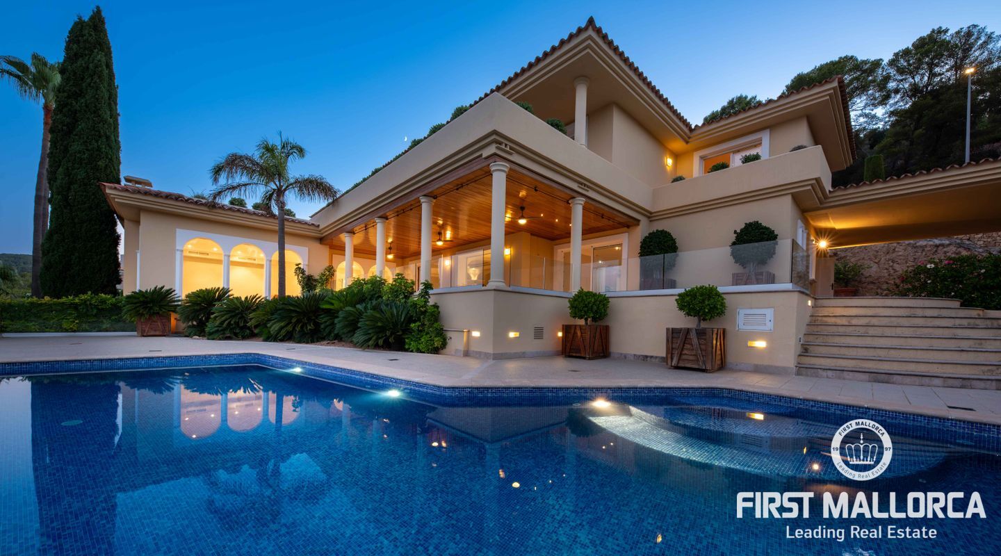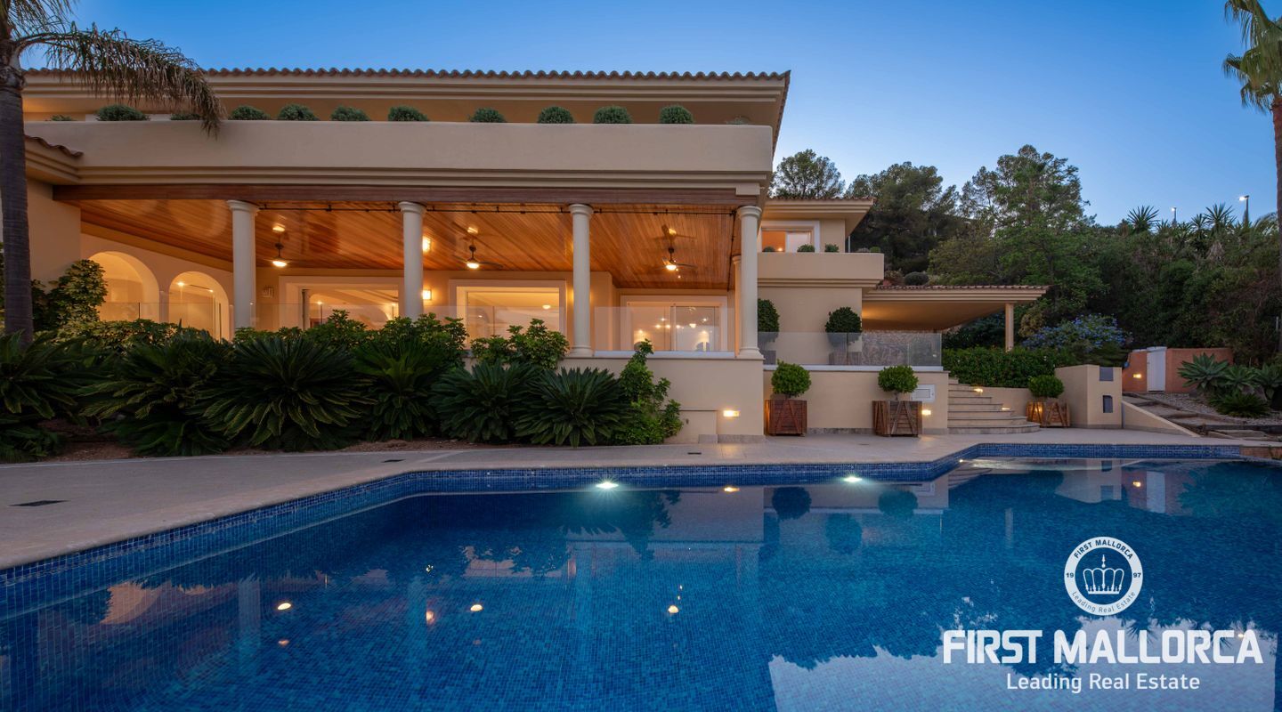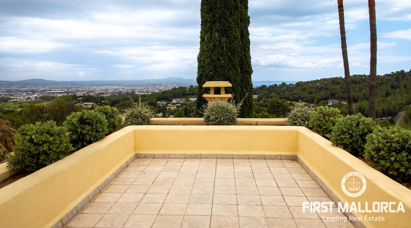 Esta elegante villa de estilo clásico se encuentra en una amplia parcela de aproximadamente 2.016 m², en una zona elevada de Son Vida. Construida en 1999 por su actual propietario, la propiedad destaca por su excelente calidad de construcción y ofrece unos 598 m² de superficie construida, con impresionantes vistas al mar y a la bahía de Palma. Un acceso privado y cómodo conduce a la majestuosa entrada principal. En la planta baja se ubican un amplio salón, dos comedores, una espaciosa cocina, aseo de cortesía y varios espacios de almacenamiento. Además, cuenta con un dormitorio de invitados con baño en suite y entrada independiente. Desde esta planta se accede a una generosa terraza cubierta, ideal para disfrutar del clima mediterráneo. La planta superior alberga un espectacular dormitorio principal con vestidor y un amplio baño en suite, junto con dos dormitorios dobles adicionales, también con baño en suite, y una estancia adicional con múltiples posibilidades de uso. Todas las habitaciones gozan de vistas panorámicas al mar. Entre otras comodidades, la villa dispone de aire acondicionado frío/calor, suelos de mármol, doble acristalamiento, trasteros, cochera para dos vehículos y un sótano que ocupa toda la superficie de la casa.