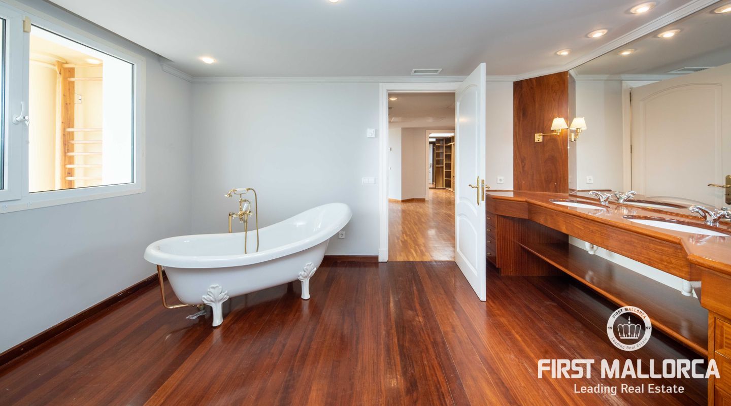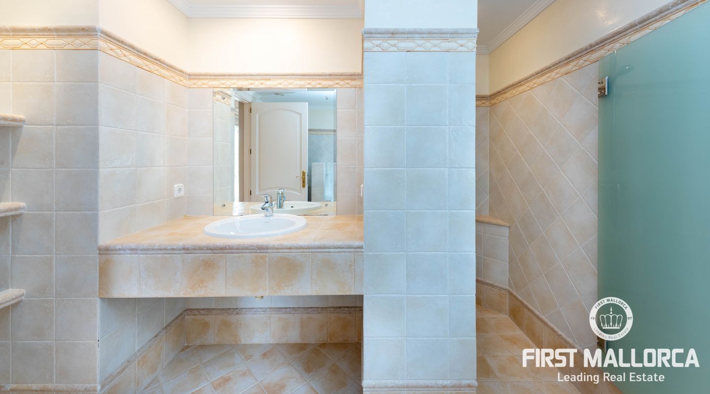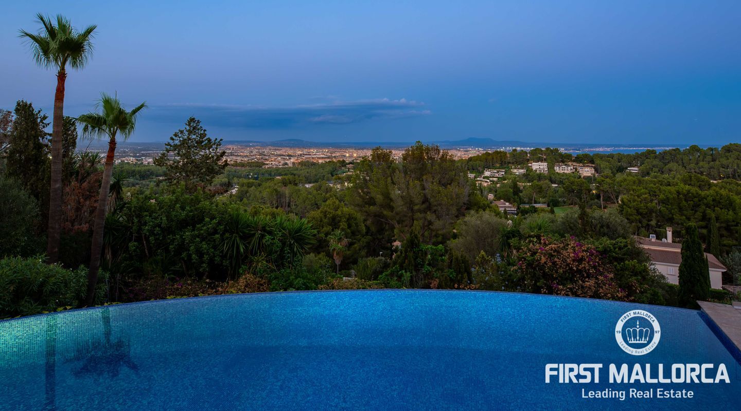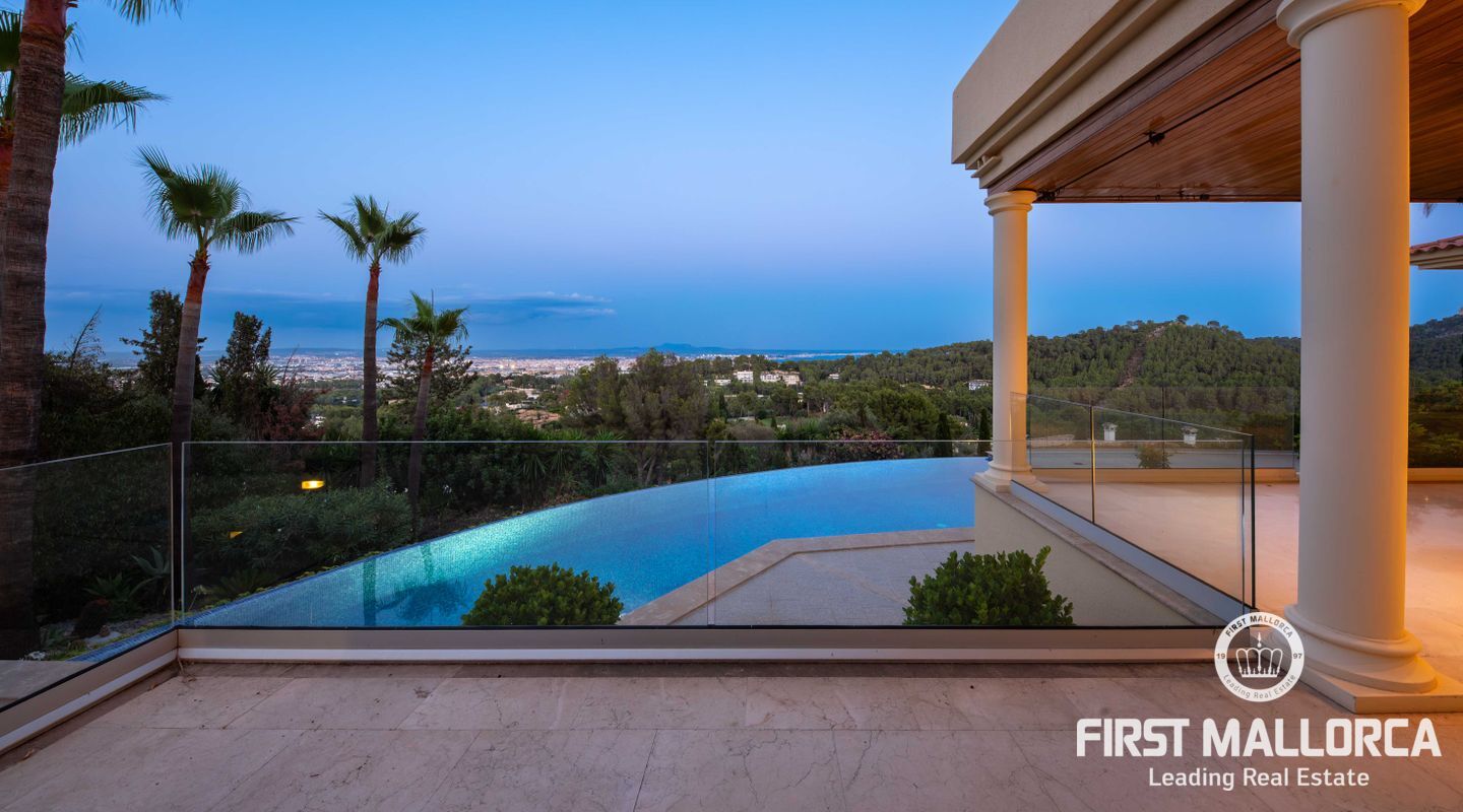 Esta elegante villa de estilo clásico se encuentra en una amplia parcela de aproximadamente 2.016 m², en una zona elevada de Son Vida. Construida en 1999 por su actual propietario, la propiedad destaca por su excelente calidad de construcción y ofrece unos 598 m² de superficie construida, con impresionantes vistas al mar y a la bahía de Palma. Un acceso privado y cómodo conduce a la majestuosa entrada principal. En la planta baja se ubican un amplio salón, dos comedores, una espaciosa cocina, aseo de cortesía y varios espacios de almacenamiento. Además, cuenta con un dormitorio de invitados con baño en suite y entrada independiente. Desde esta planta se accede a una generosa terraza cubierta, ideal para disfrutar del clima mediterráneo. La planta superior alberga un espectacular dormitorio principal con vestidor y un amplio baño en suite, junto con dos dormitorios dobles adicionales, también con baño en suite, y una estancia adicional con múltiples posibilidades de uso. Todas las habitaciones gozan de vistas panorámicas al mar. Entre otras comodidades, la villa dispone de aire acondicionado frío/calor, suelos de mármol, doble acristalamiento, trasteros, cochera para dos vehículos y un sótano que ocupa toda la superficie de la casa.