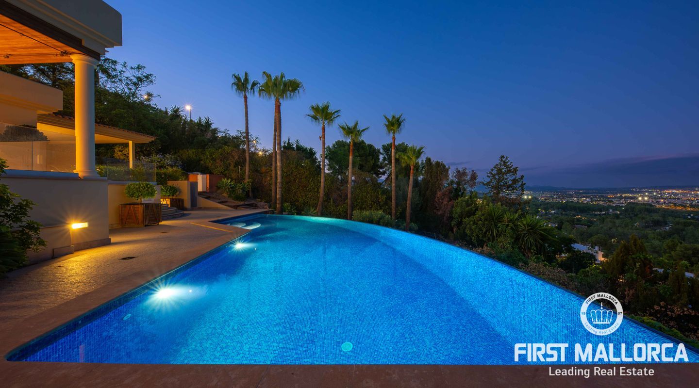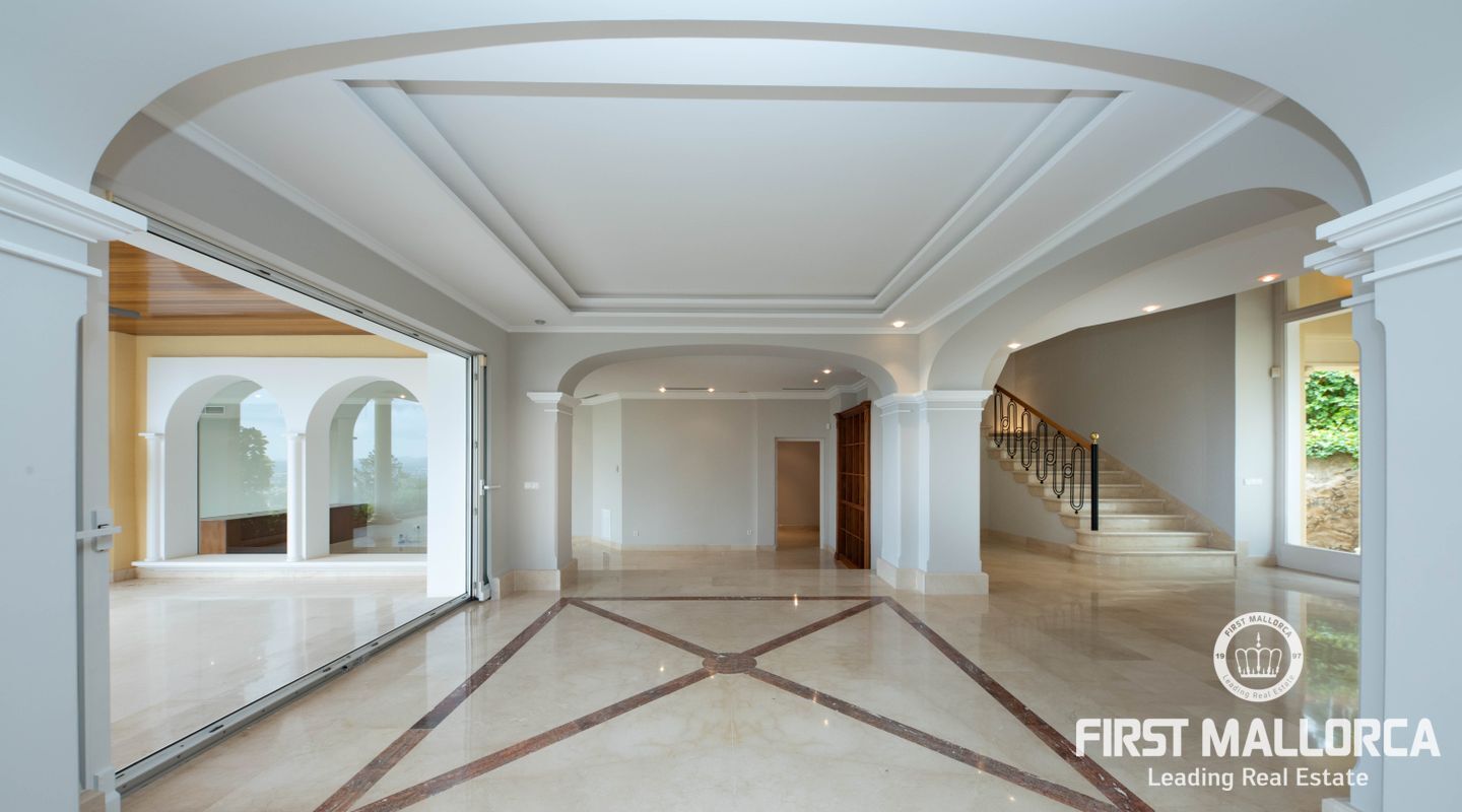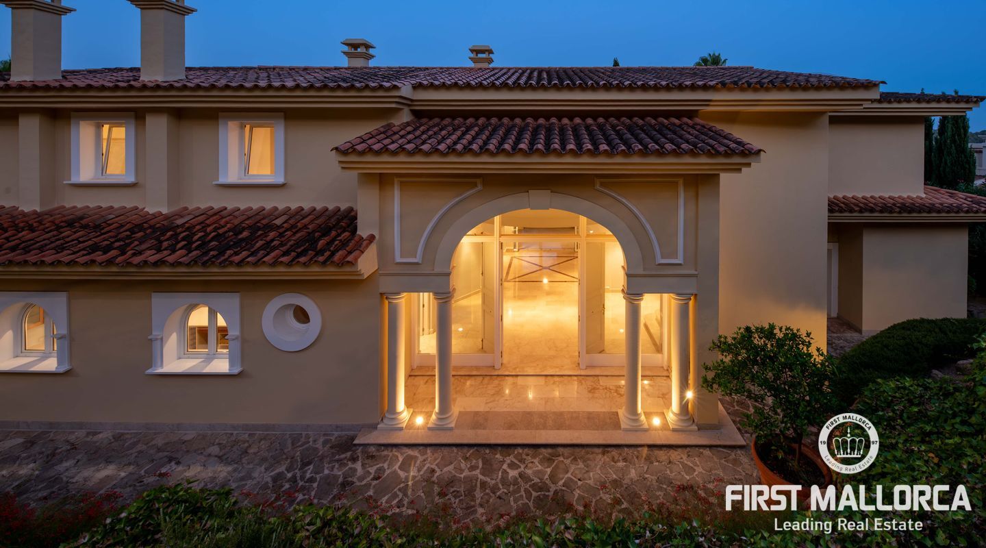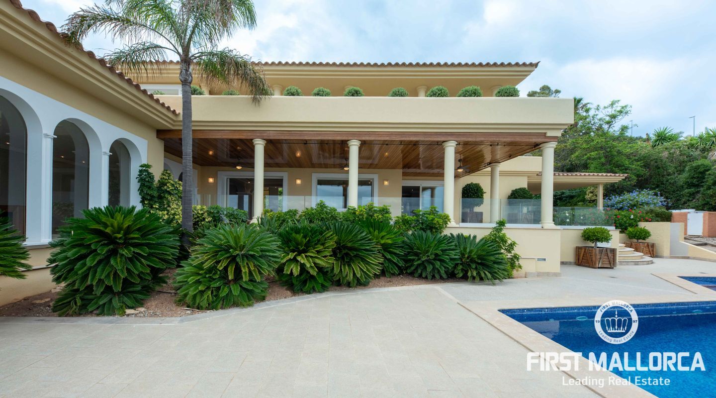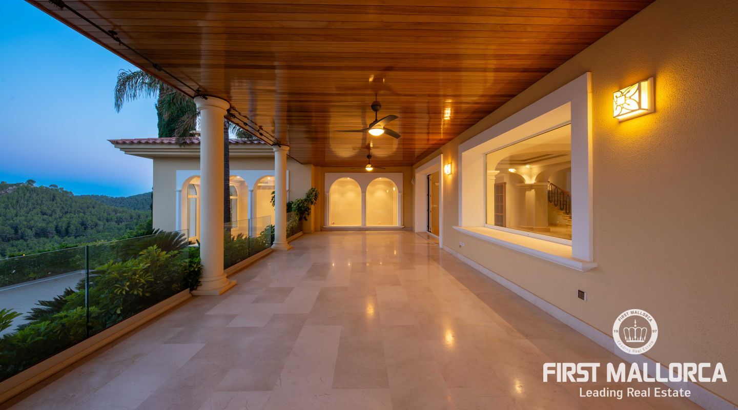 Esta elegante villa de estilo clásico se encuentra en una amplia parcela de aproximadamente 2.016 m², en una zona elevada de Son Vida. Construida en 1999 por su actual propietario, la propiedad destaca por su excelente calidad de construcción y ofrece unos 598 m² de superficie construida, con impresionantes vistas al mar y a la bahía de Palma. Un acceso privado y cómodo conduce a la majestuosa entrada principal. En la planta baja se ubican un amplio salón, dos comedores, una espaciosa cocina, aseo de cortesía y varios espacios de almacenamiento. Además, cuenta con un dormitorio de invitados con baño en suite y entrada independiente. Desde esta planta se accede a una generosa terraza cubierta, ideal para disfrutar del clima mediterráneo. La planta superior alberga un espectacular dormitorio principal con vestidor y un amplio baño en suite, junto con dos dormitorios dobles adicionales, también con baño en suite, y una estancia adicional con múltiples posibilidades de uso. Todas las habitaciones gozan de vistas panorámicas al mar. Entre otras comodidades, la villa dispone de aire acondicionado frío/calor, suelos de mármol, doble acristalamiento, trasteros, cochera para dos vehículos y un sótano que ocupa toda la superficie de la casa.