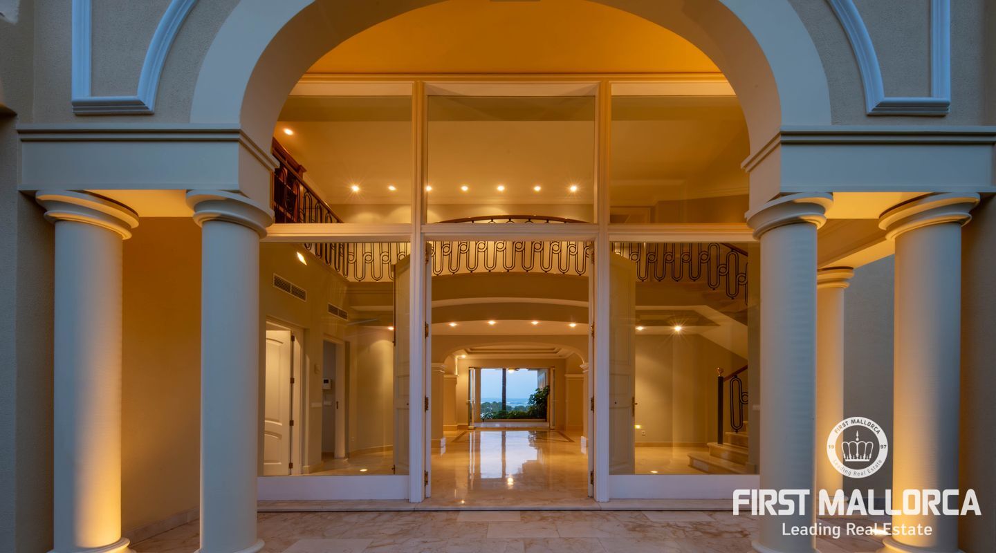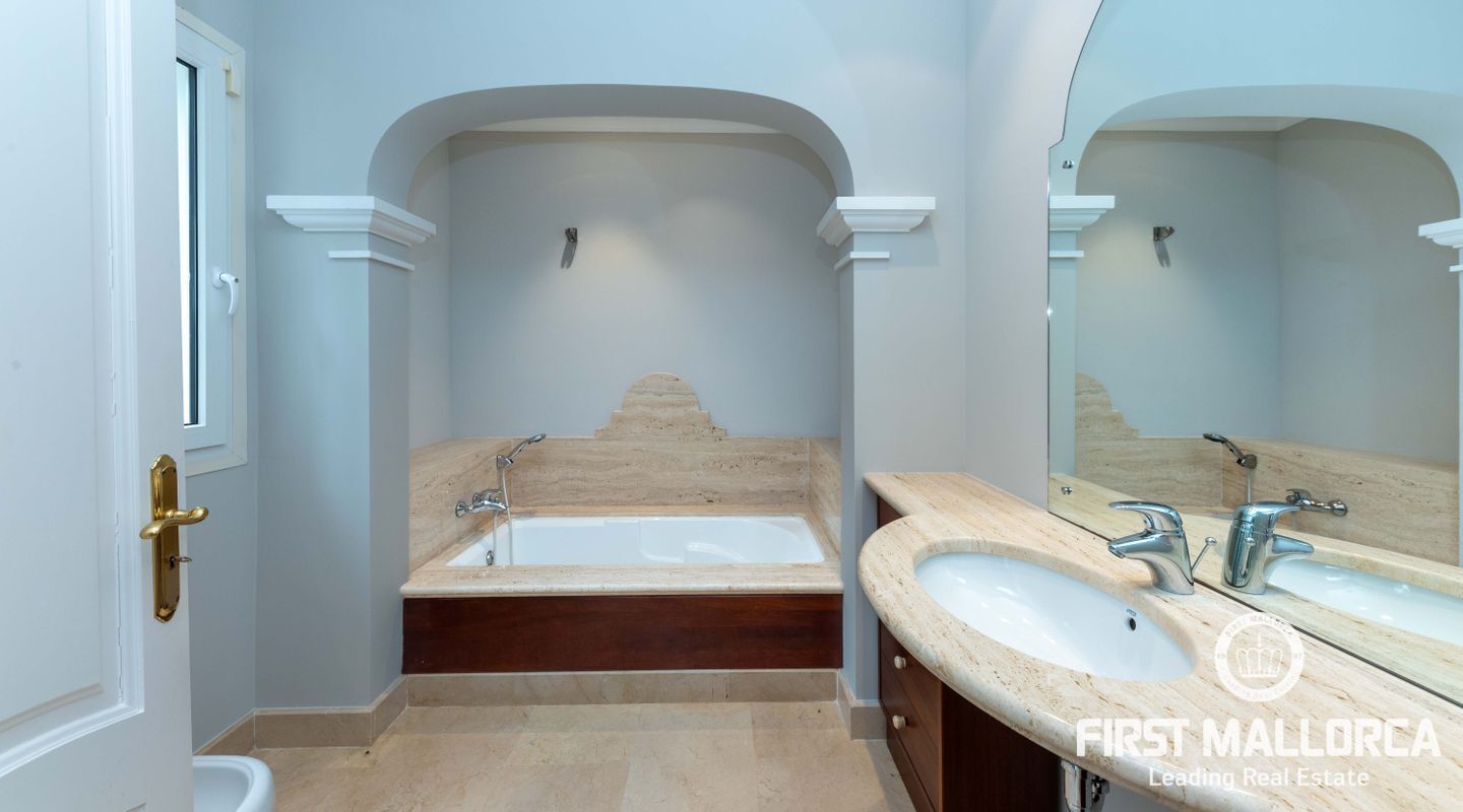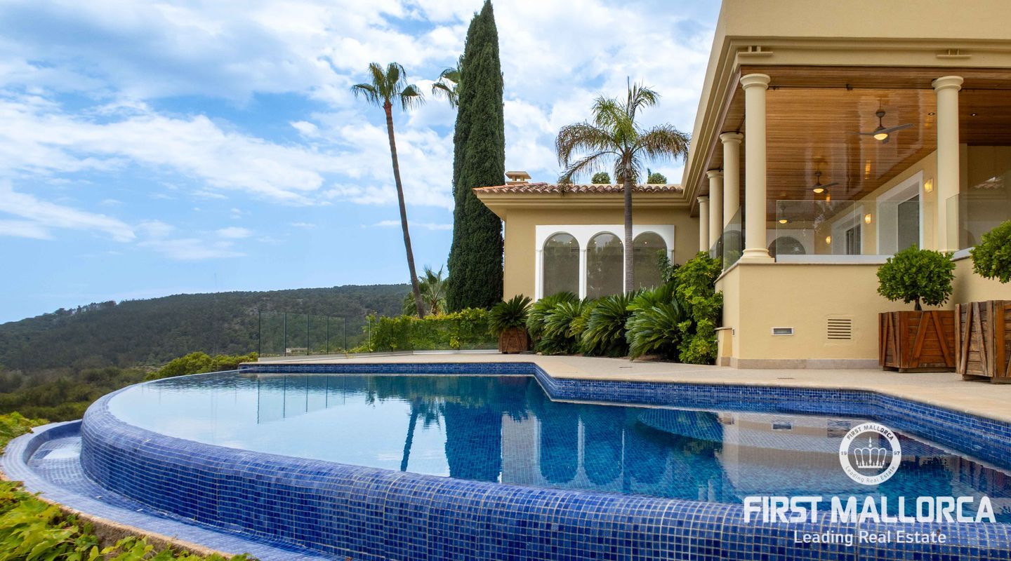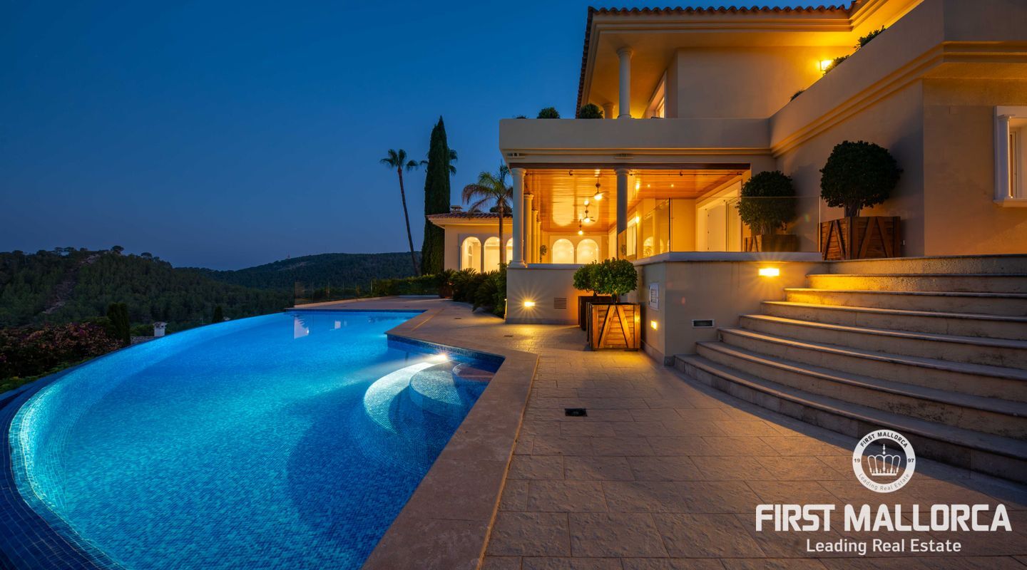 Esta elegante villa de estilo clásico se encuentra en una amplia parcela de aproximadamente 2.016 m², en una zona elevada de Son Vida. Construida en 1999 por su actual propietario, la propiedad destaca por su excelente calidad de construcción y ofrece unos 598 m² de superficie construida, con impresionantes vistas al mar y a la bahía de Palma. Un acceso privado y cómodo conduce a la majestuosa entrada principal. En la planta baja se ubican un amplio salón, dos comedores, una espaciosa cocina, aseo de cortesía y varios espacios de almacenamiento. Además, cuenta con un dormitorio de invitados con baño en suite y entrada independiente. Desde esta planta se accede a una generosa terraza cubierta, ideal para disfrutar del clima mediterráneo. La planta superior alberga un espectacular dormitorio principal con vestidor y un amplio baño en suite, junto con dos dormitorios dobles adicionales, también con baño en suite, y una estancia adicional con múltiples posibilidades de uso. Todas las habitaciones gozan de vistas panorámicas al mar. Entre otras comodidades, la villa dispone de aire acondicionado frío/calor, suelos de mármol, doble acristalamiento, trasteros, cochera para dos vehículos y un sótano que ocupa toda la superficie de la casa.