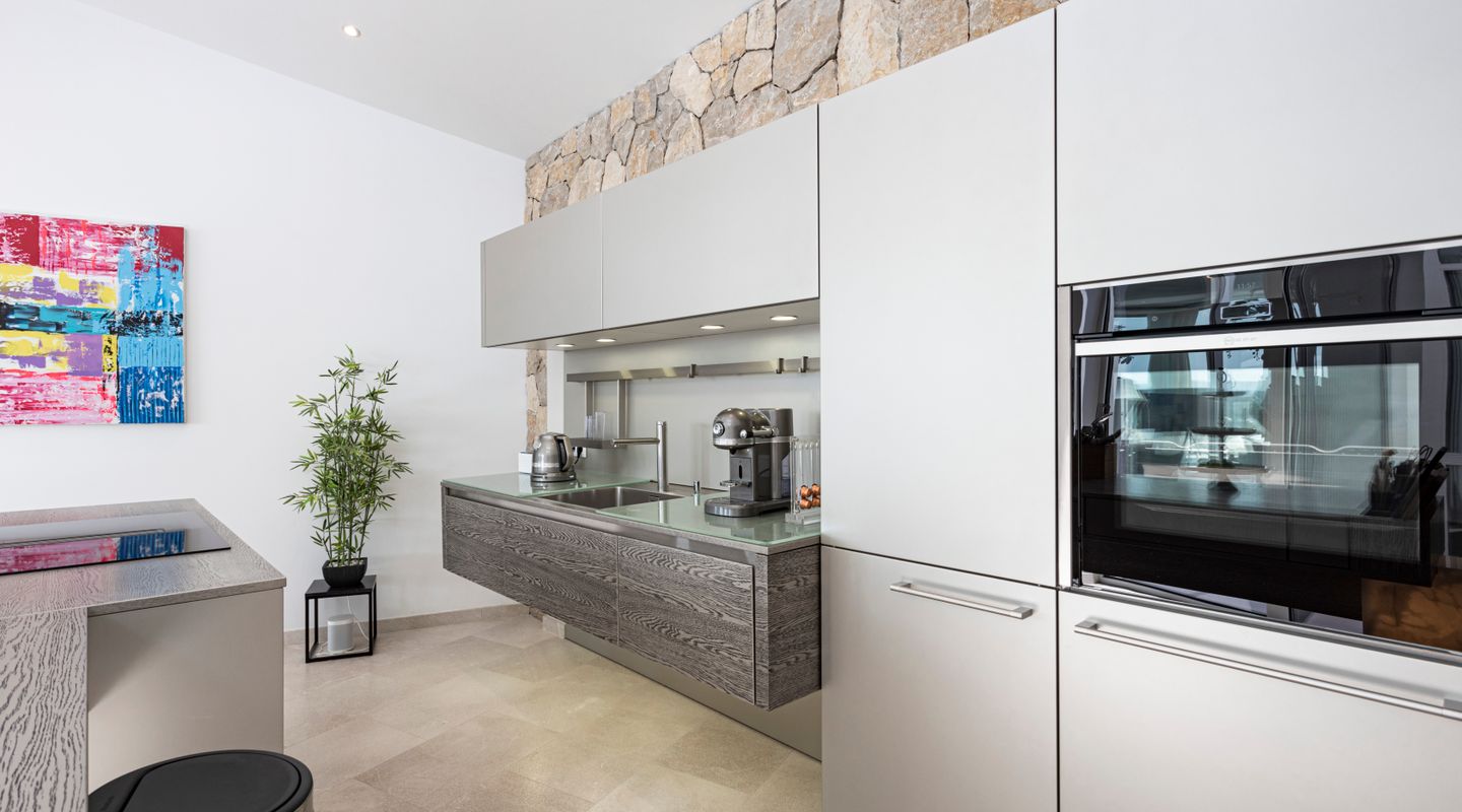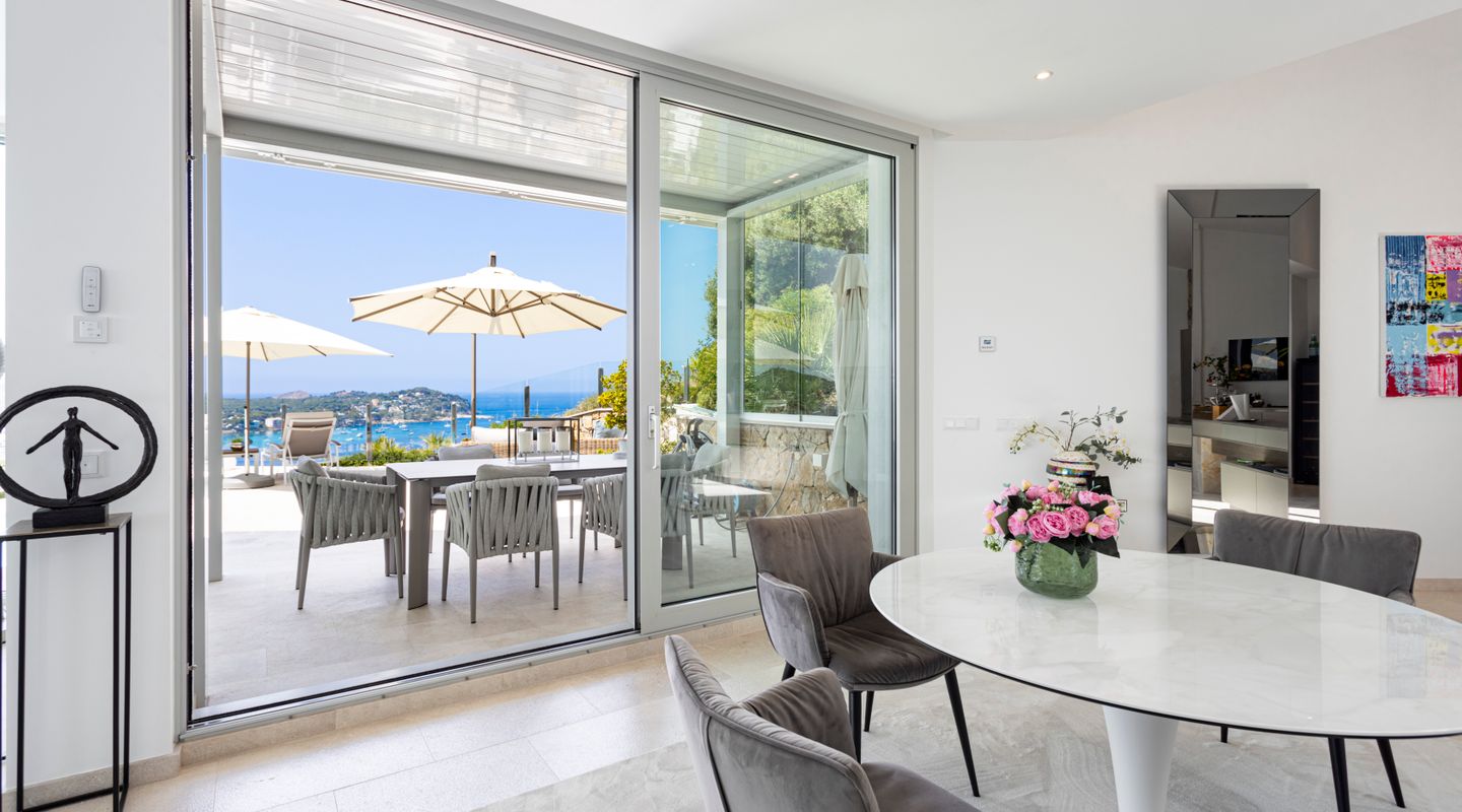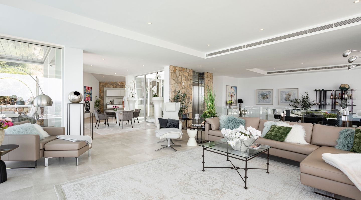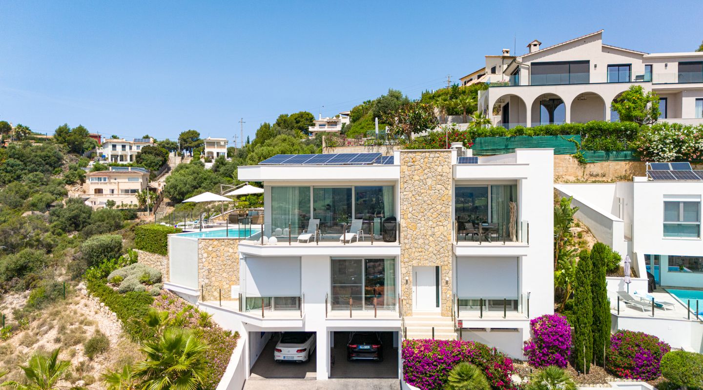 Impresionantes vistas panorámicas al mar y abundante luz natural crean un ambiente luminoso, abierto y acogedor en toda la casa. La propiedad está equipada con aire acondicionado frío/calor y calefacción por suelo radiante, así como con un sistema solar con almacenamiento en batería y persianas exteriores totalmente automáticas. Un sistema domótico de última generación permite controlar cómodamente la iluminación, la climatización y otras funciones del hogar, garantizando el máximo confort y eficiencia.