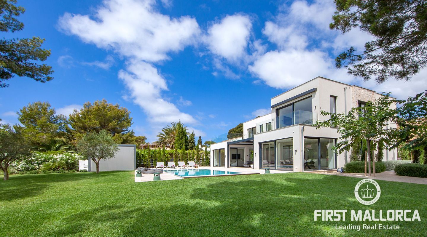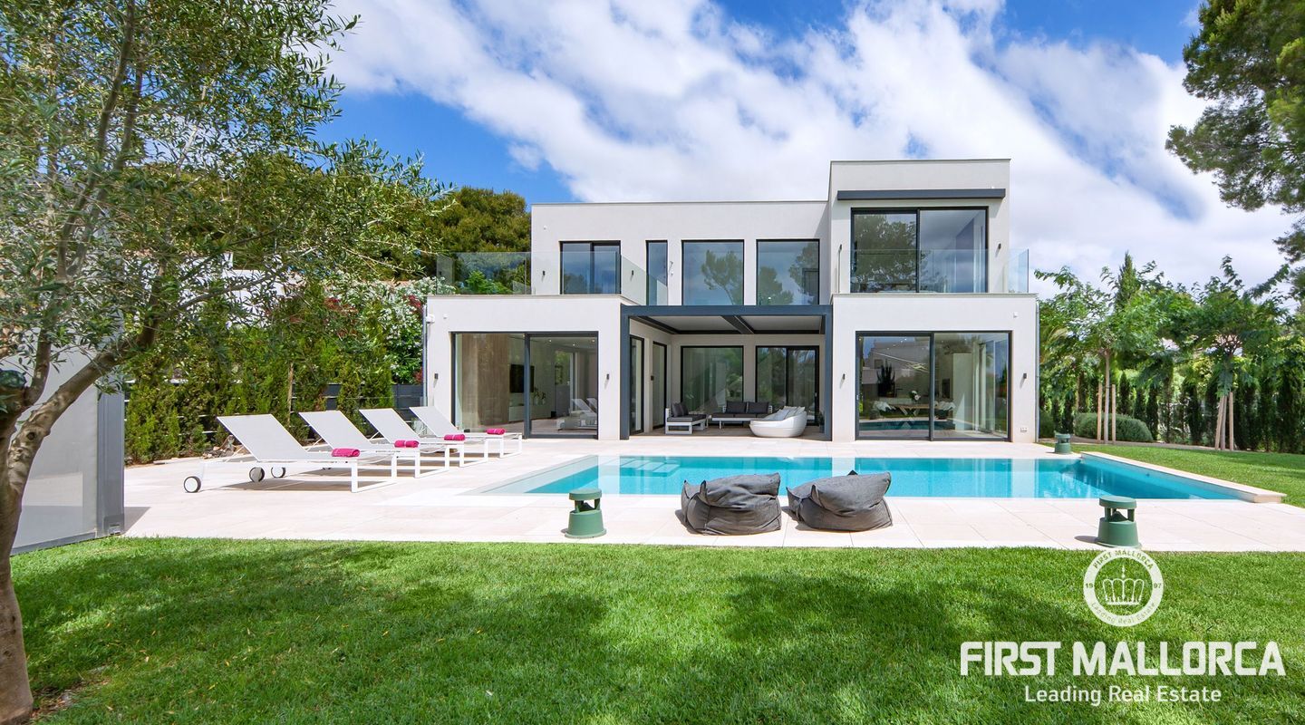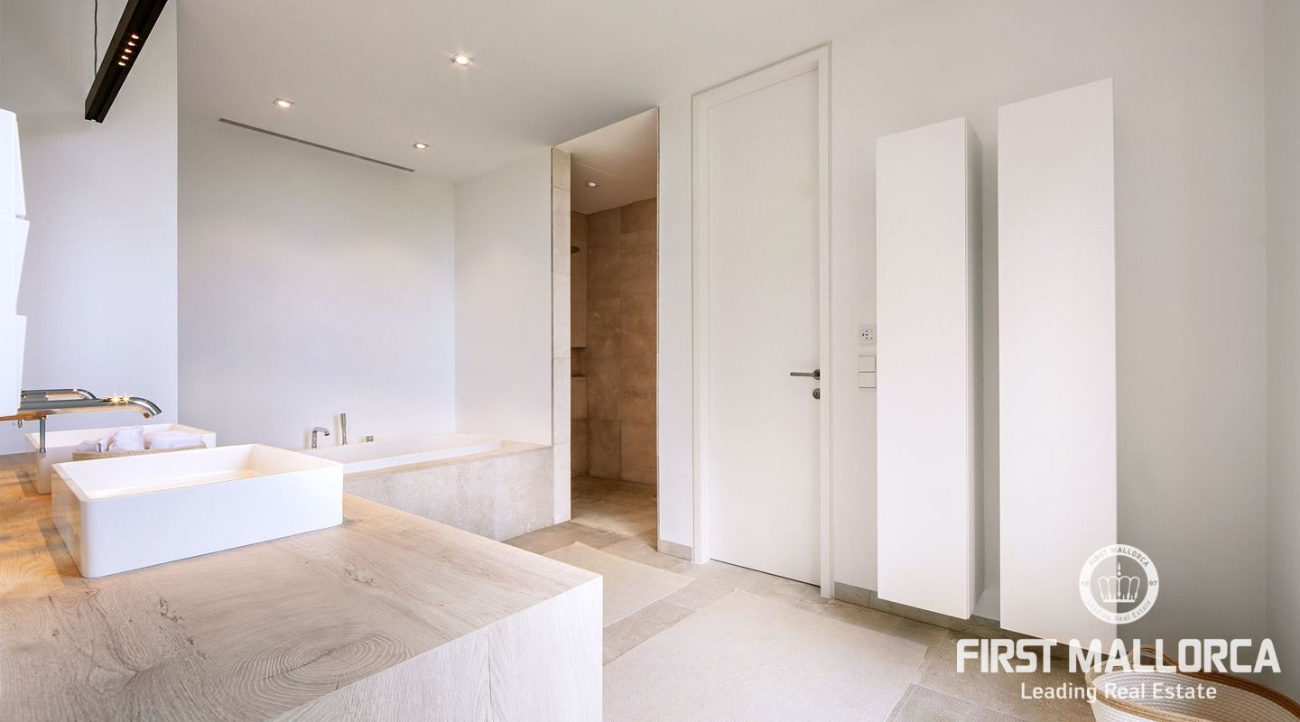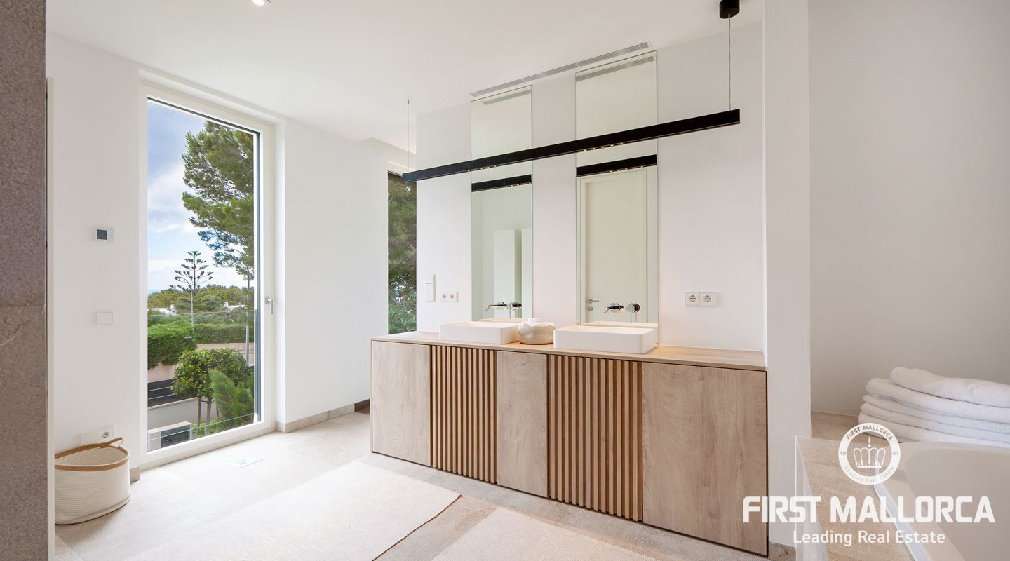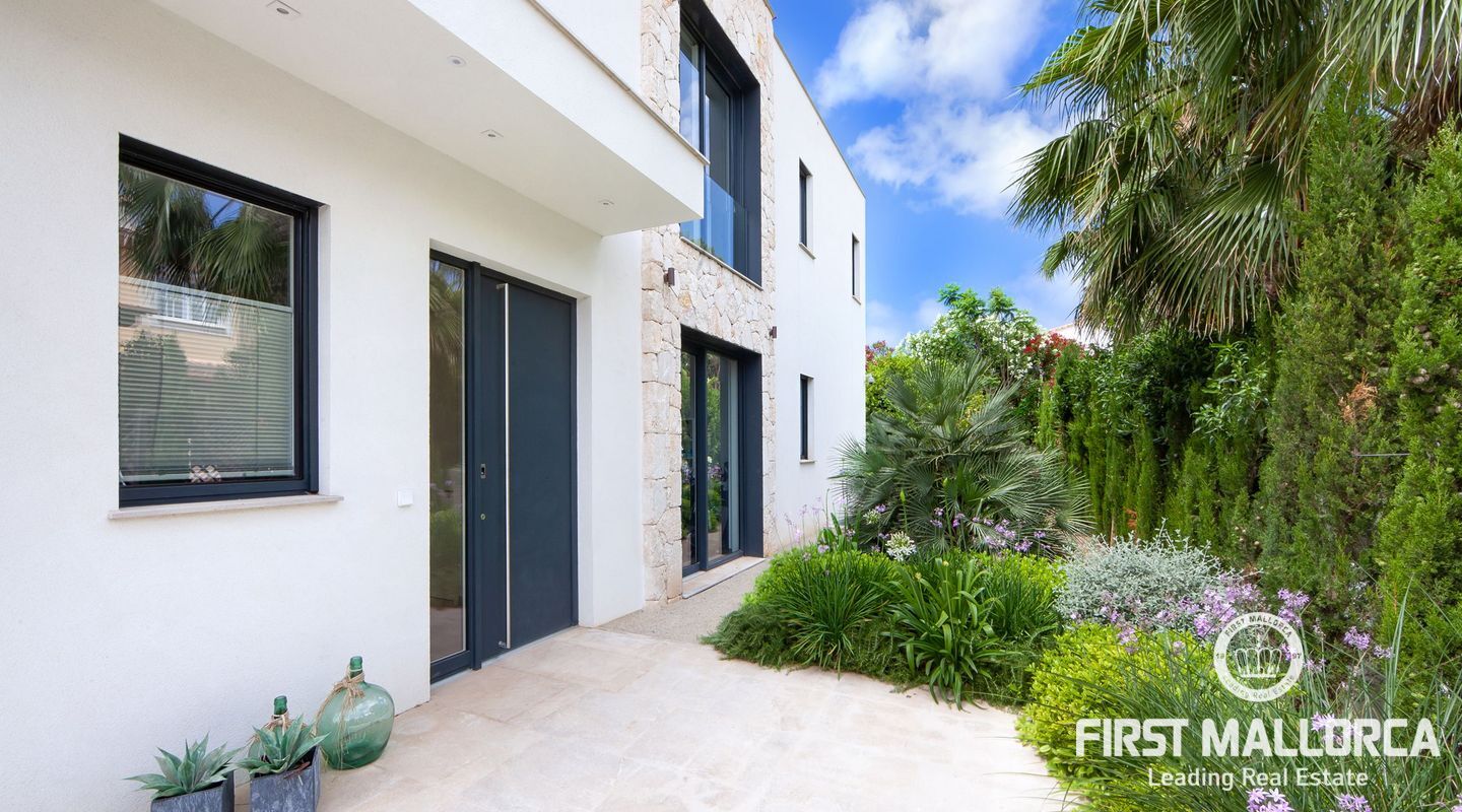 Esta nueva moderna villa de lujo combinada con el encanto mediterráneo ofrece una gran orientación soleada y un confort de vida incomparable con habitaciones luminosas y está situada en Sol de Mallorca, en el hermoso suroeste de la isla. En tres niveles, perfectamente conectados con un ascensor, encontrará 5 amplios dormitorios y 5 baños, así como un apartamento adicional en el sótano. La propiedad ofrece materiales de alta calidad y está equipada con una cocina de diseño moderno con isla y despensa. La zona exterior soleada y cubierta invita a relajarse y a disfrutar de la gran piscina de agua salada.