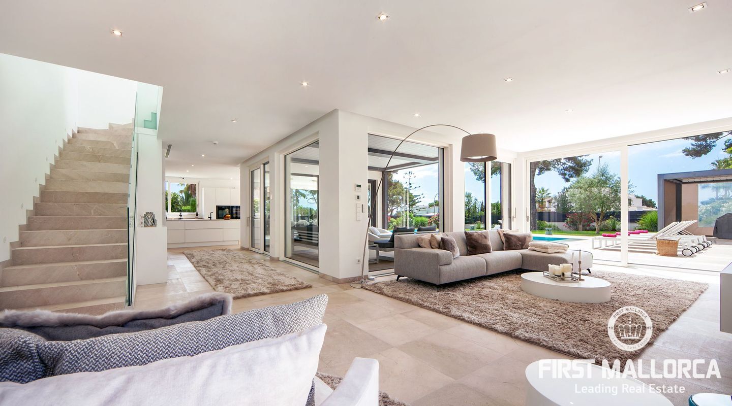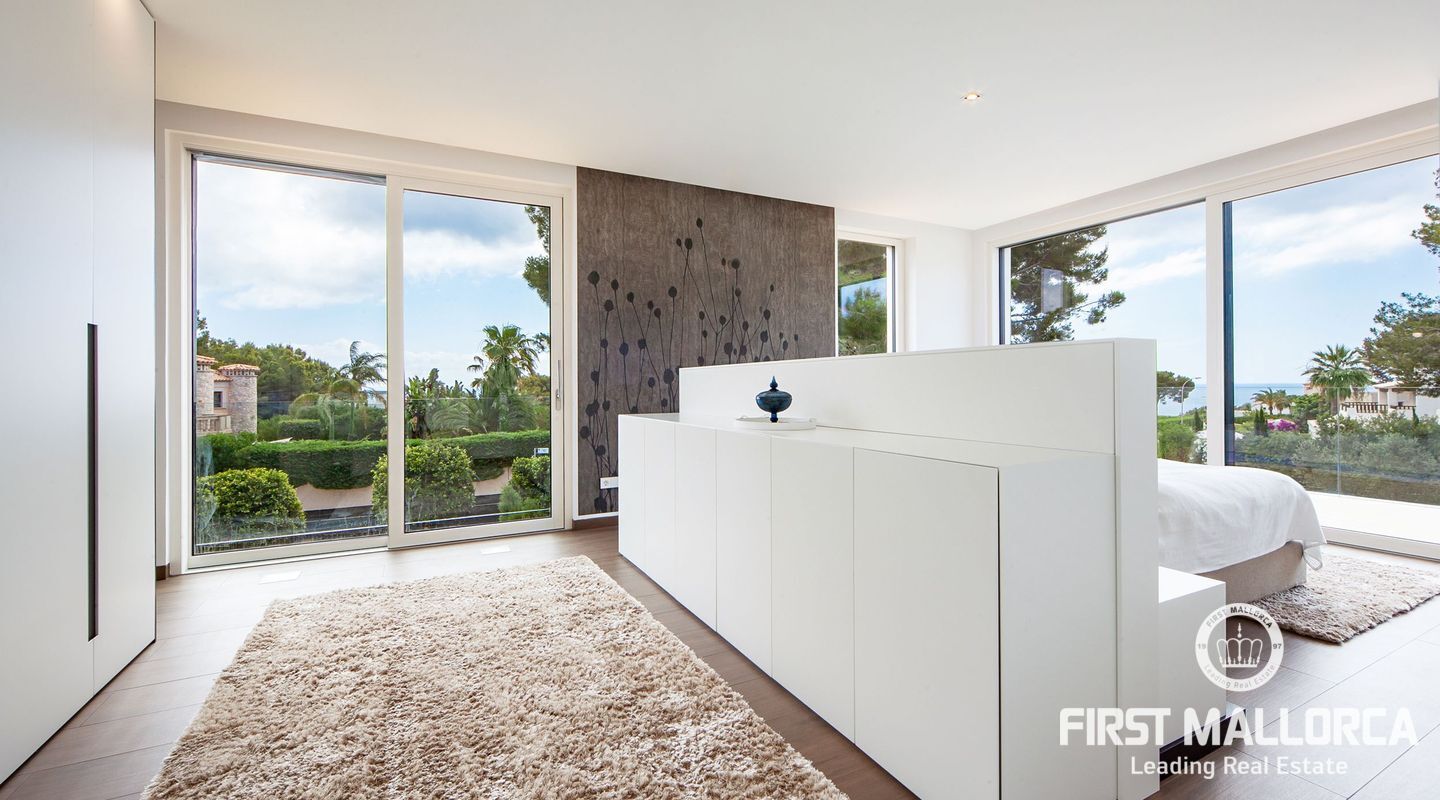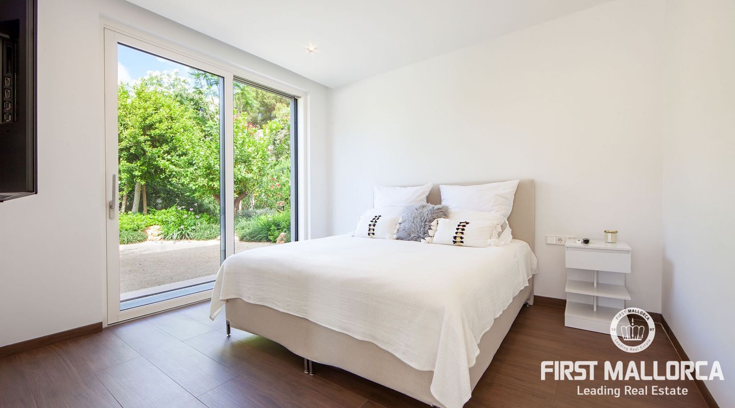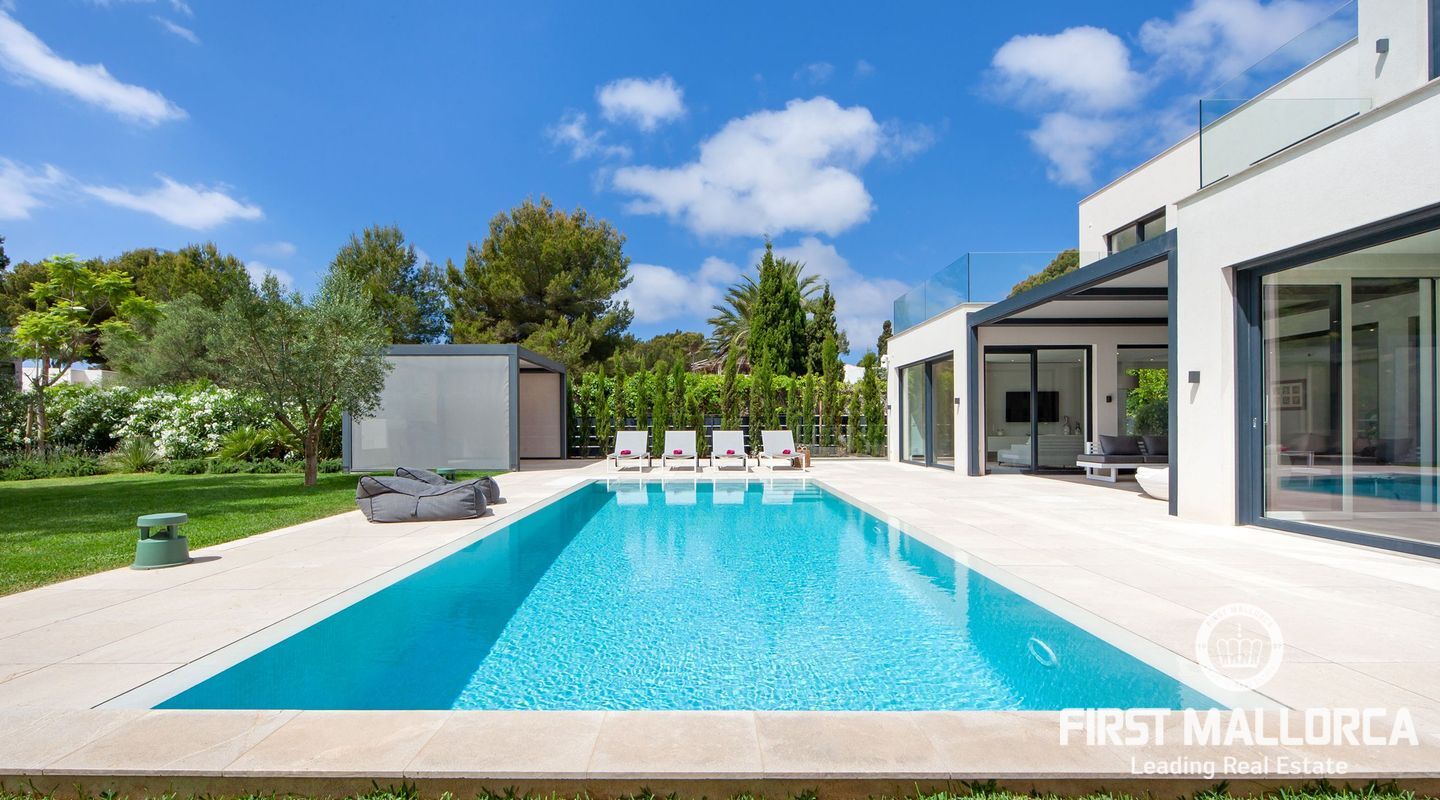 Esta nueva moderna villa de lujo combinada con el encanto mediterráneo ofrece una gran orientación soleada y un confort de vida incomparable con habitaciones luminosas y está situada en Sol de Mallorca, en el hermoso suroeste de la isla. En tres niveles, perfectamente conectados con un ascensor, encontrará 5 amplios dormitorios y 5 baños, así como un apartamento adicional en el sótano. La propiedad ofrece materiales de alta calidad y está equipada con una cocina de diseño moderno con isla y despensa. La zona exterior soleada y cubierta invita a relajarse y a disfrutar de la gran piscina de agua salada.