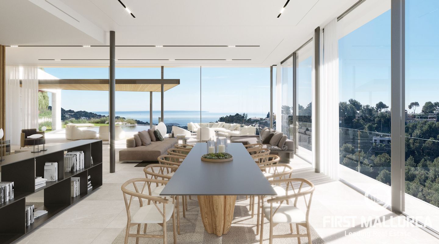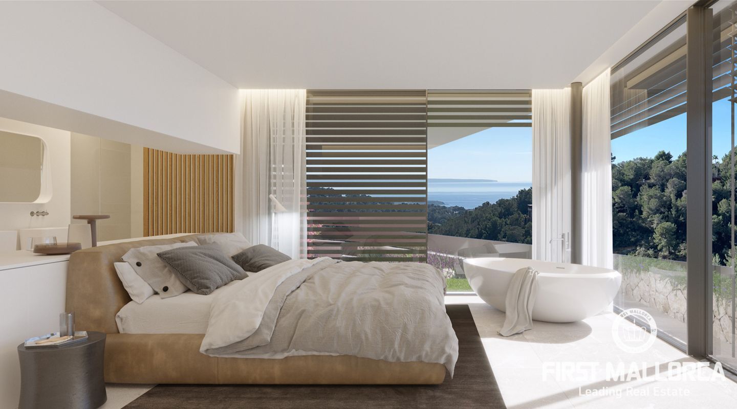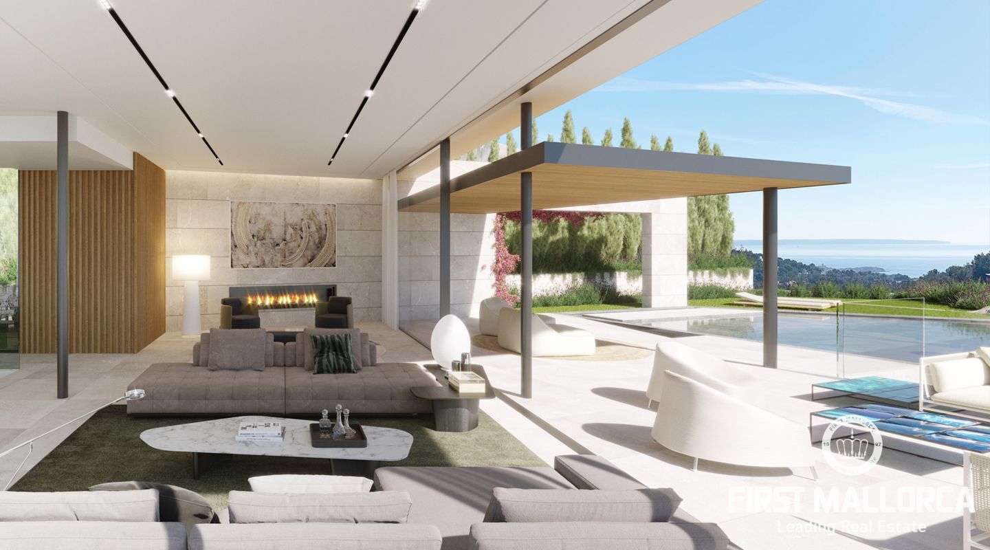 Este moderno chalet de nueva construcción con vistas al mar está listo para entrar a vivir. En la planta superior, a la que se accede a través de un ascensor que sube hasta el garaje, se encuentra el luminoso salón-comedor con ventanales de suelo a techo con transición sin barreras a las terrazas y a la amplia piscina de 57 m². La cocina totalmente equipada ofrece una zona de terraza cubierta, ideal para desayunar. En la planta baja, a la que se puede acceder por las escaleras o el ascensor, hay cuatro dormitorios dobles, cada uno con baño en suite totalmente equipado y amplios armarios empotrados. Un quinto dormitorio adicional con baño en-suite se encuentra en la planta baja, que también ofrece un amplio espacio para una sala de fitness. Características de la villa incluyen: Ascensor, calefacción por suelo radiante, aire acondicionado (frío/calor), un garaje doble y una plaza de aparcamiento exterior adicional. El mobiliario se puede adquirir por separado bajo petición. Si desea concertar una visita personal, no dude en ponerse en contacto con una de nuestras oficinas de FIRST MALLRCA hoy mismo.