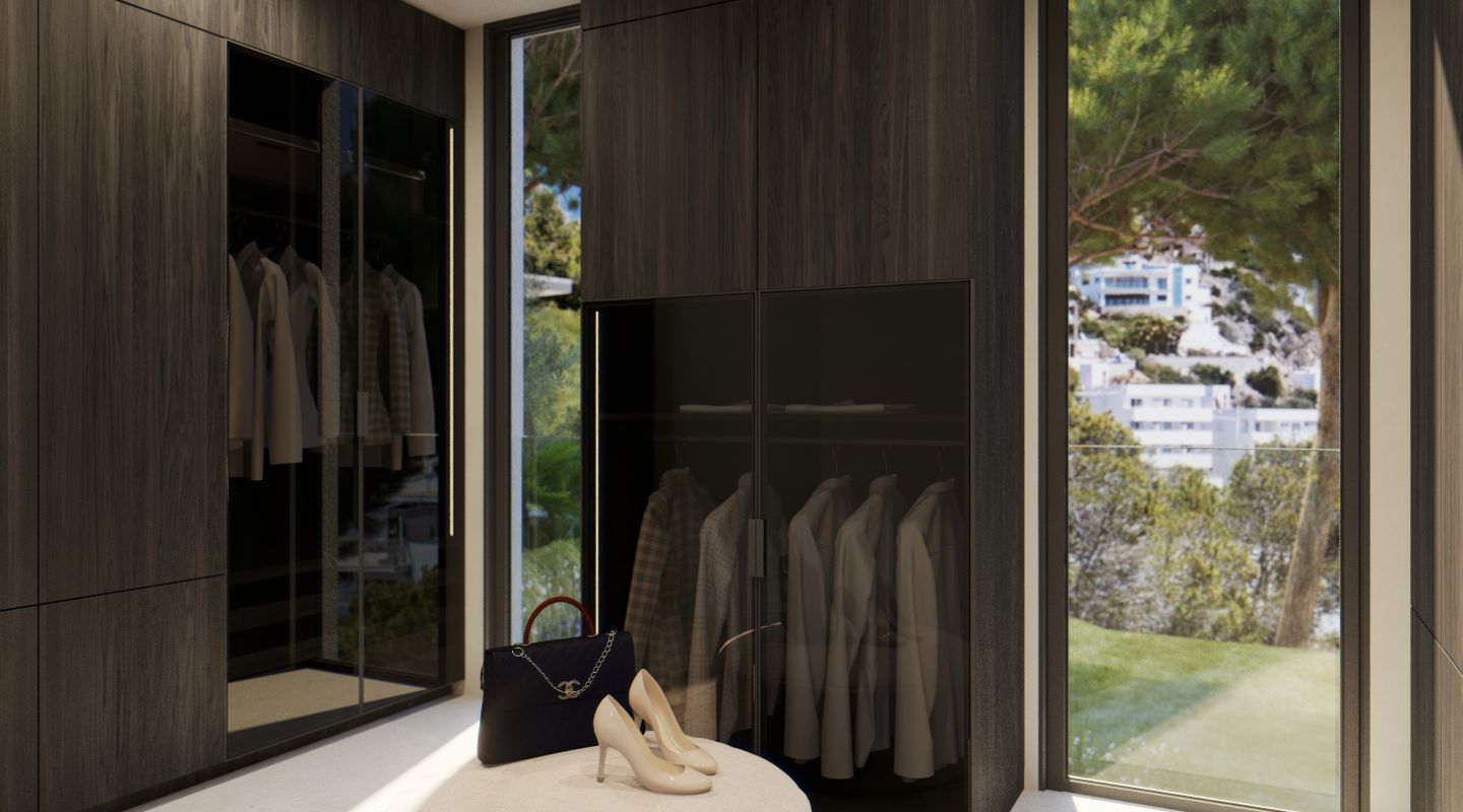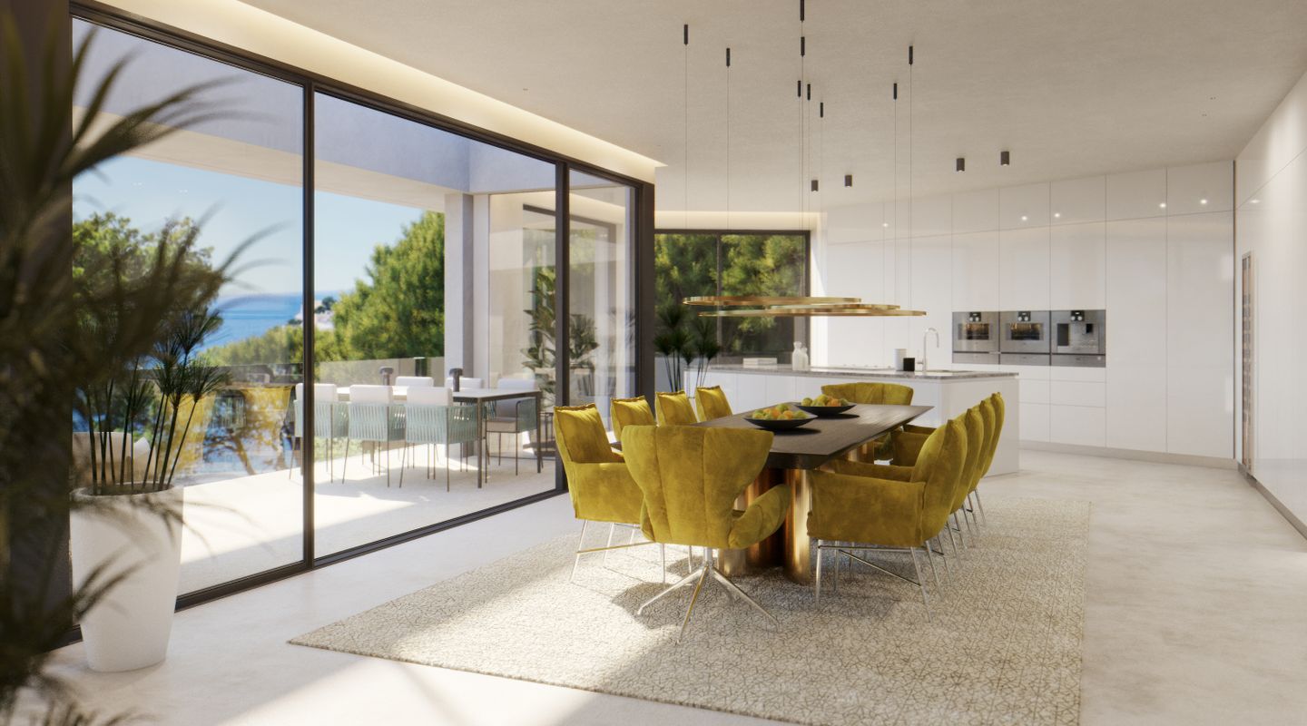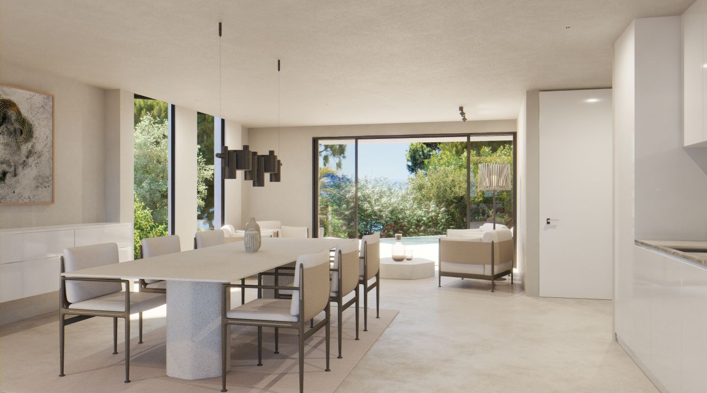 En el interior, la villa recibe con un amplio diseño de planta abierta, donde los ventanales de suelo a techo crean una conexión perfecta entre los espacios interiores y exteriores. Las zonas de estar y comedor fluyen de manera armoniosa hacia una cocina de diseño, equipada con electrodomésticos de última generación y acabada con un cuidado meticuloso en cada detalle. Los cuatro dormitorios en suite son de generosas dimensiones, cada uno con su propio baño y vestidor, concebidos para ofrecer tanto lujo como privacidad. En total, la villa dispone de seis elegantes baños, todos con acabados de primera calidad que combinan estilo y funcionalidad.
