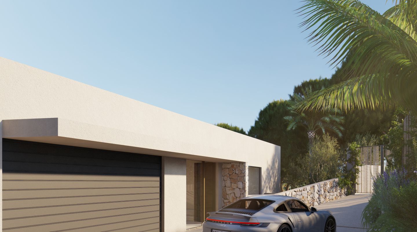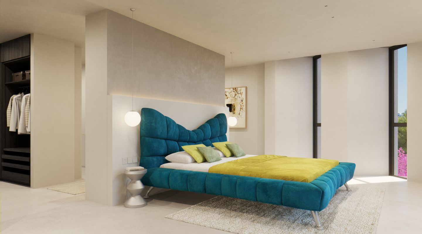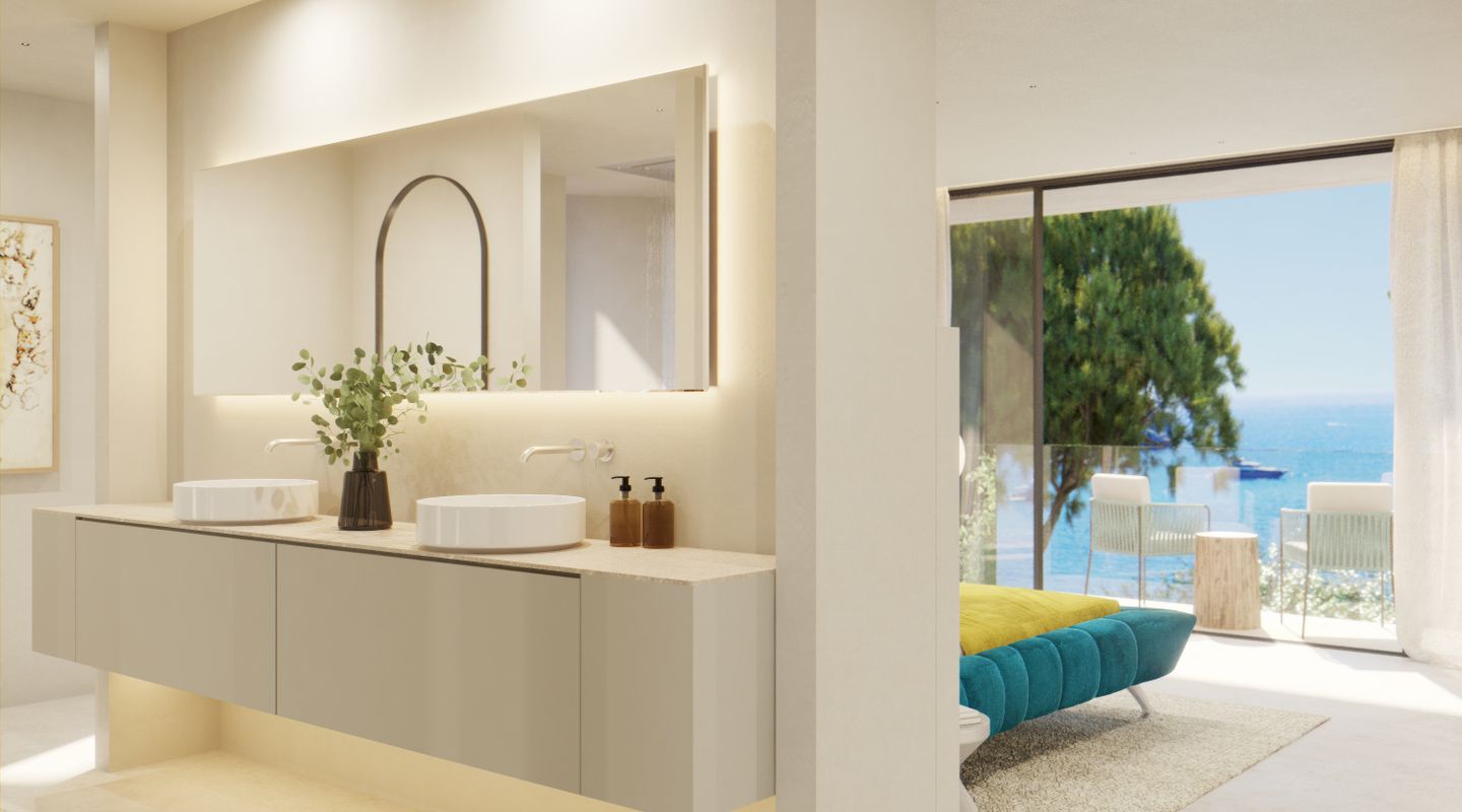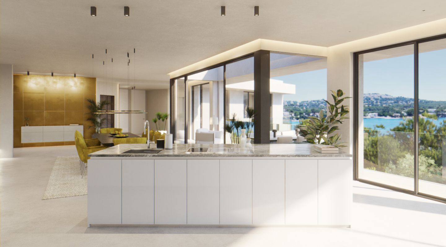 En el interior, la villa recibe con un amplio diseño de planta abierta, donde los ventanales de suelo a techo crean una conexión perfecta entre los espacios interiores y exteriores. Las zonas de estar y comedor fluyen de manera armoniosa hacia una cocina de diseño, equipada con electrodomésticos de última generación y acabada con un cuidado meticuloso en cada detalle. Los cuatro dormitorios en suite son de generosas dimensiones, cada uno con su propio baño y vestidor, concebidos para ofrecer tanto lujo como privacidad. En total, la villa dispone de seis elegantes baños, todos con acabados de primera calidad que combinan estilo y funcionalidad.