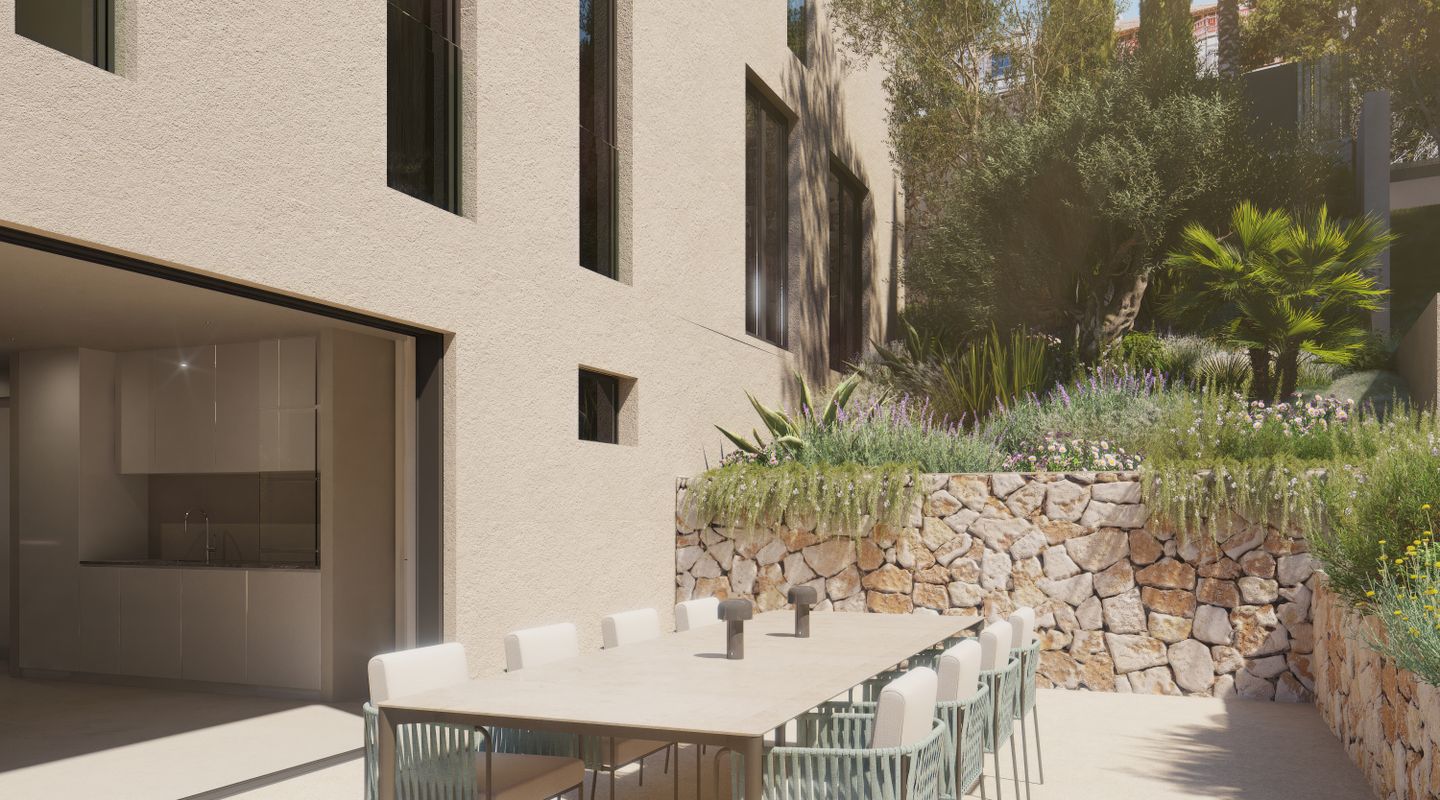 La vida al aire libre es el verdadero corazón de esta propiedad. Las amplias terrazas invitan a disfrutar del sol mallorquín durante todo el año, mientras que la piscina infinita se integra de manera impecable en la arquitectura y el diseño del jardín. Rodeada de muros de piedra natural, vegetación mediterránea y zonas de estar sombreadas, la terraza de la piscina se convierte en el lugar ideal tanto para relajarse como para recibir invitados.