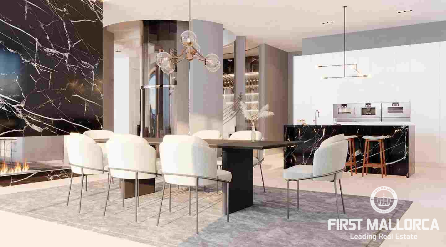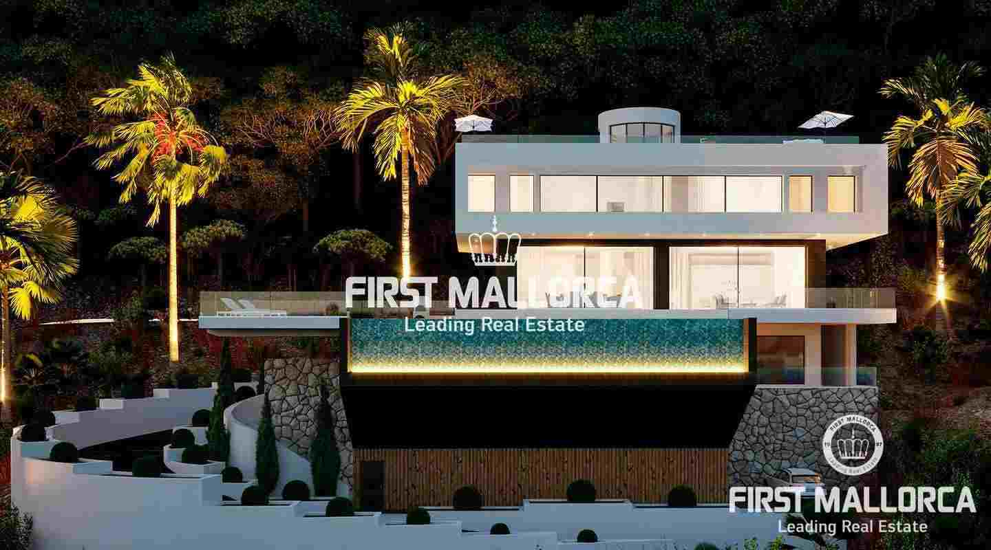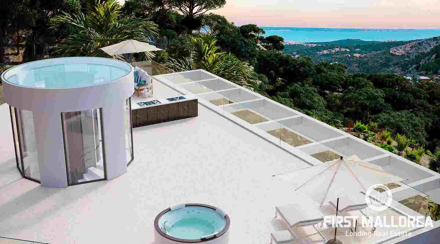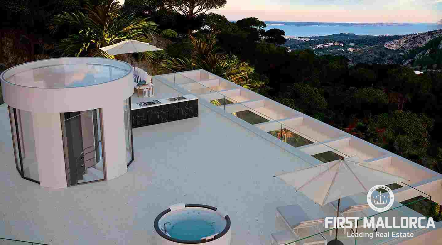 La villa goza de un elegante diseño y un interior bañado en luz y se construyó con nobles materiales de primera calidad, como suelos de piedra natural y tecnologías de vanguardia. Amplias terrazas, una de ellas en la azotea, invitan a relajarse y tomar el sol. Esta propiedad de lujo en Mallorca cuenta con exclusivas características como ascensor, garaje doble, piscina climatizada exterior, home-cinema y una zona de spa, con piscina cubierta, gimnasio, sauna y baño de vapor. Calefacción por suelo radiante, aire acondicionado y una chimenea garantizan temperaturas agradables durante todo el año.