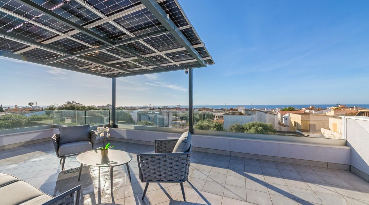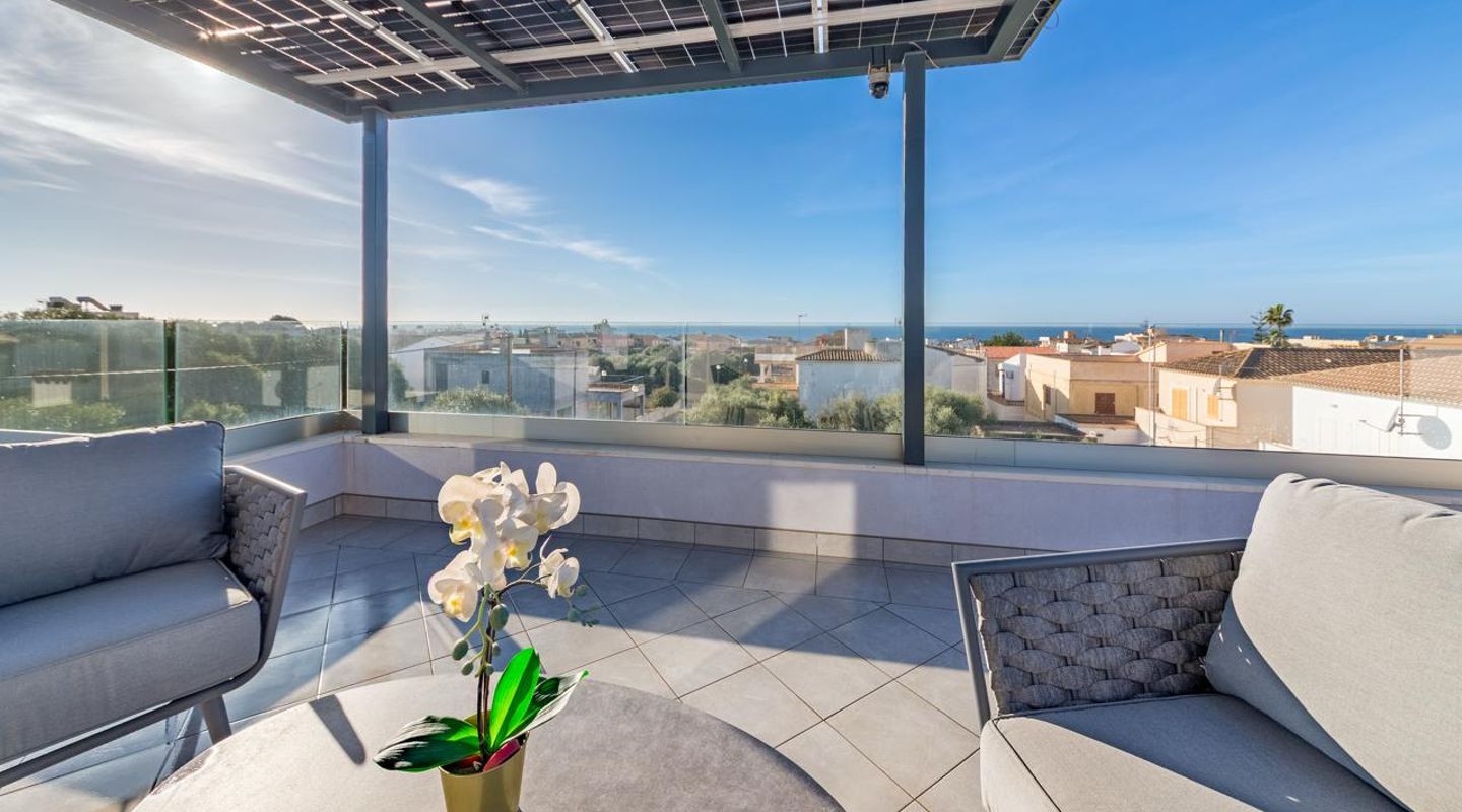 Además de la acogedora zona de piscina, otro de los puntos destacados es la azotea con zona de estar cubierta y unas impresionantes vistas al mar, a la isla de Cabrera y a las montañas.