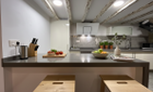 Нижний этаж: современная кухня с техникой премиум-класса, бар для завтраков, обеденная зона и открытая гостиная, полностью меблирована.