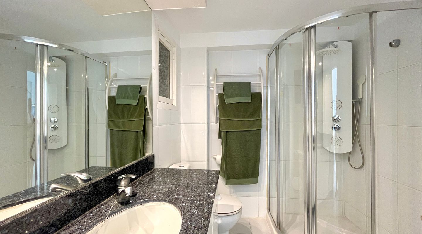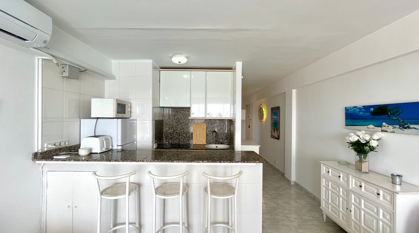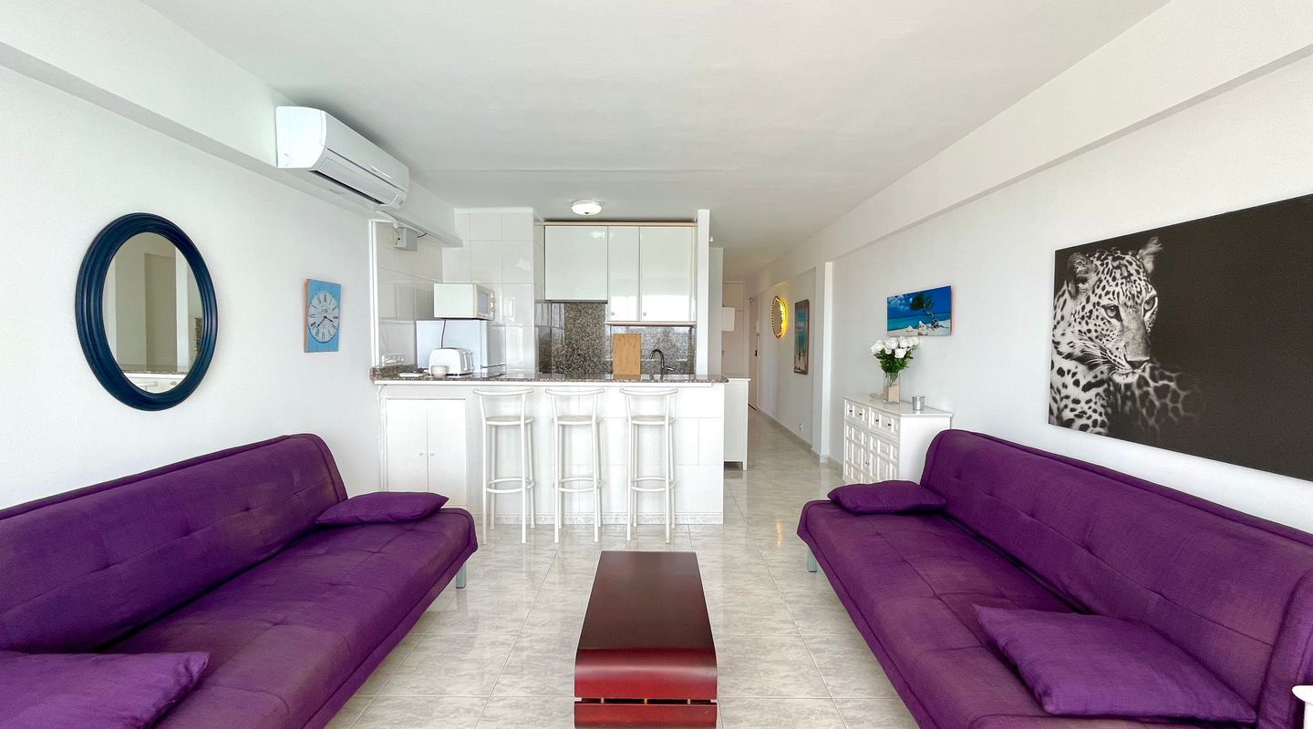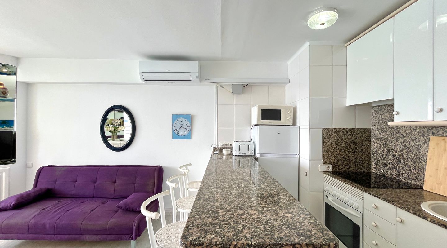 Недвижимость включает гостиную-столовую с открытой полностью оборудованной кухней, крытую (открывающуюся) террасу, одну спальню с двуспальной кроватью и ванную комнату с душем, стиральной и сушильной машинами. Полностью готова к заселению!