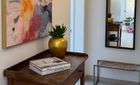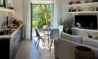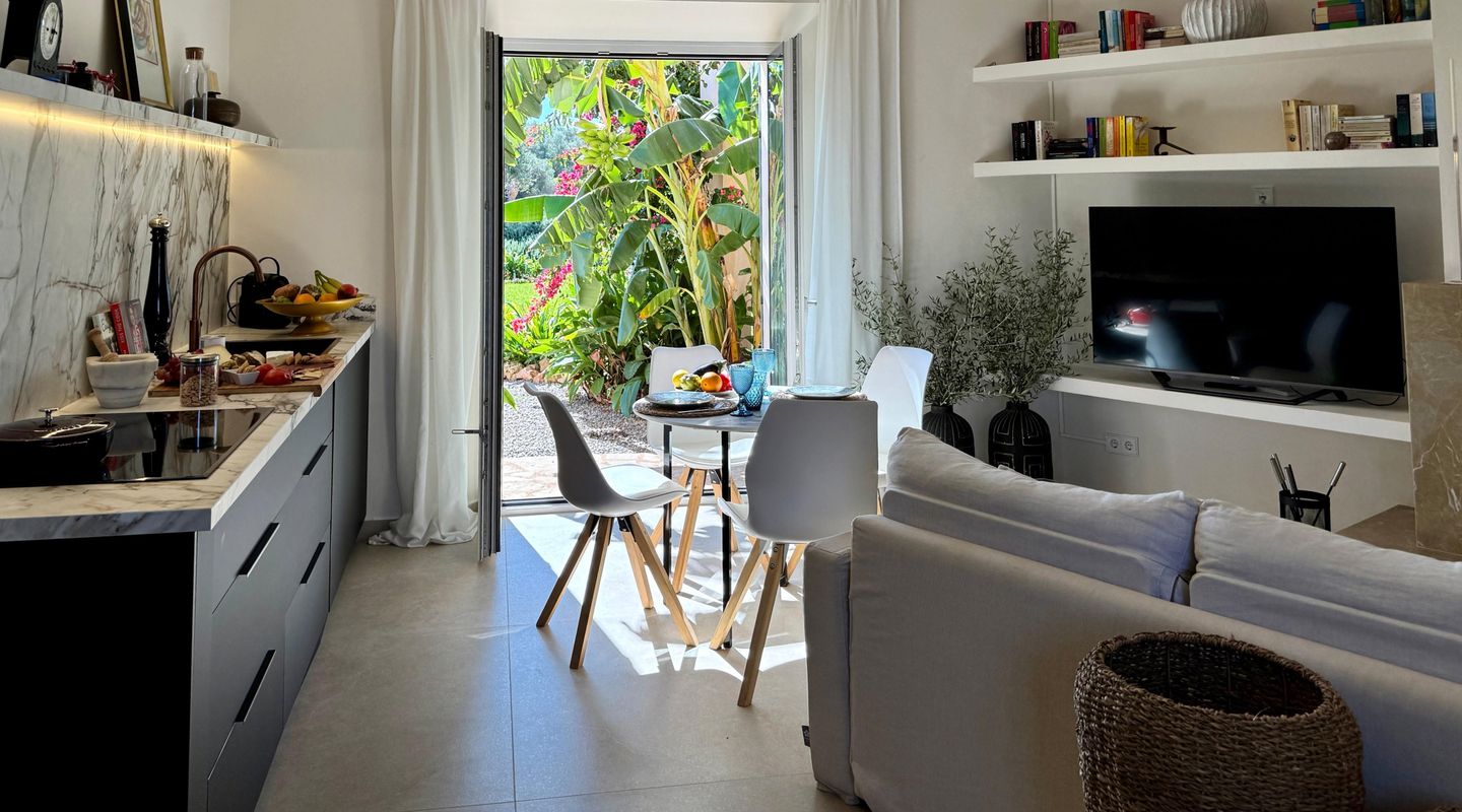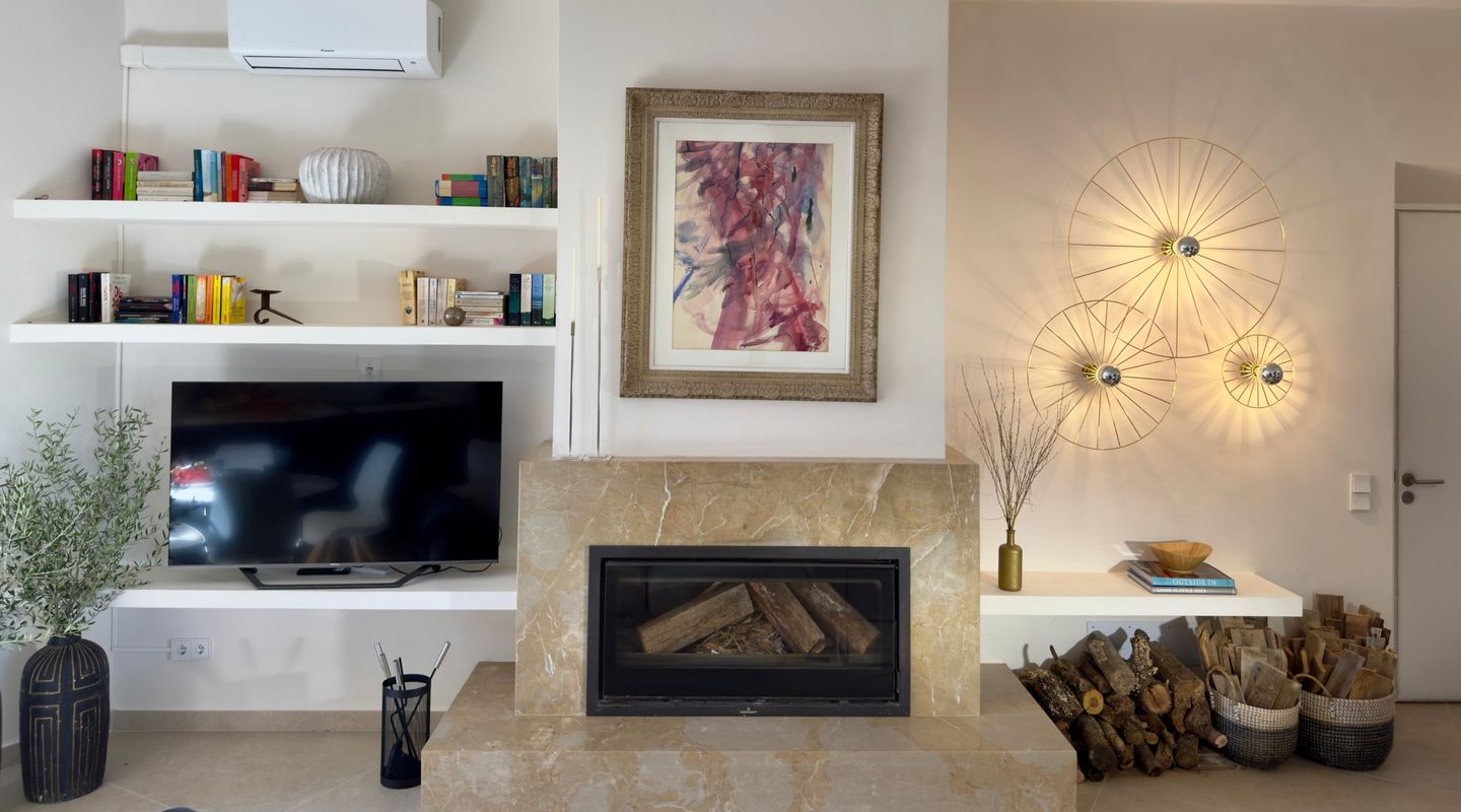 Смежный дом построен на одном уровне и предлагает около 130 м² комфортного жилого пространства. Интерьер светлый и спокойный, гостиная с камином и большими окнами наполняется естественным светом, сохраняя при этом приватность. Кухня полностью оборудована и подходит как для повседневного использования, так и для более длительного проживания.