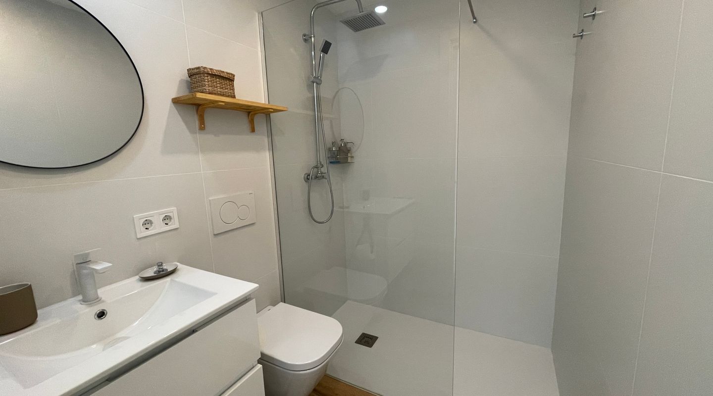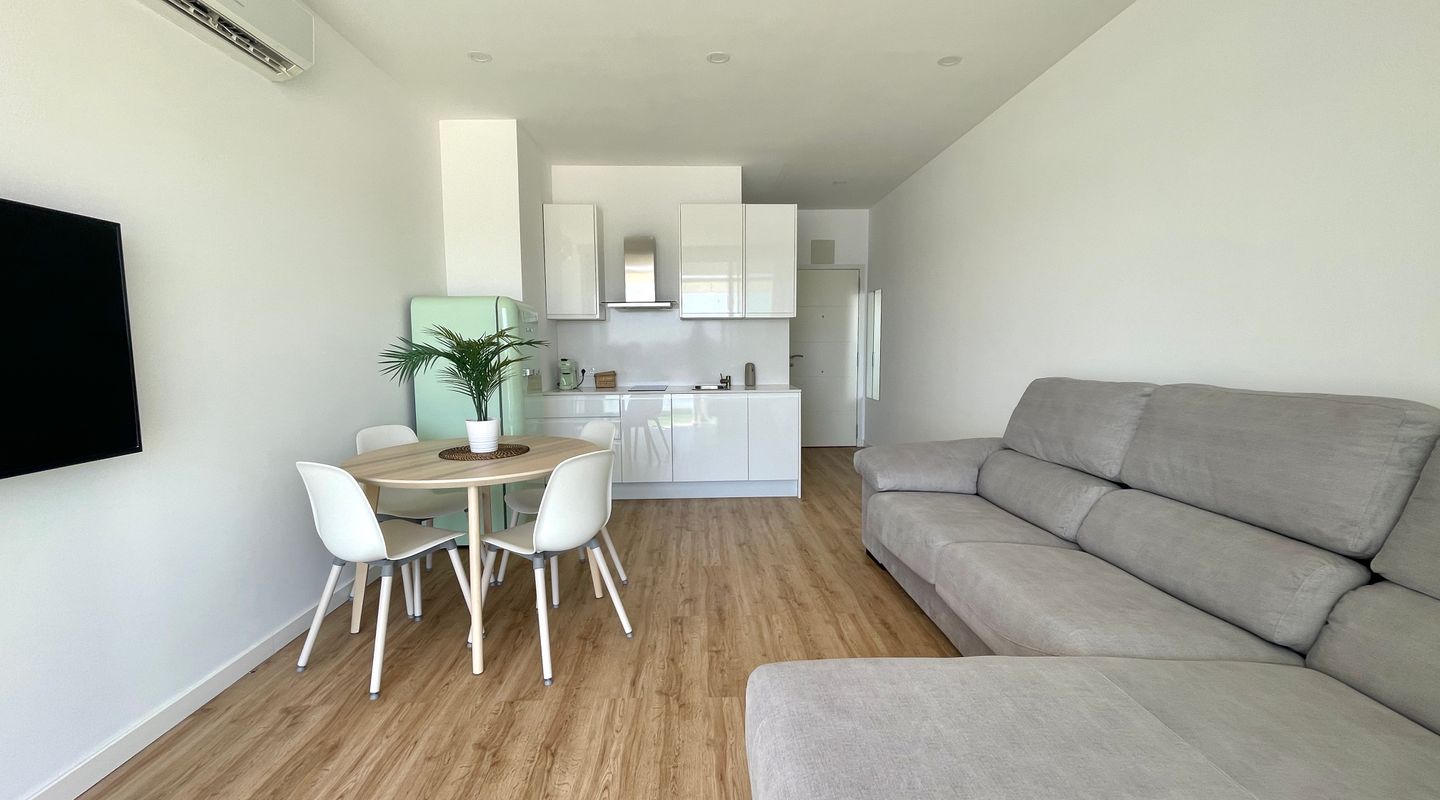 Жильё полностью отремонтировано и готово к заселению: гостиная с открытой и оборудованной кухней, ванная комната, паркетные полы и приватная терраса с видом на пляж, где можно наслаждаться Средиземным морем прямо из дома. Восточная ориентация обеспечивает естественное освещение и уютную атмосферу на протяжении всего дня.