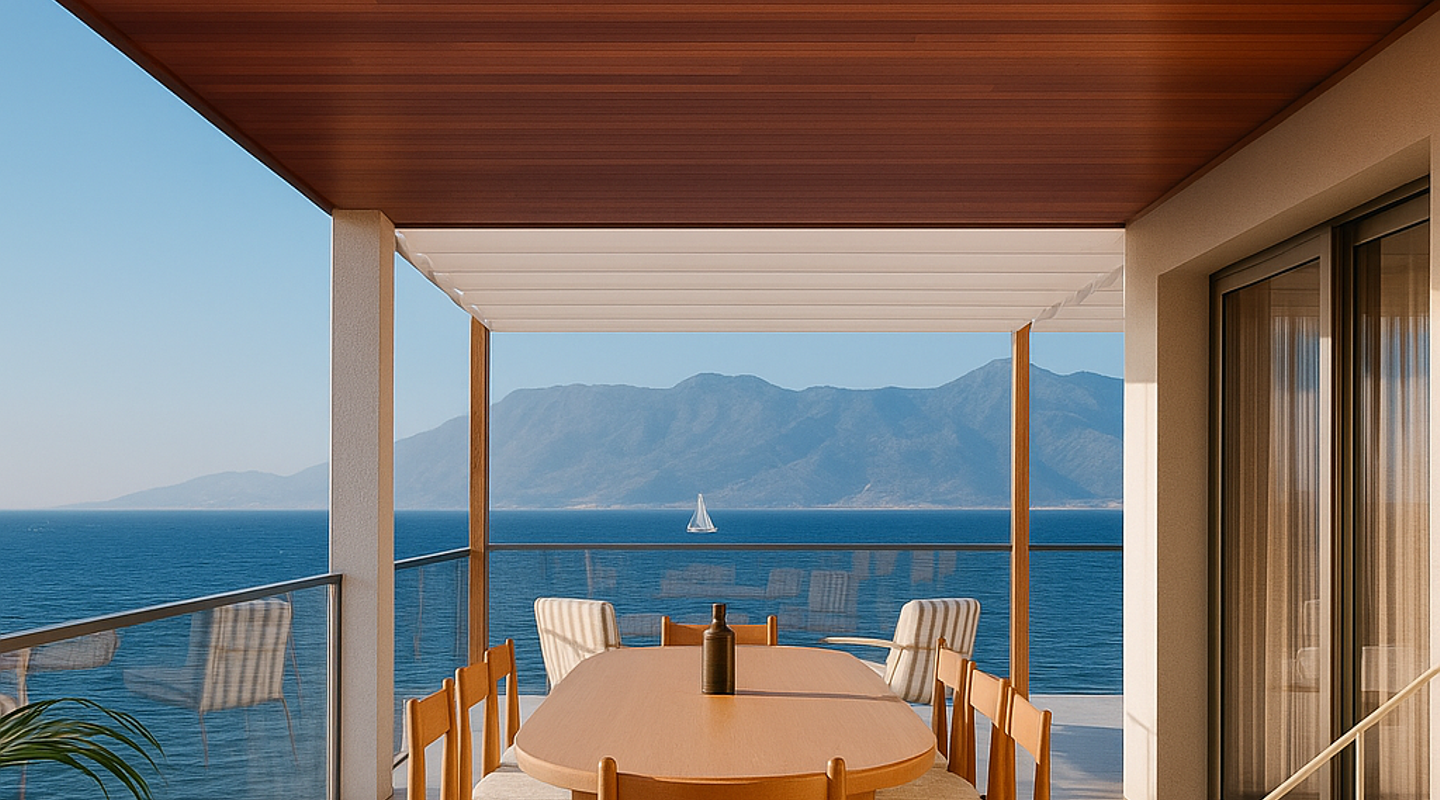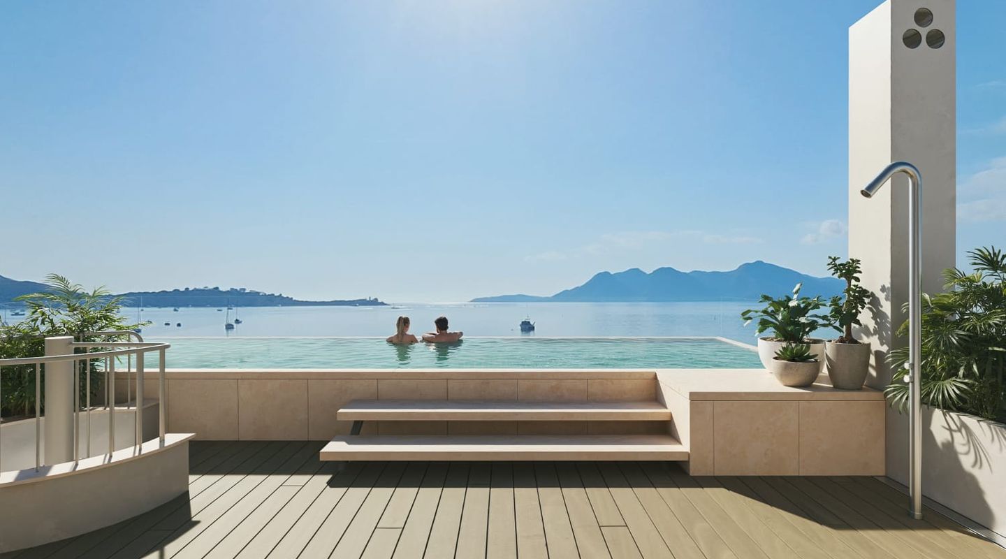 На основном уровне находится крытая терраса, идеально подходящая для трапезы на свежем воздухе с видом на море. Отсюда можно попасть на впечатляющую верхнюю террасу для частного использования, где есть частный бассейн, зона отдыха и встроенная кухня, что создает незабываемое место для релаксации и развлечений с прекрасным видом на море и горы.