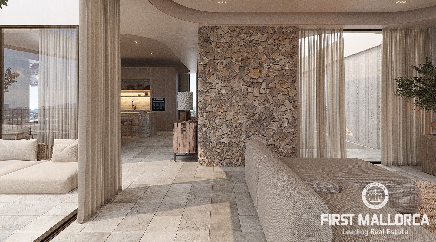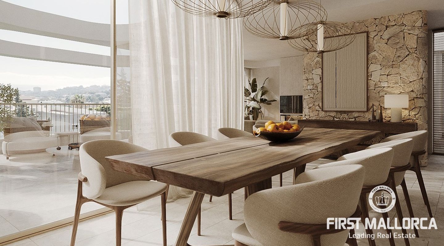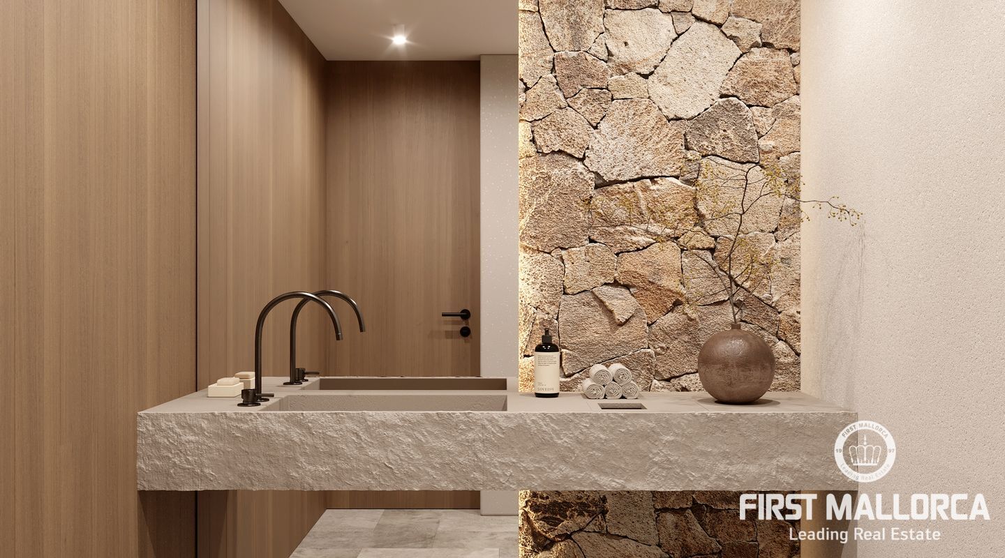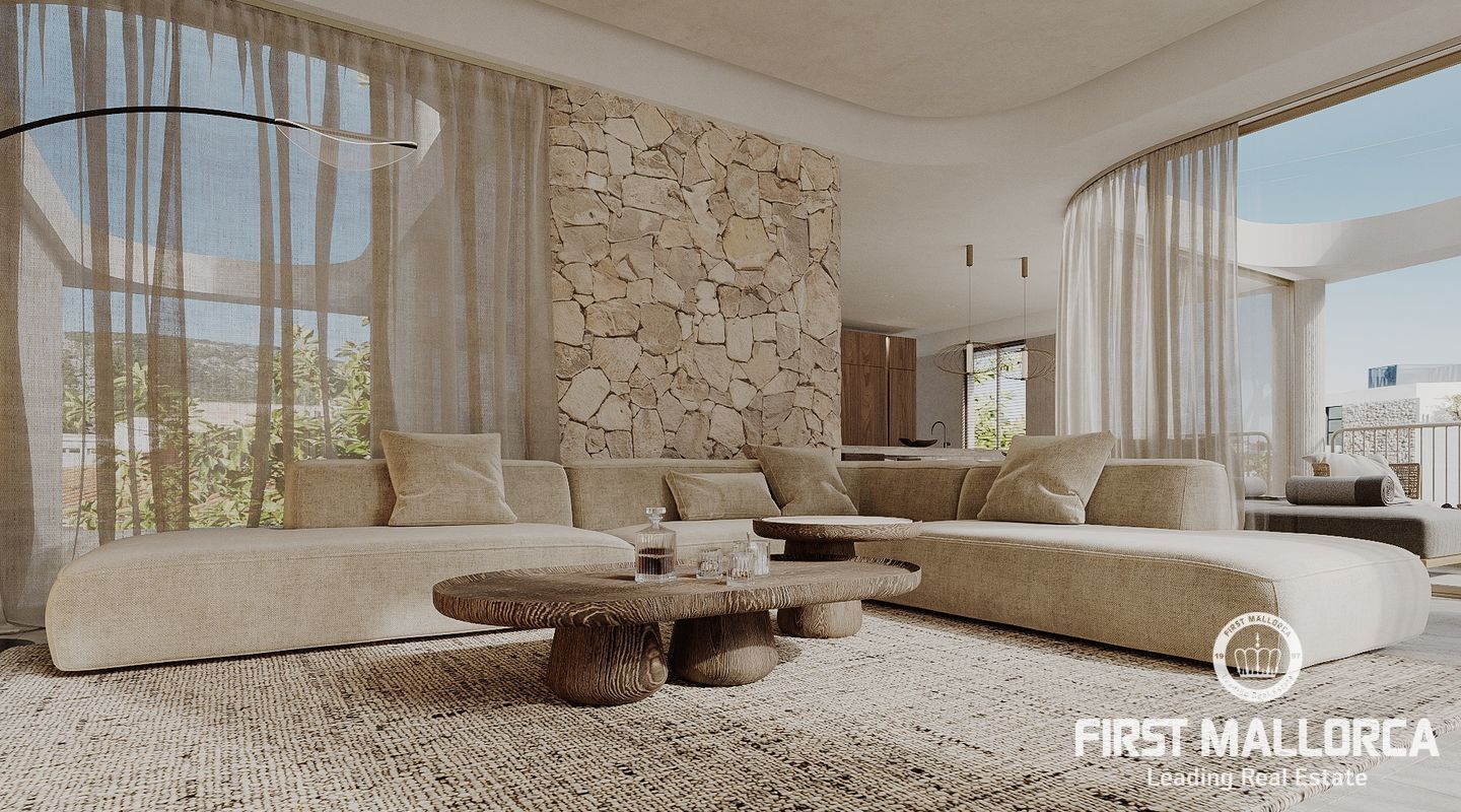 Большие окна наполняют пространство естественным светом, подчёркивая изысканный дизайн, сочетающий тёплую атмосферу Средиземноморья с современной элегантностью благодаря натуральным материалам — дереву и камню.
