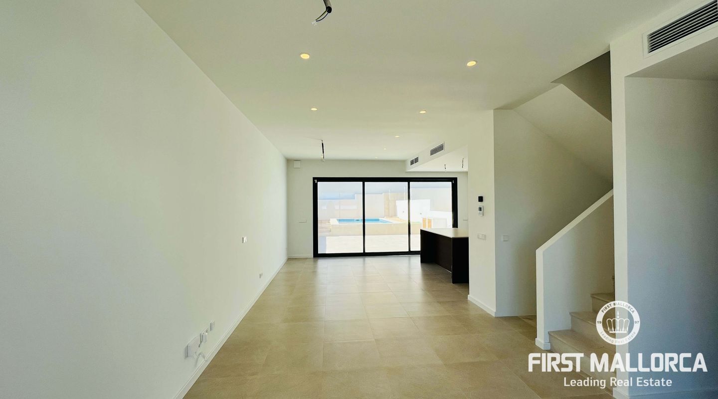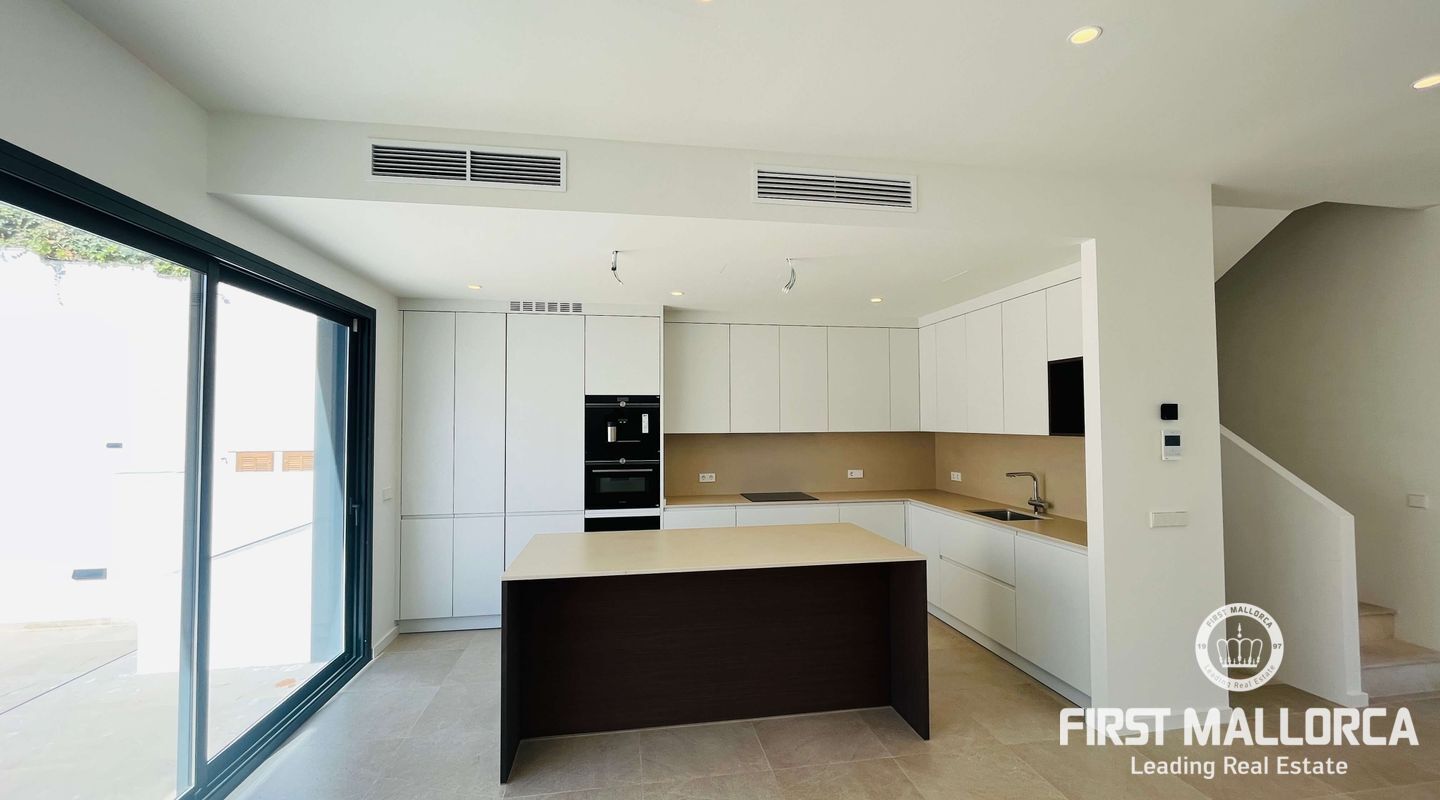 При входе в дом вас встречает открытое фойе, которое плавно переходит в просторную гостиную и столовую, из больших окон которых открывается потрясающий вид на горы Трамунтана и бассейн в задней части дома. Изысканная современная кухня идеально сочетается со столовой.