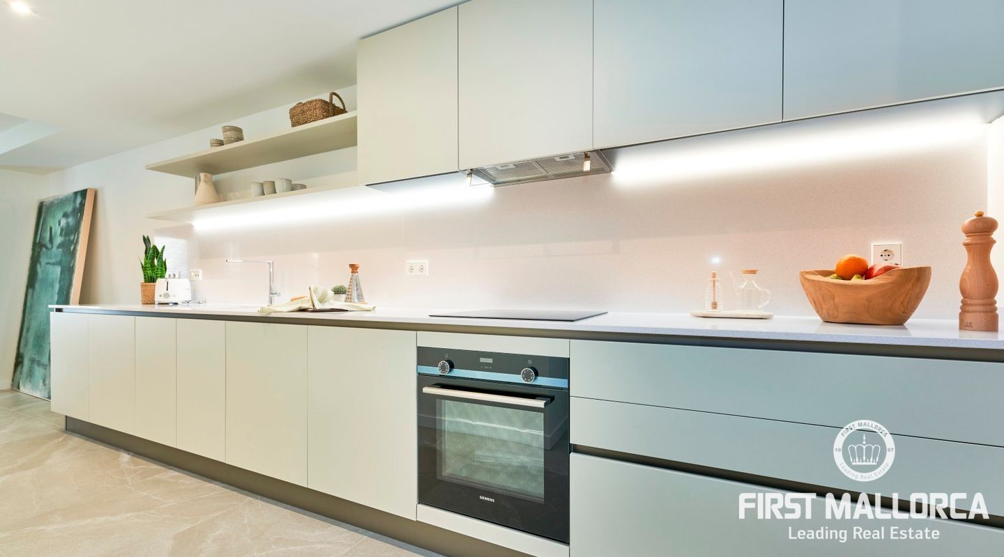Кухня поставляется полностью меблированной и оборудованной электроприборами, духовкой, индукционной плитой и вытяжкой.